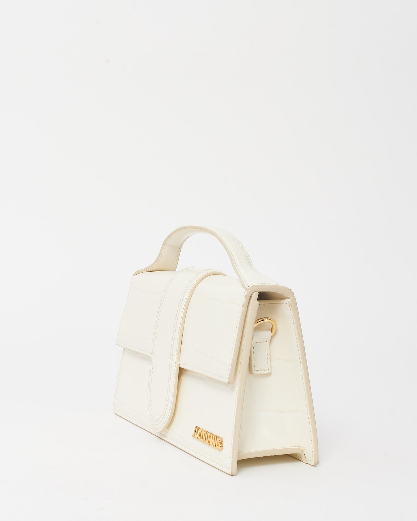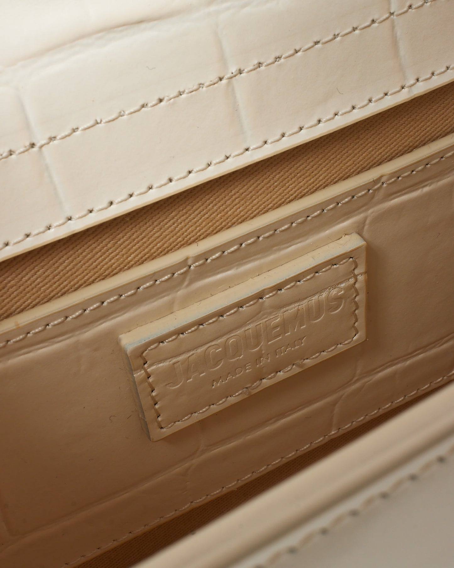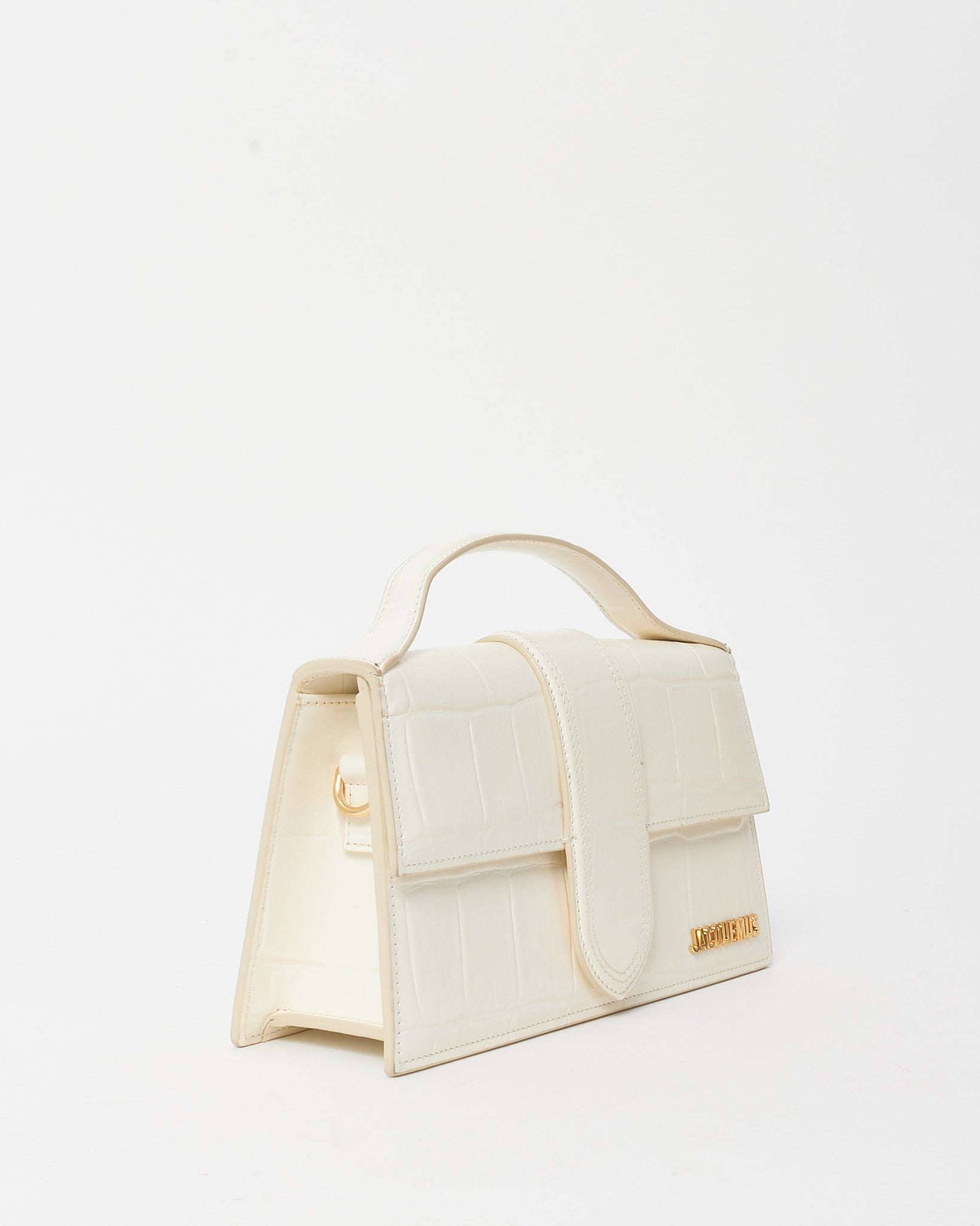 Minimalist with a sculptural twist, this pre-owned authentic Jacquemus Le Grand Bambino Bag is crafted in glossy off-white croc-embossed leather. Featuring the signature top handle, structured silhouette, and gold-tone logo detail, it offers compact elegance with a detachable strap for crossbody styling.