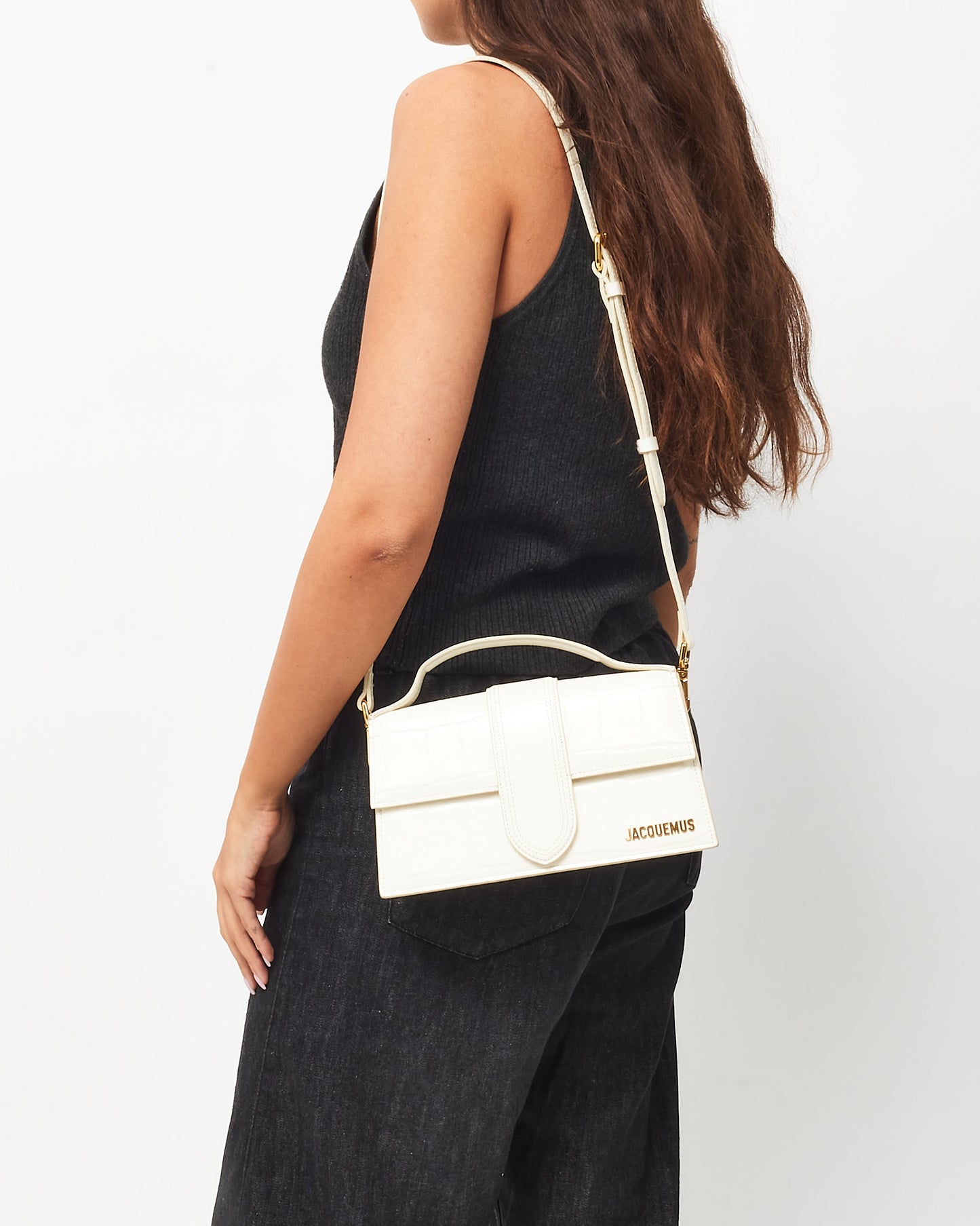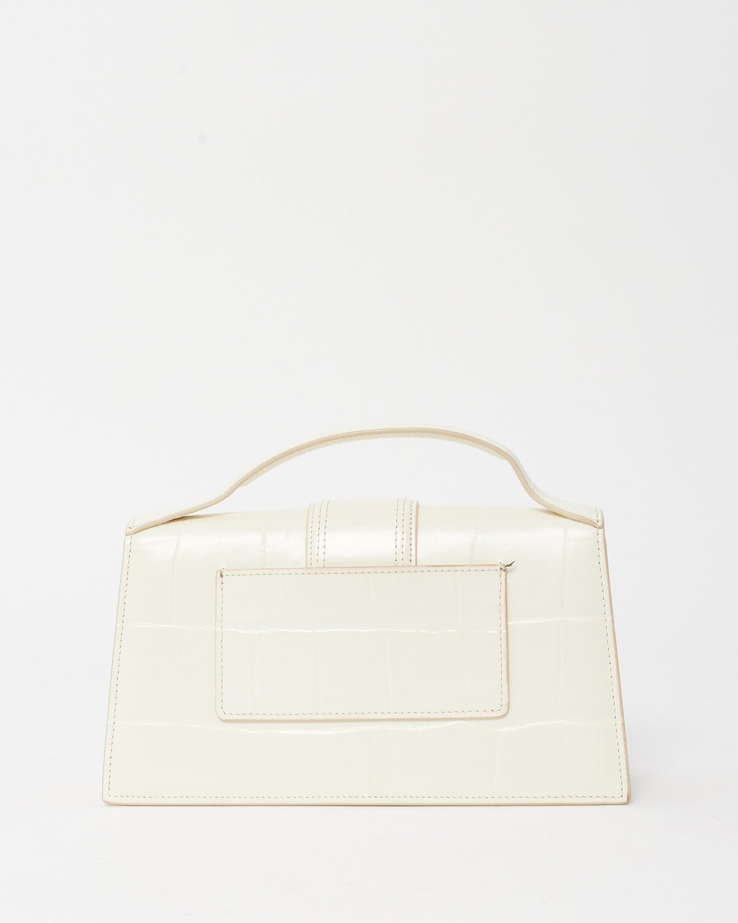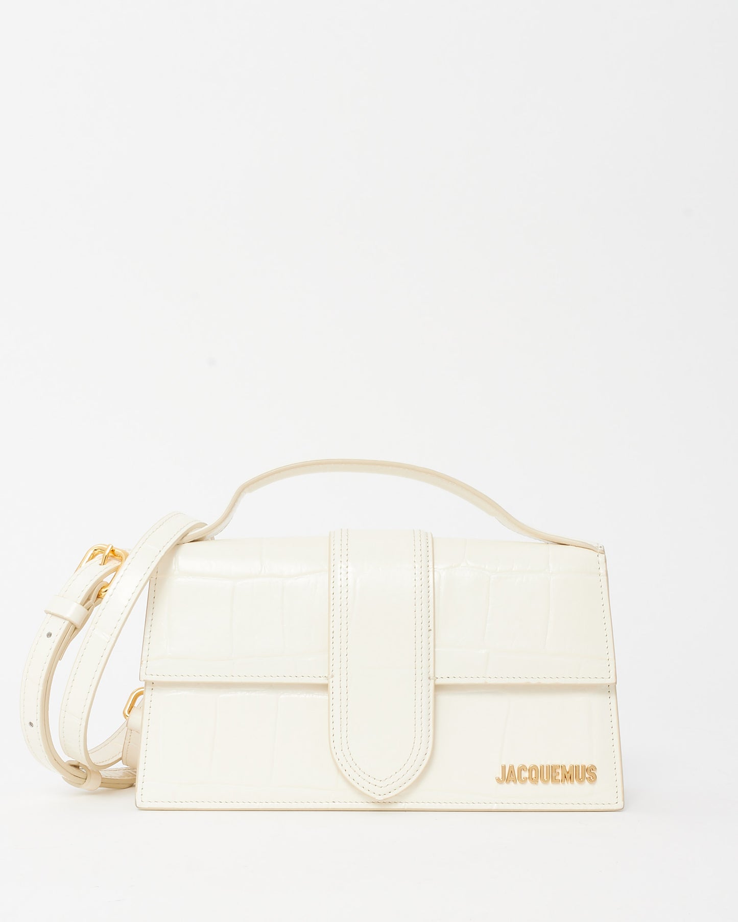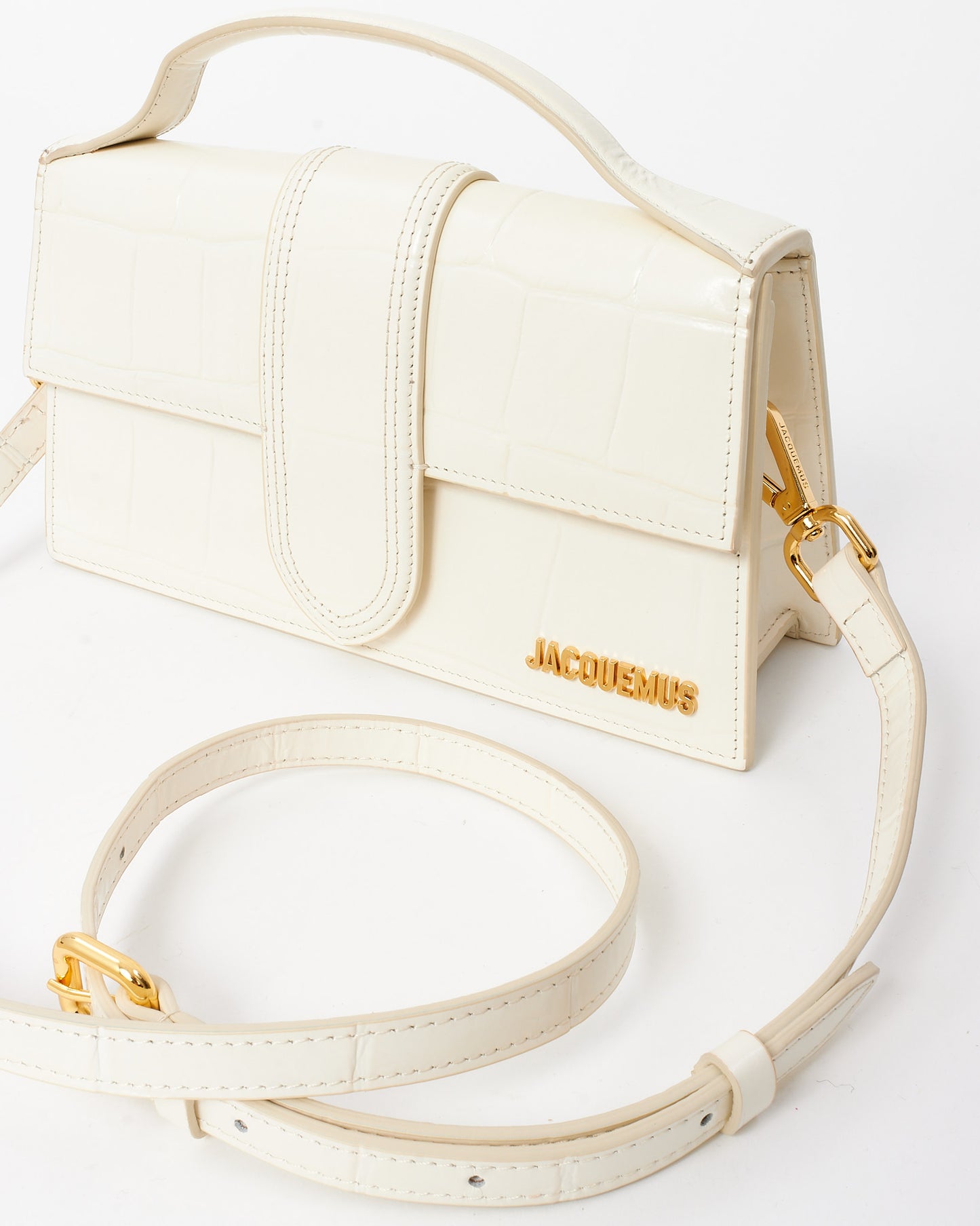 Minimalist with a sculptural twist, this pre-owned authentic Jacquemus Le Grand Bambino Bag is crafted in glossy off-white croc-embossed leather. Featuring the signature top handle, structured silhouette, and gold-tone logo detail, it offers compact elegance with a detachable strap for crossbody styling.