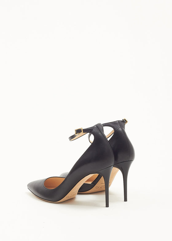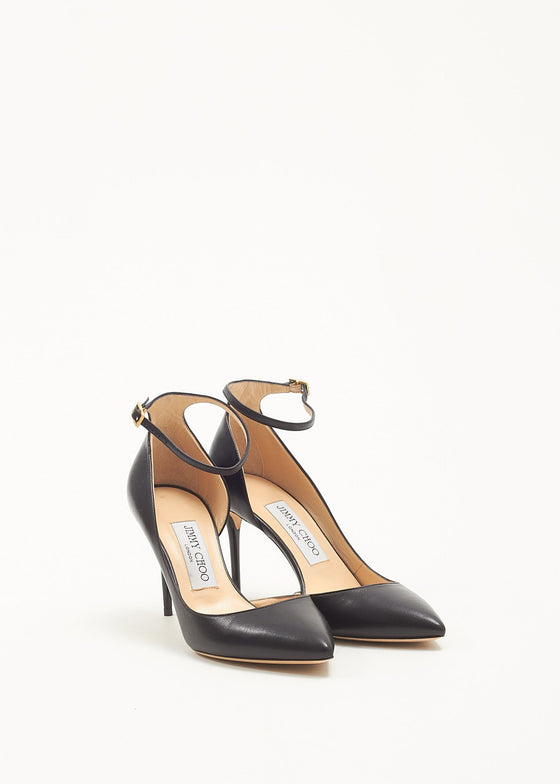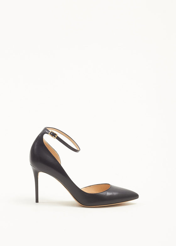 Black Leather Pointed Toe Ankle Strap Pumps - 36.5