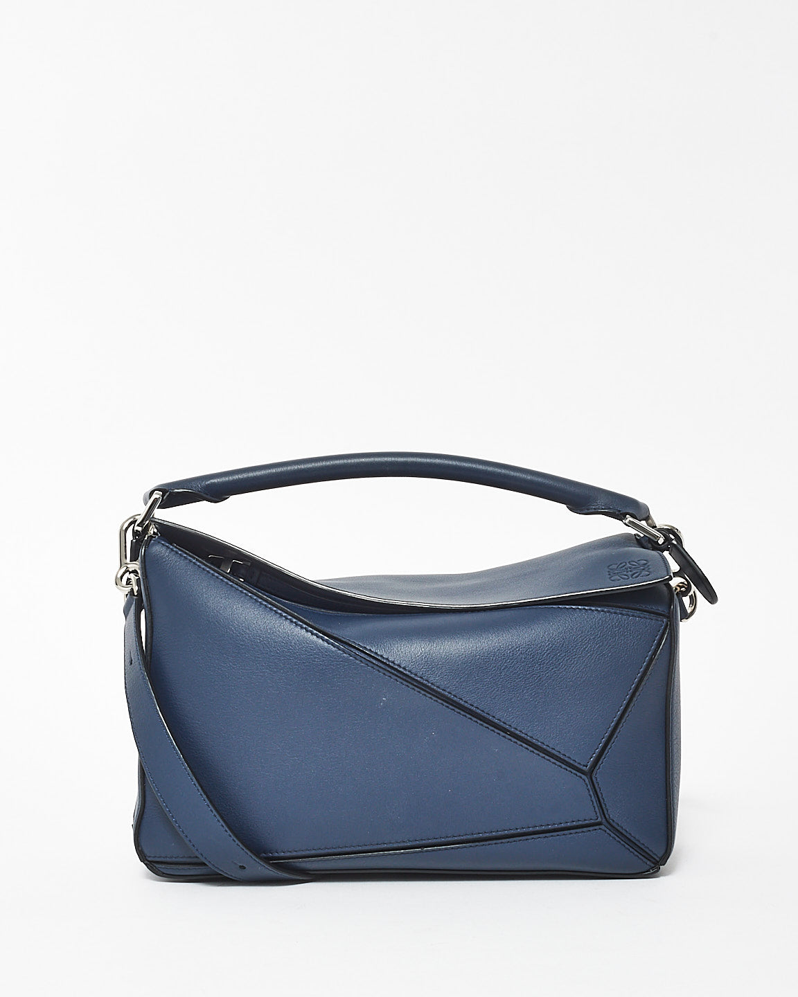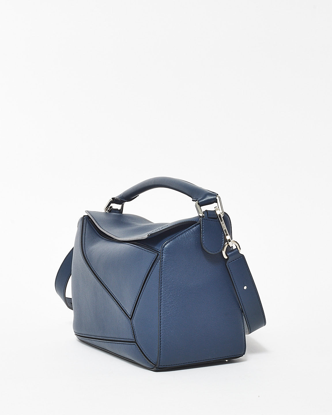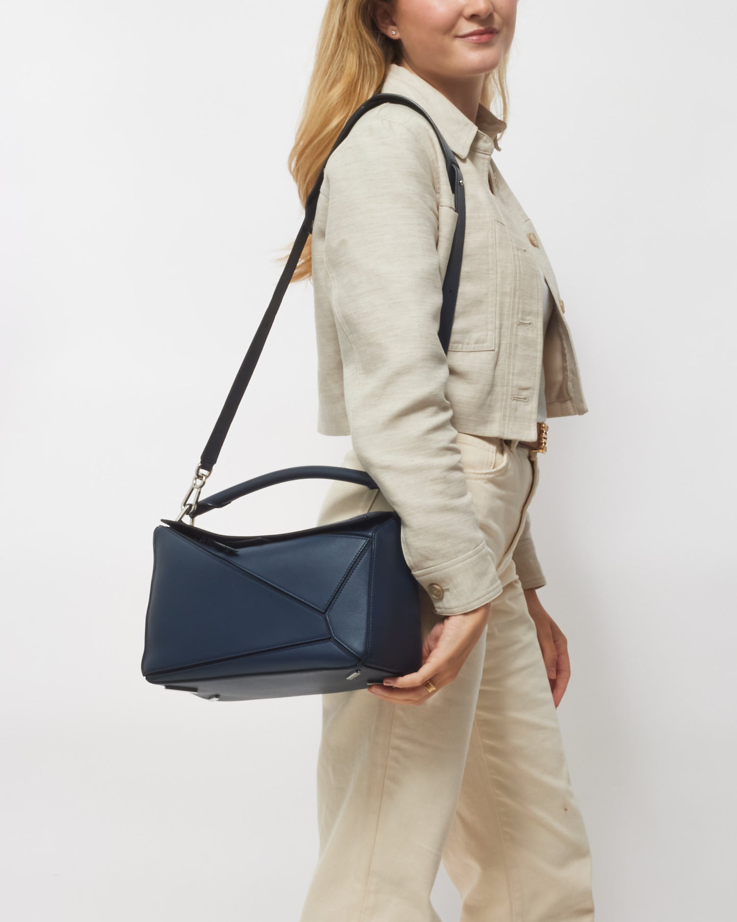 Explore Loewe's exquisite collection of handbags, featuring this certified pre-owned Navy Blue Leather Medium (Classic) Puzzle Bag. Embodying timeless elegance and modern sustainability, each piece, including favorites like this, is authenticated by Retyche. Discover sustainable luxury — shop our current treasures or find inspiration for your next coveted find.