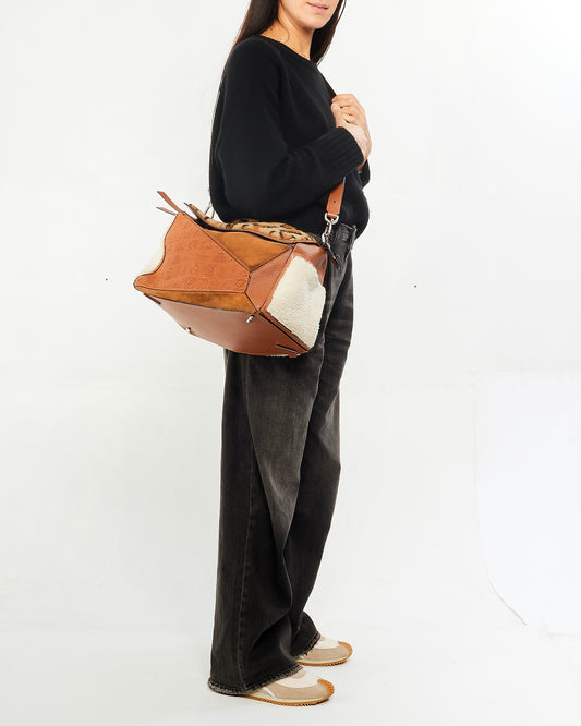 Tan Monogram Leather & Suede/Fur Chain Large Puzzle Bag