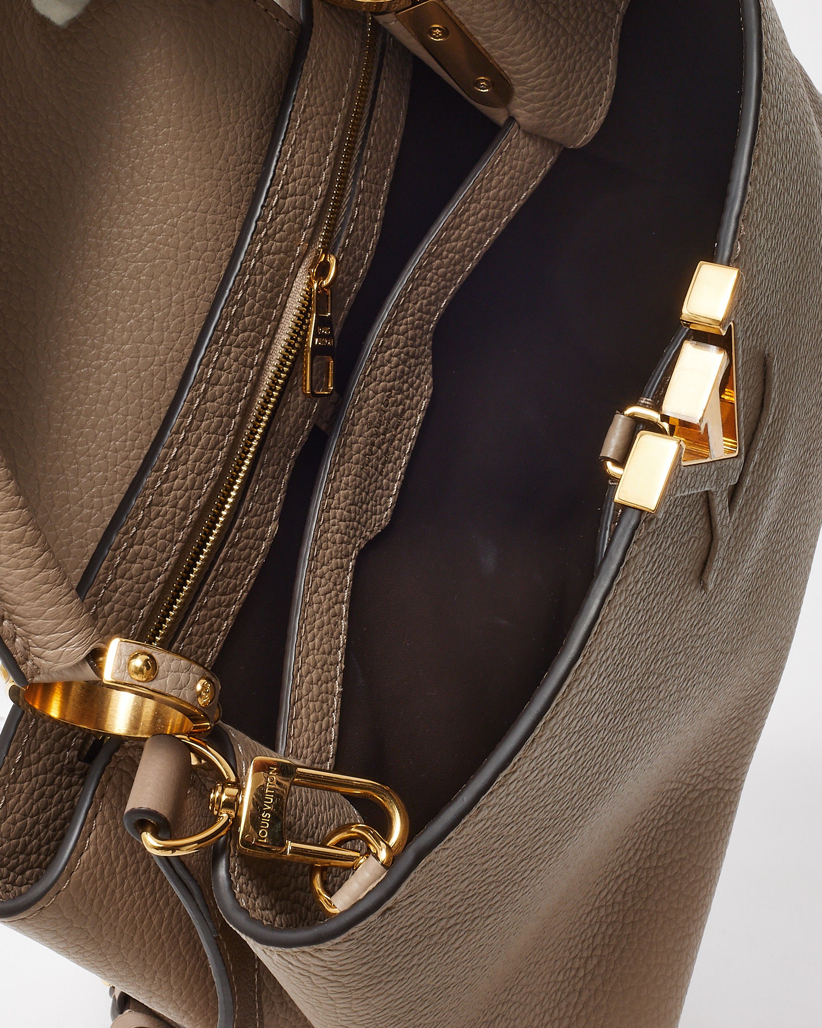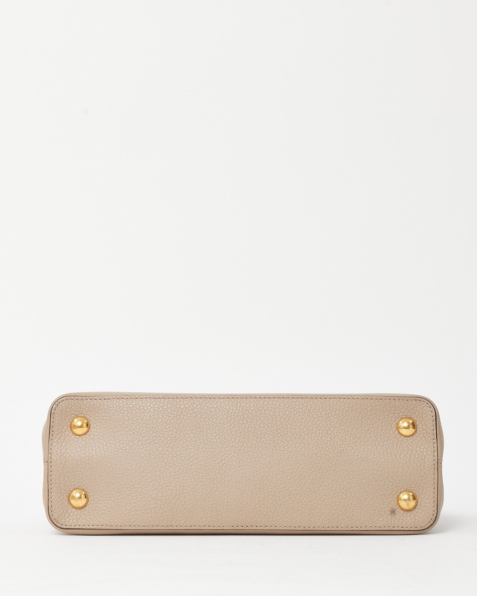 Elevated in both structure and craftsmanship, this pre-loved authentic Louis Vuitton Capucines MM bag is a refined expression of modern luxury. Crafted from supple beige Taurillon leather and accented with tonal leather lining and gold-tone hardware, it features the iconic LV initials and a signature top flap that can be styled in or out. The spacious interior is divided for organization, while the rolled leather top handle and removable shoulder strap offer versatile carrying options. A timeless silhouette for everyday elegance or polished professional edits.