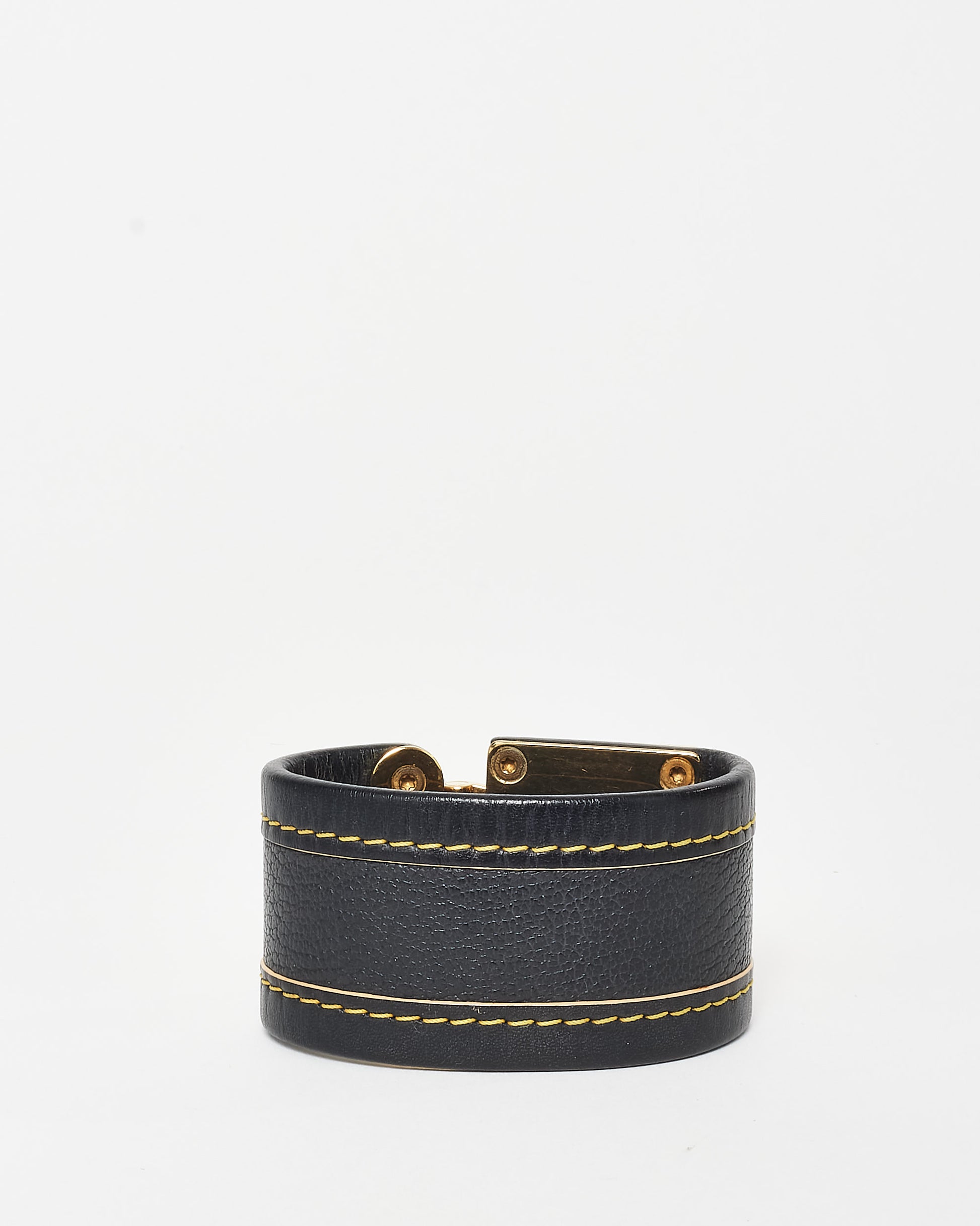 Experience luxury with this 100% authentic pre-owned Louis Vuitton Black Suhali Leather S Lock Gold Cuff. Crafted from premium Suhali leather, this elegant bracelet features a striking S-lock design in gold-toned hardware. The perfect blend of sophistication and edge, it's a statement piece that transcends seasons. Shop authentic pre-owned jewelry now at RETYCHE to add this iconic Louis Vuitton accessory to your collection