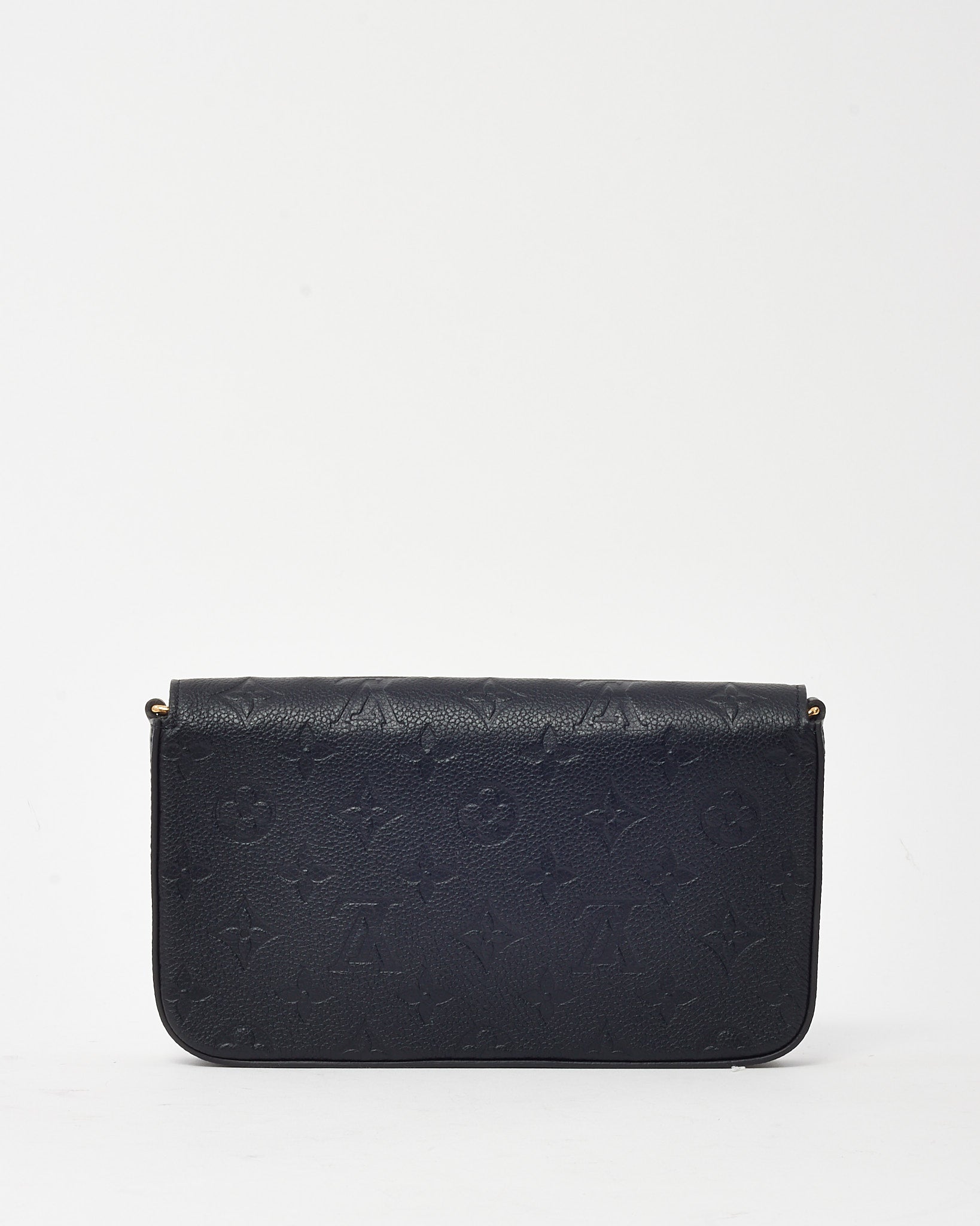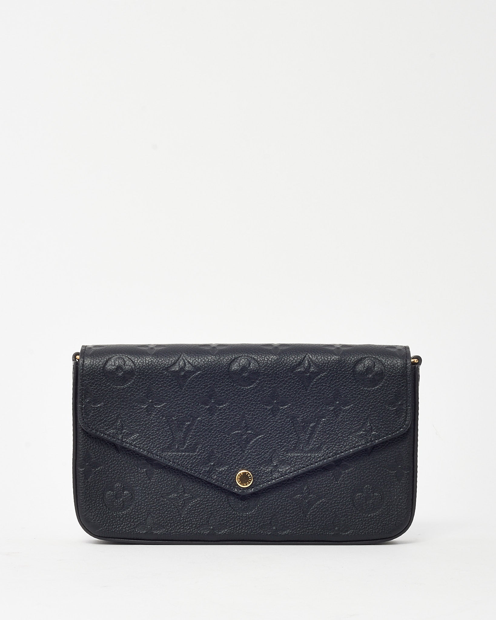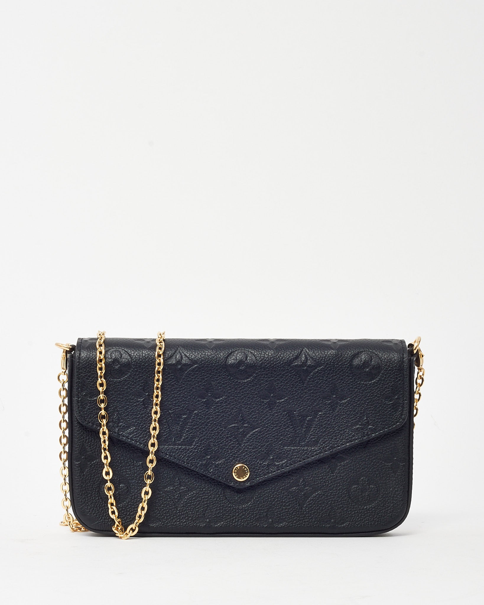 Refined and versatile, this pre-loved authentic Louis Vuitton Felicie Pochette is crafted in luxurious black Monogram Empreinte leather with embossed LV motifs for a subtle yet distinctive look. Designed with a sleek envelope silhouette, it features a gold-tone snap closure, removable chain strap, and practical interior inserts for cards and essentials. Perfect as a chic crossbody or clutch, this compact bag transitions seamlessly from day to night, offering both timeless style and everyday function.