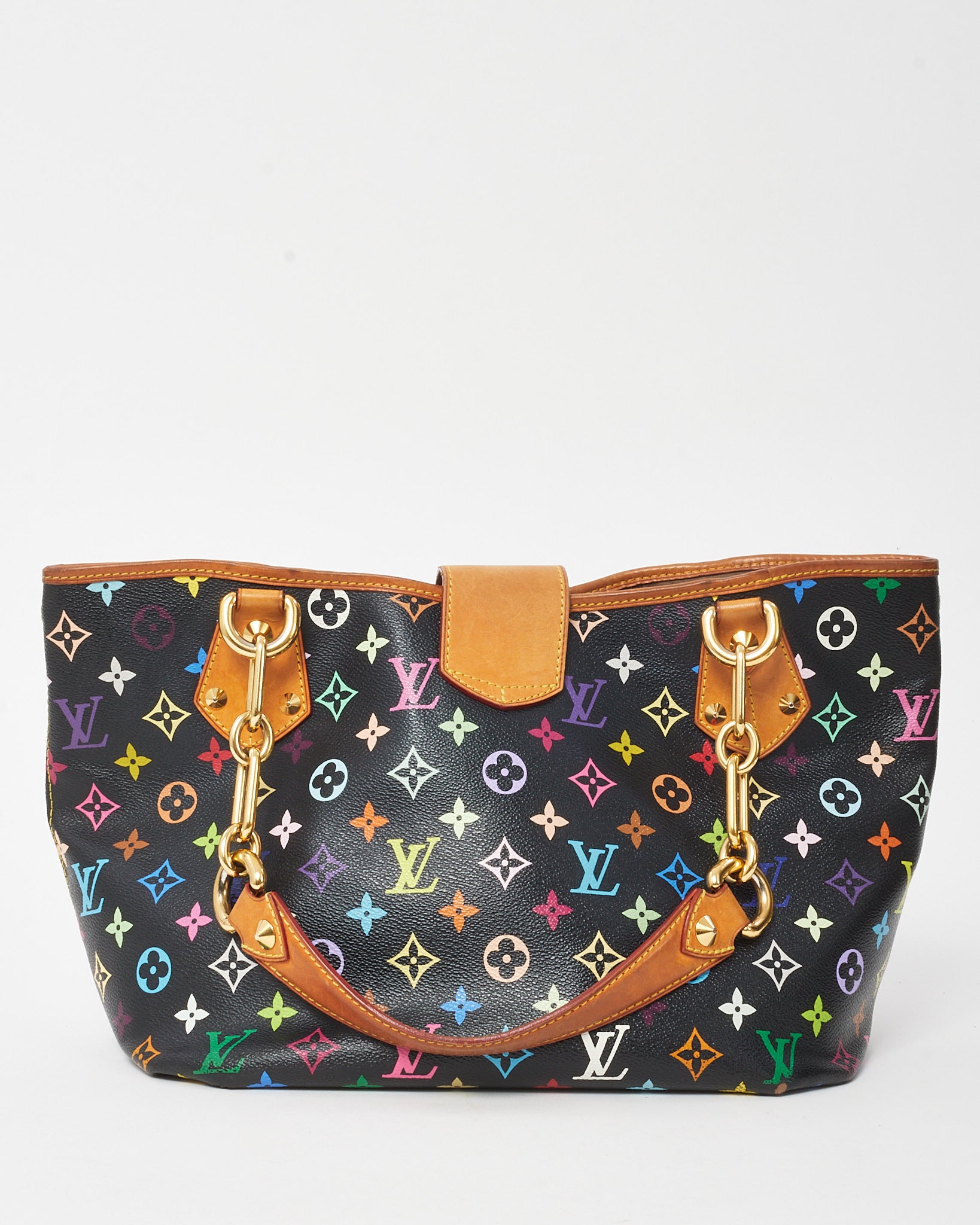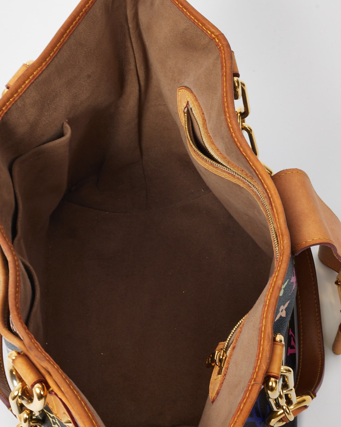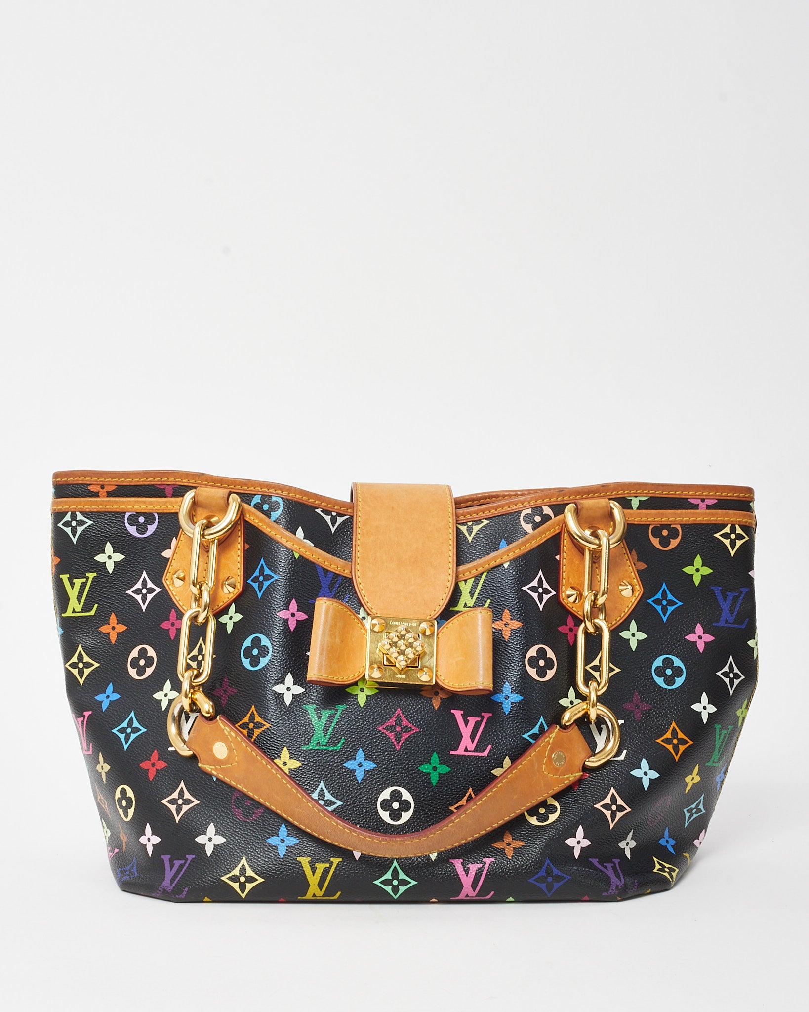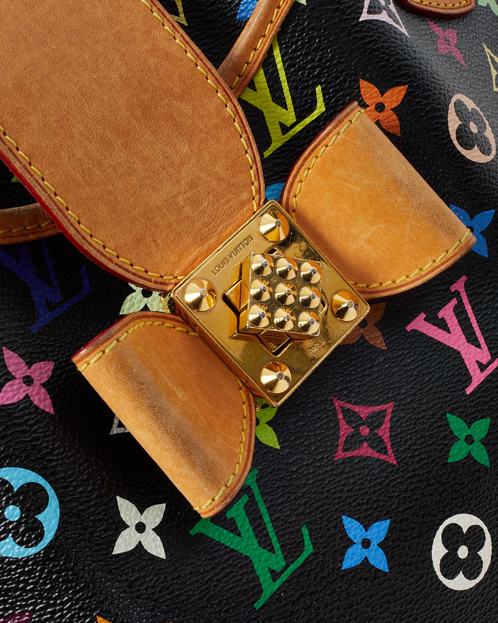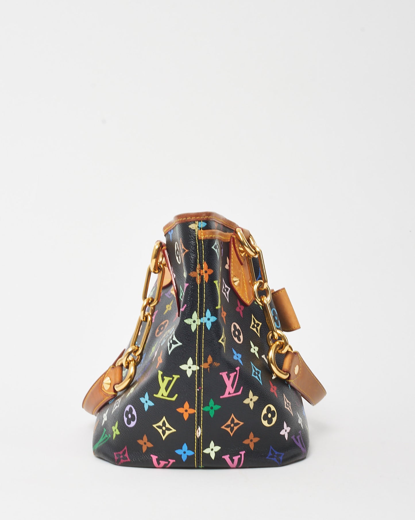 Playful and bold with a Y2K edge, this pre-owned authentic Louis Vuitton Annie GM Shoulder Bag is crafted from black monogram multicolor canvas, a cult-favorite collaboration between Louis Vuitton and artist Takashi Murakami. Natural Vachetta leather trim and gold-tone studded hardware add a polished, statement finish to the structured silhouette.