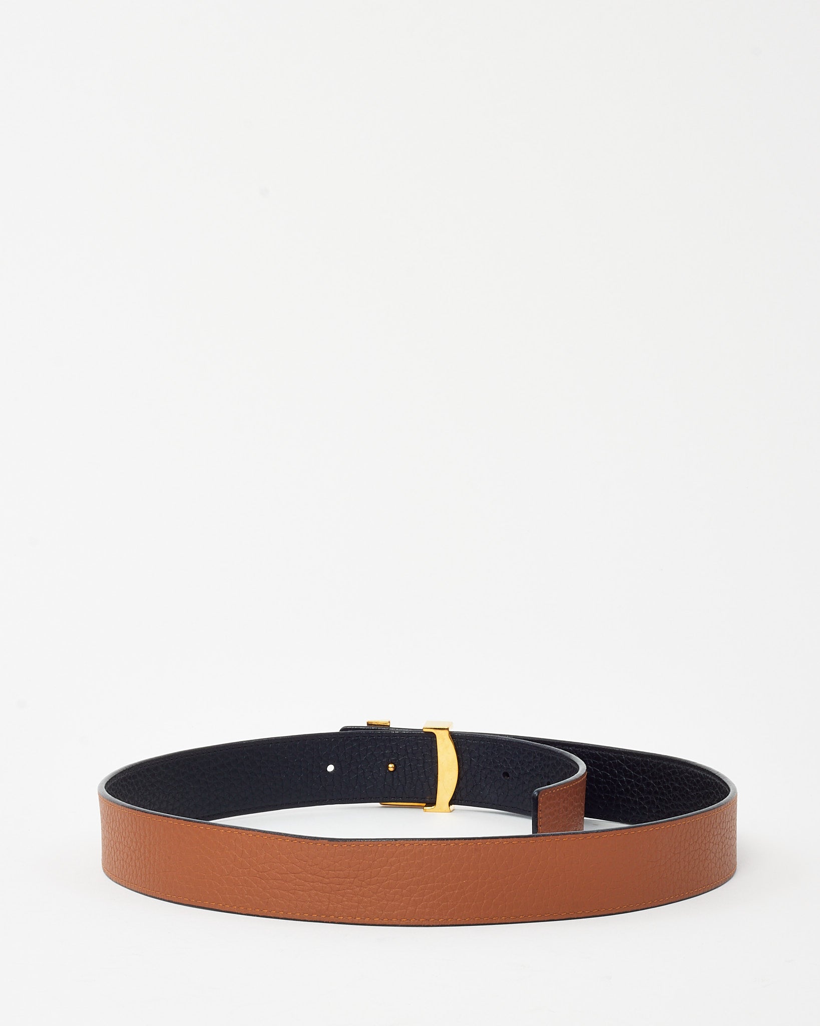 Elevate your accessories collection with this pre-loved authentic Louis Vuitton Brown and Black Grained Calf Leather Reversible LV Initiales 30MM Belt in size 75/30. Crafted from supple calfskin leather, this versatile belt showcases a dual-sided design—classic brown on one side and sleek black on the other—offering two looks in one. The bold gold-tone LV Initiales buckle makes a luxurious statement, perfect for accenting denim or tailored trousers with timeless designer flair. A refined wardrobe staple that seamlessly transitions from day to evening.