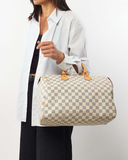 Explore Louis Vuitton's exquisite collection of handbags, featuring this certified pre-owned Damier Azur Coated Canvas Speedy 35. Embodying timeless elegance and modern sustainability, each piece, including favorites like this, is authenticated by Retyche. Discover sustainable luxury — shop our current treasures or find inspiration for your next coveted find.
