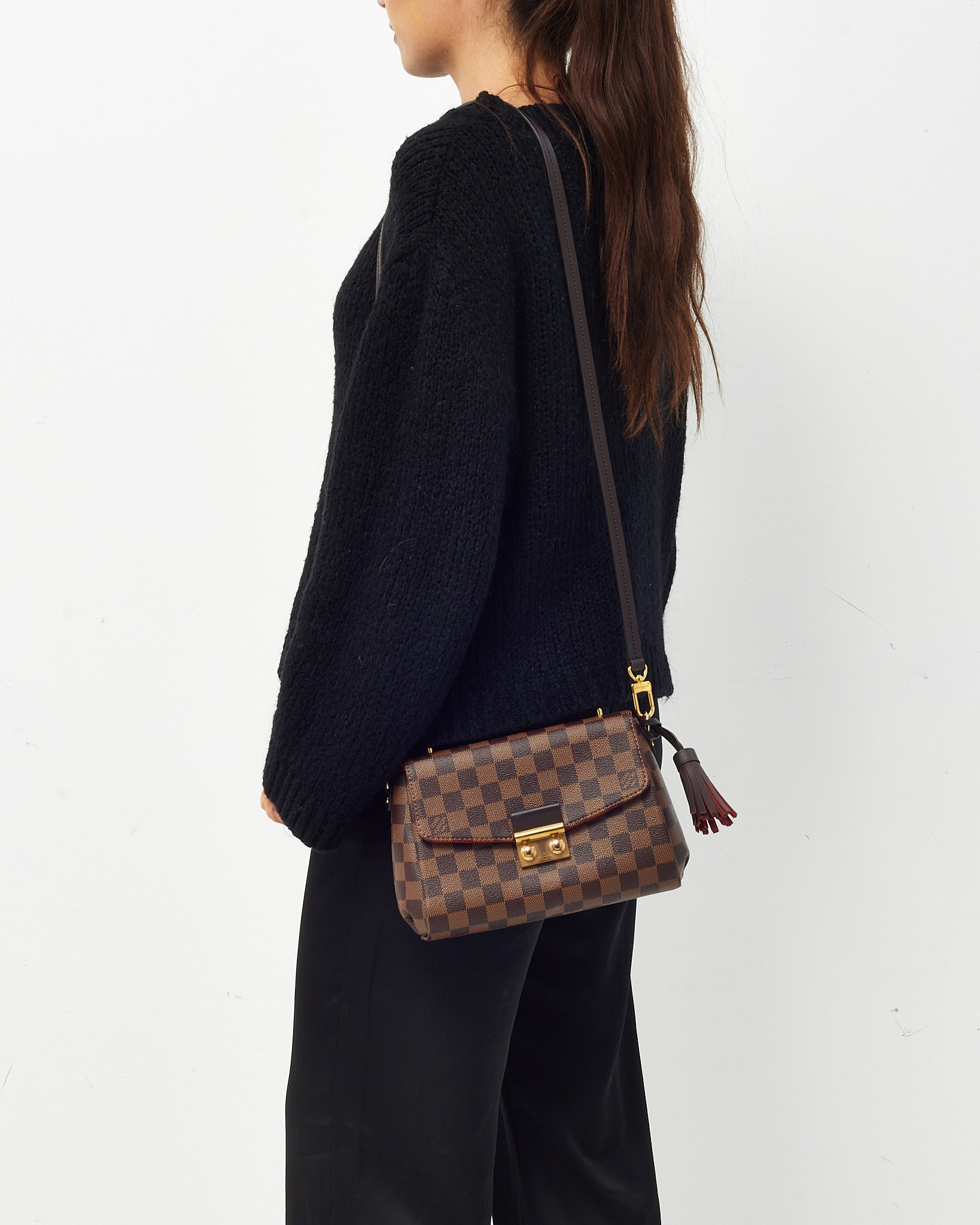 Chic and compact, this pre-loved authentic Louis Vuitton Croisette bag in Damier Ebene canvas is the perfect day-to-night accessory. Featuring a structured silhouette with a signature gold-tone S-lock closure, it blends classic elegance with modern functionality. The top handle and removable crossbody strap offer versatile styling, while the playful tassel accent adds a subtle touch of charm. Ideal for carrying daily essentials, this timeless piece is crafted in Louis Vuitton’s signature coated canvas with refined leather trim for lasting sophistication.