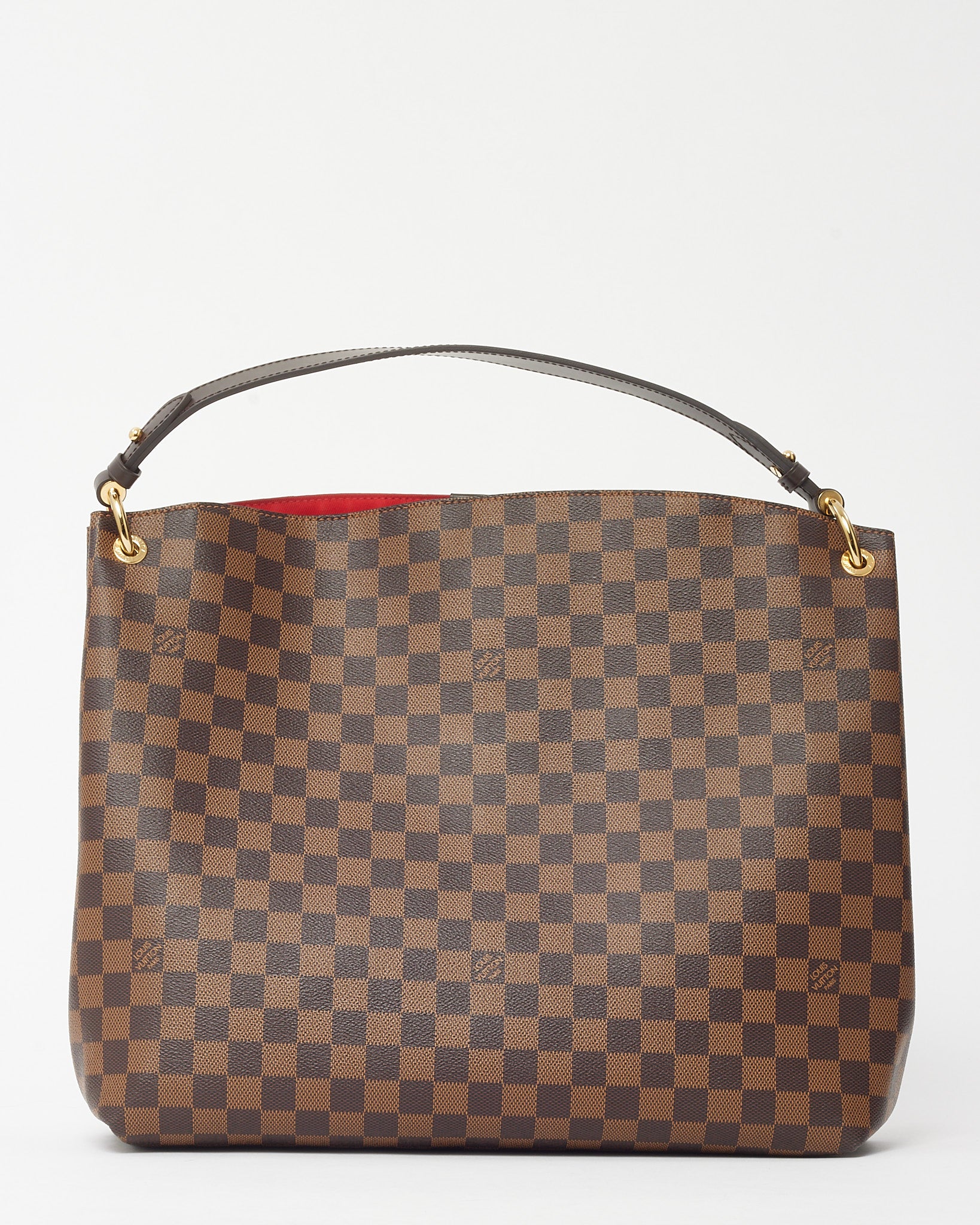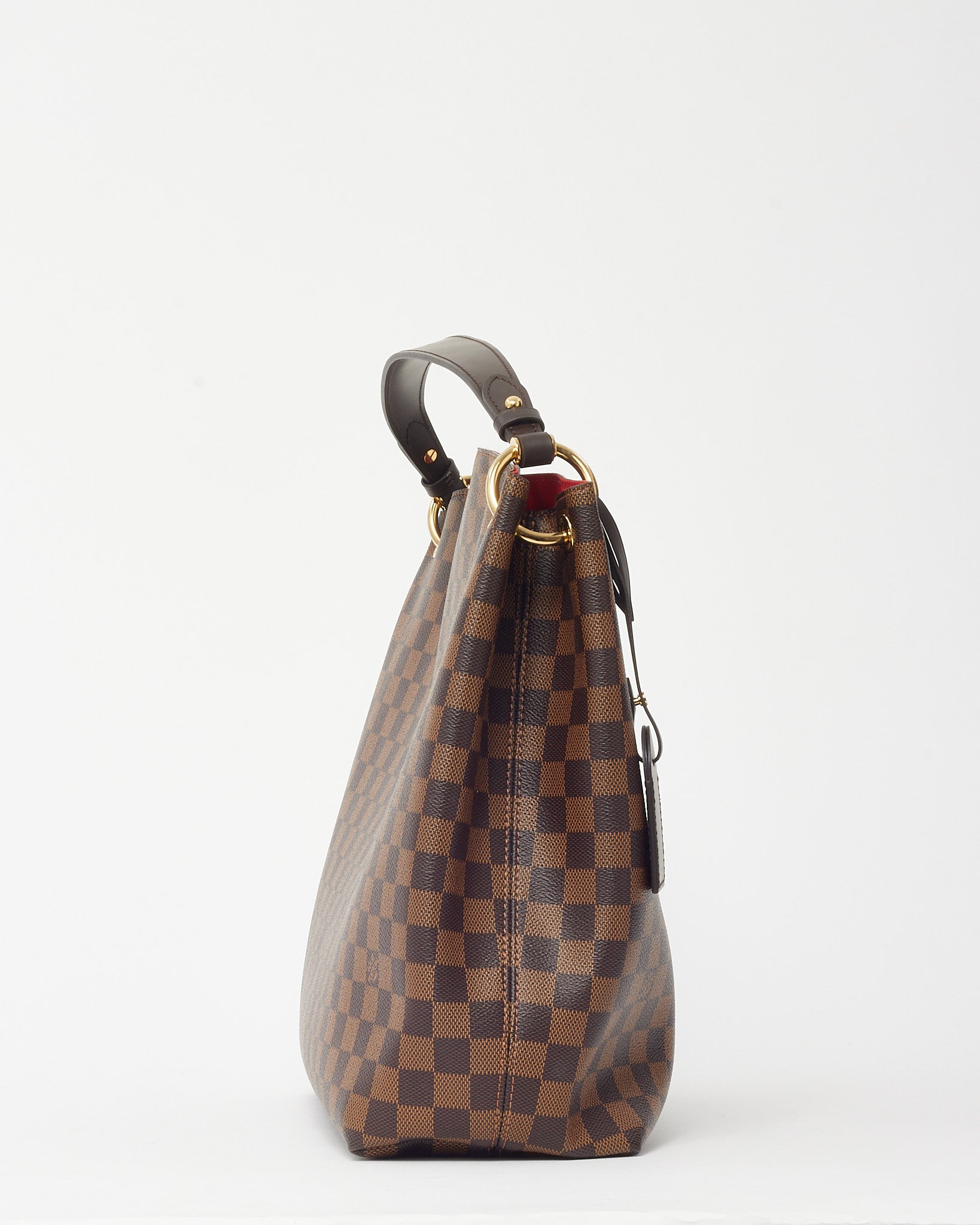 Elegant and versatile, this pre-loved authentic Louis Vuitton Damier Ebene Coated Canvas Graceful MM Shoulder Bag combines timeless style with practical functionality. Crafted from signature Damier Ebene coated canvas and accented with smooth brown leather trim, it features a softly structured silhouette, gold-tone hardware, and a flat shoulder strap for comfortable wear. The spacious interior with a secure magnetic closure makes it ideal for everyday use. A sophisticated Louis Vuitton classic that adds effortless polish to any ensemble.