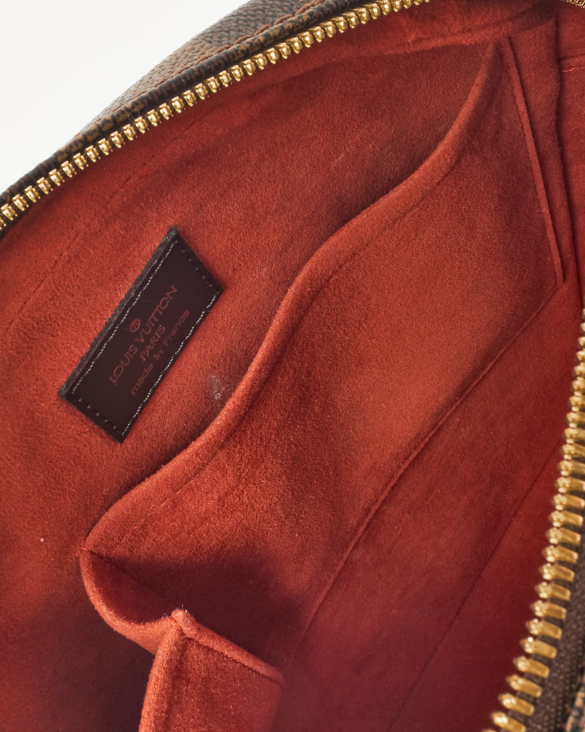 The top zip closure opens to a spacious red fabric-lined interior with a slip pocket for essentials, while the adjustable leather shoulder strap ensures a tailored fit for hands-free ease. Finished with gold-tone hardware and a subtle Louis Vuitton logo patch, it’s a chic and practical piece ideal for city days or travel.