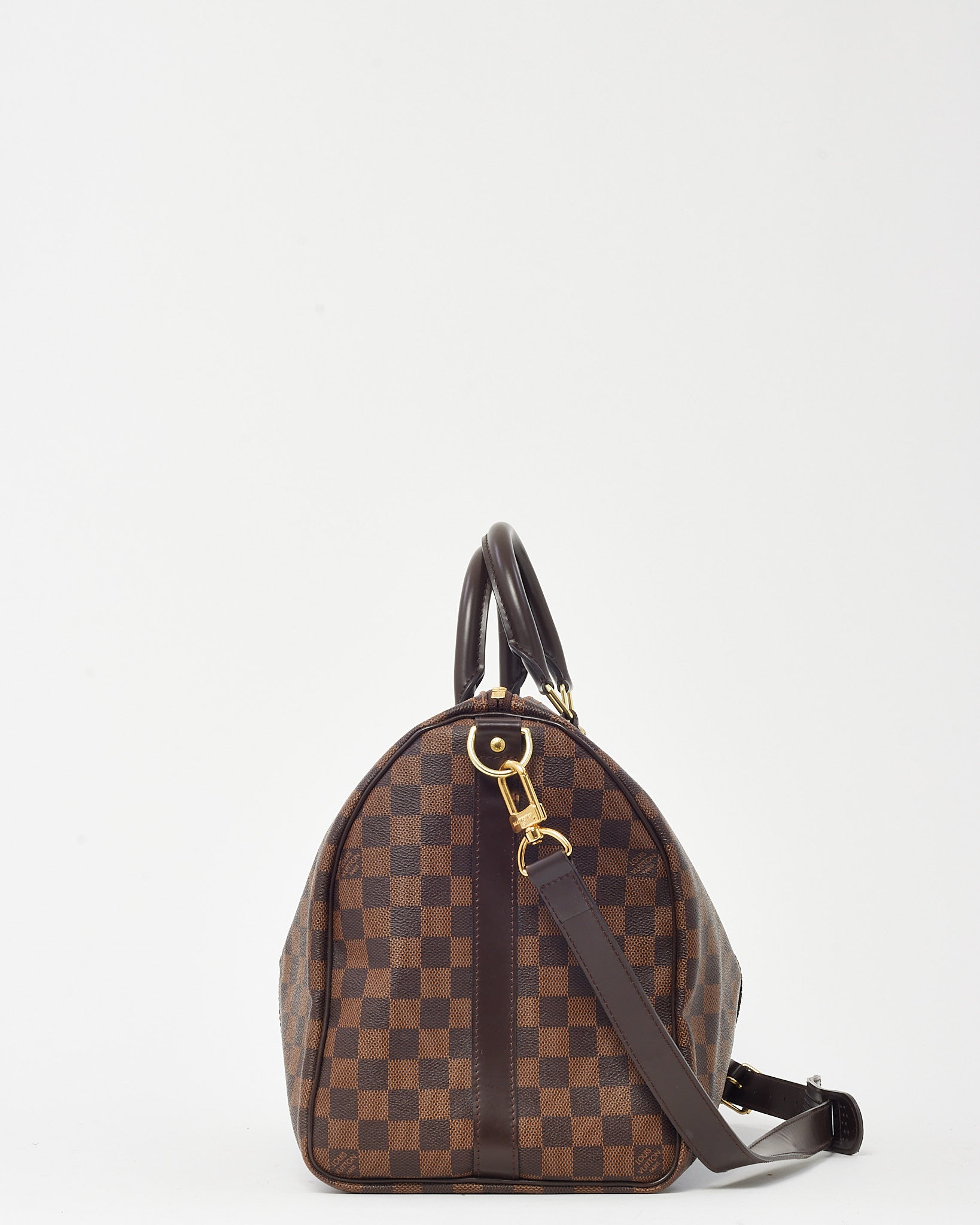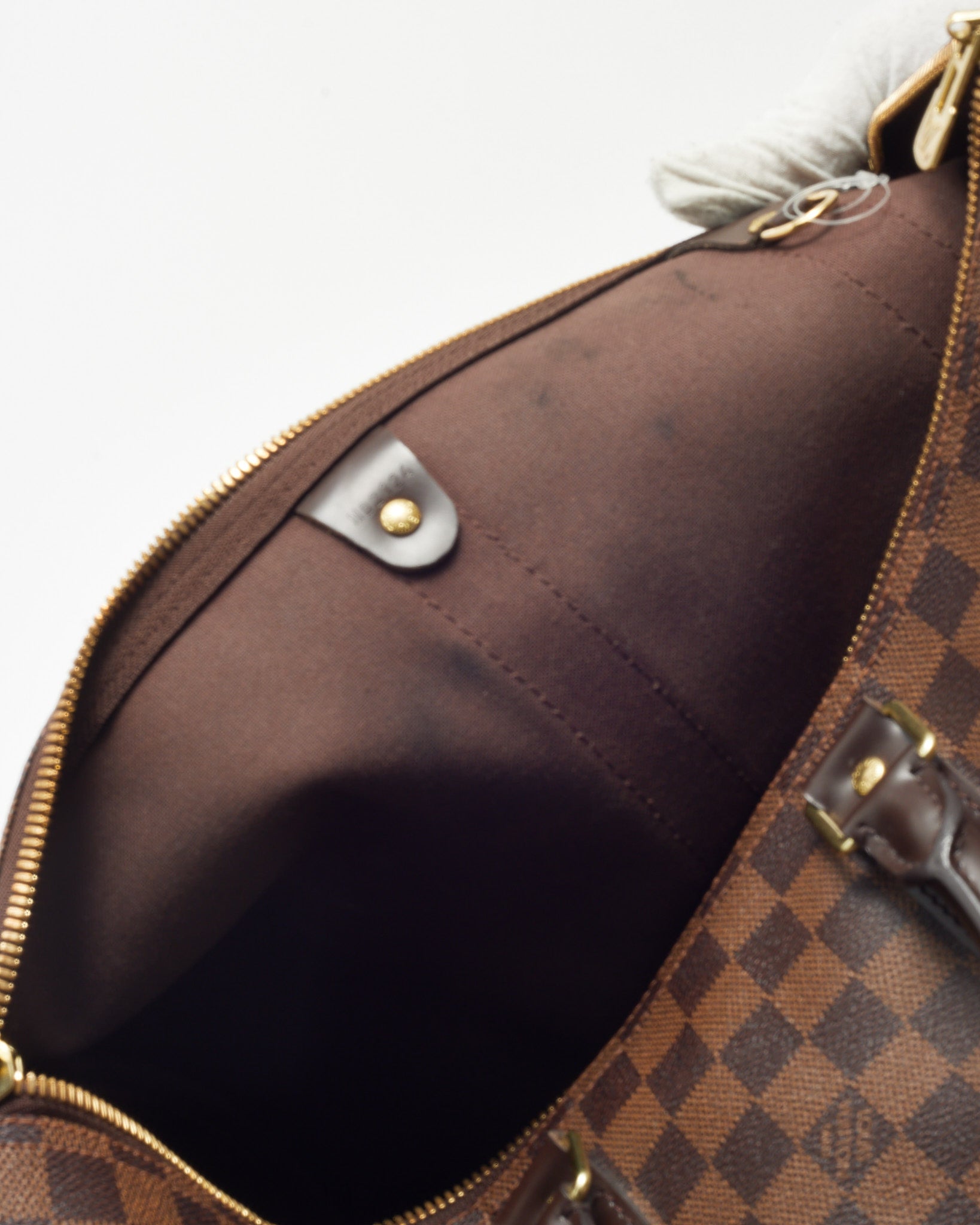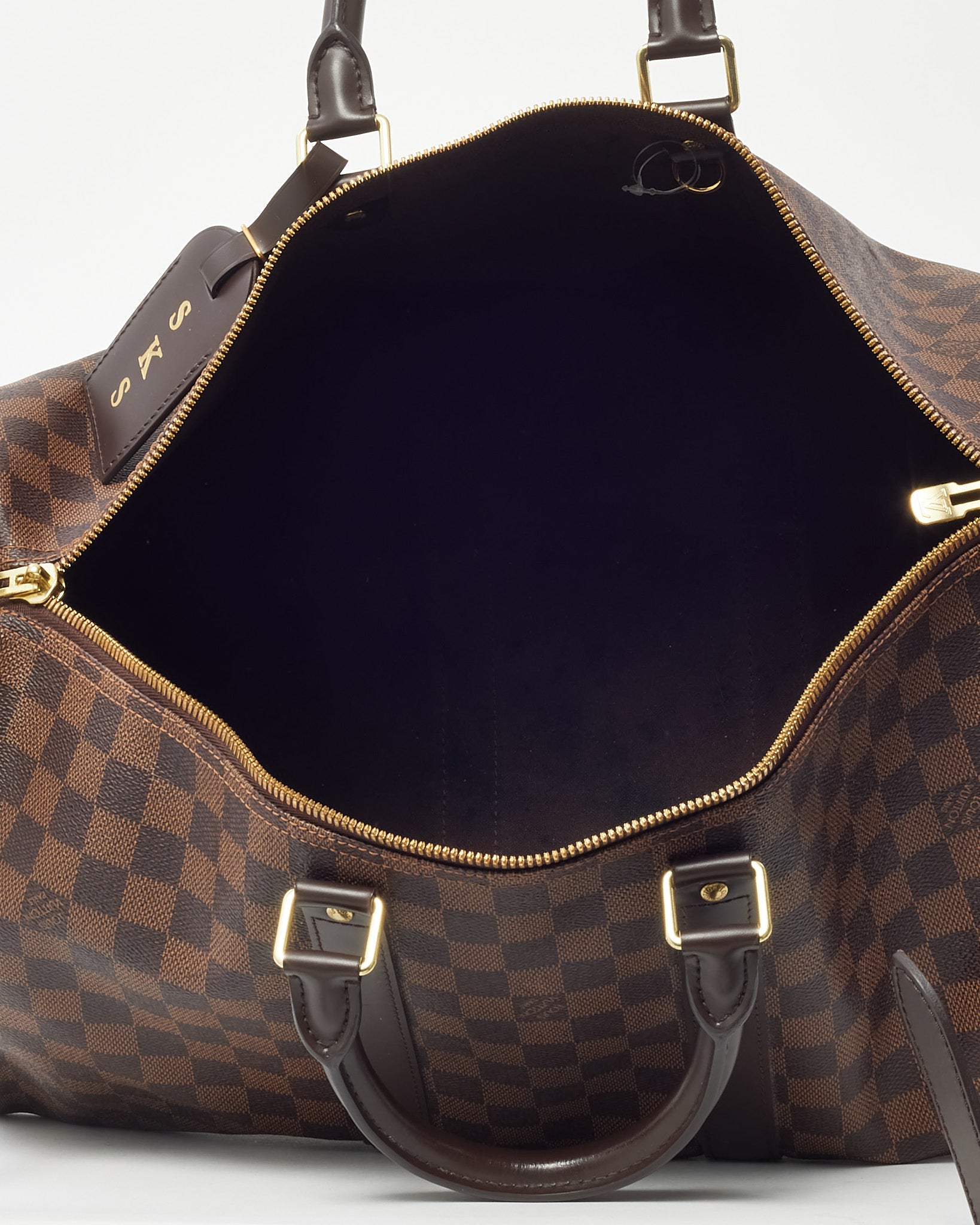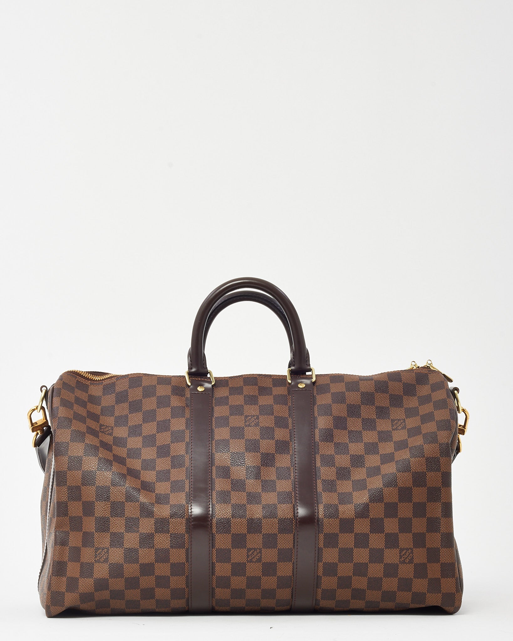 Travel in timeless style with this pre-loved authentic Louis Vuitton Damier Ebene Coated Canvas Keepall Bandoulière 45. Sized perfectly for short trips or weekend getaways, this iconic duffle bag is crafted in durable canvas with natural cowhide leather trim and features polished gold-tone hardware. The top zip opens to a spacious interior, while the adjustable shoulder strap offers hands-free ease. Finished with initials for a personalized touch (can be removed), this travel essential blends heritage luxury with practical design.
