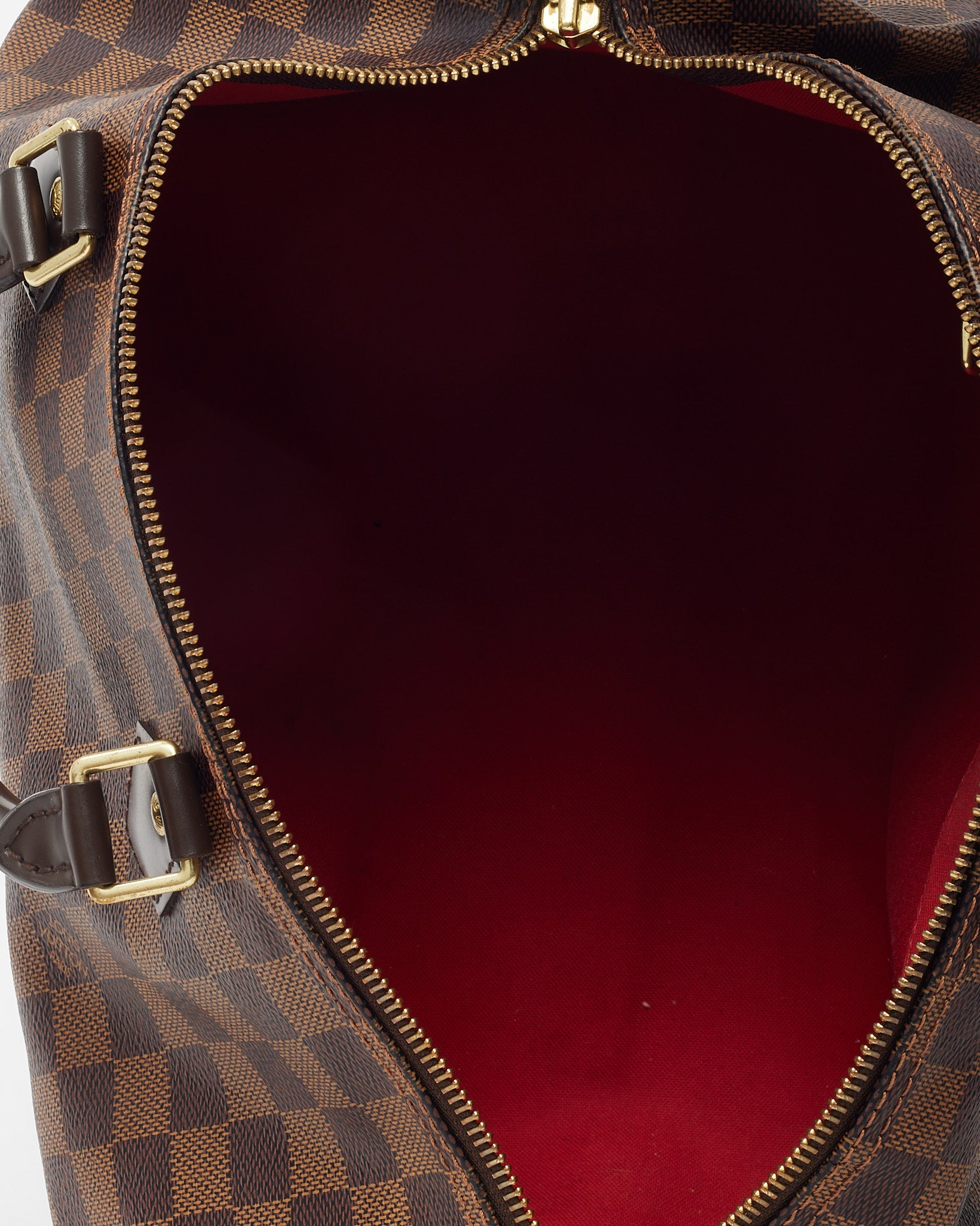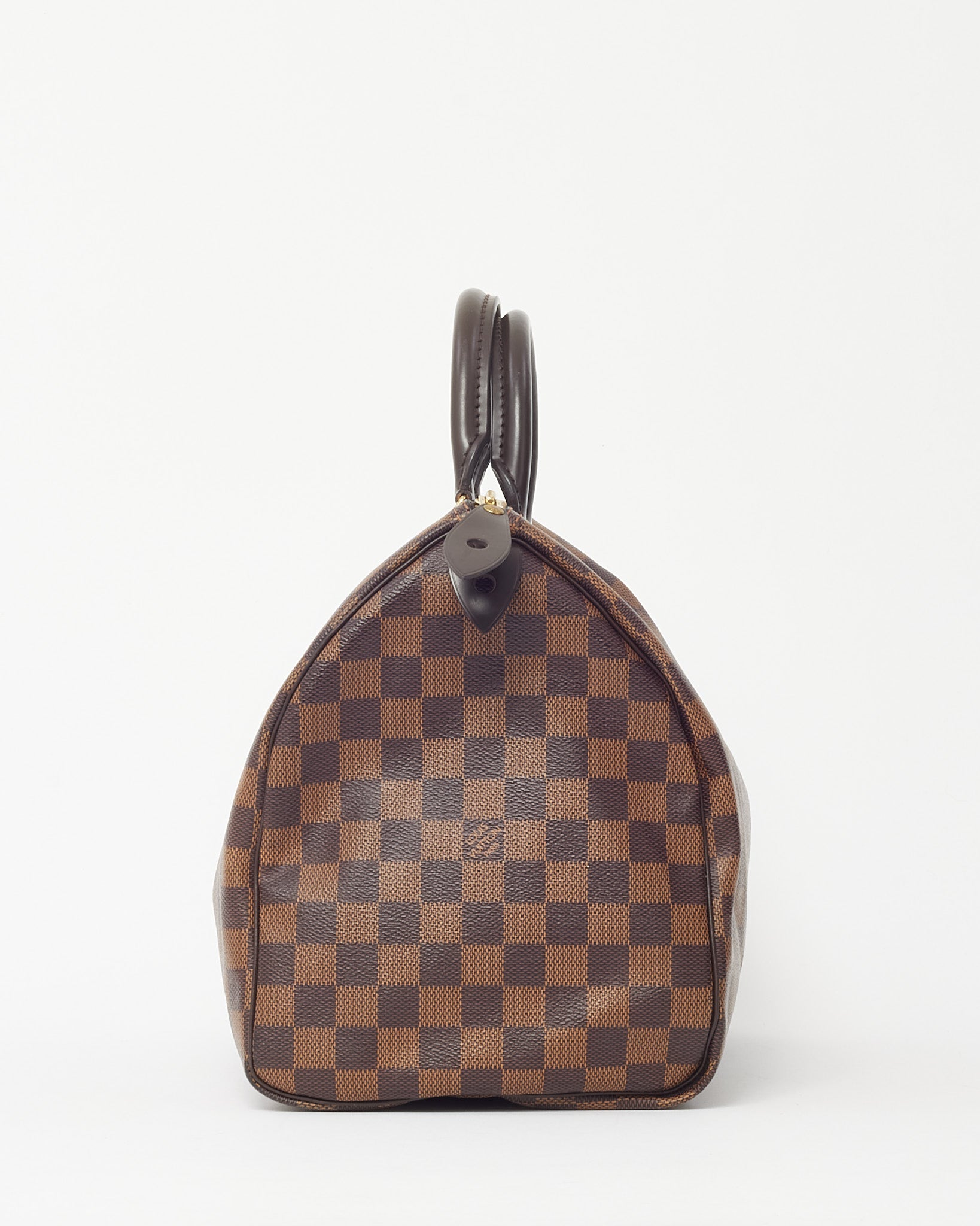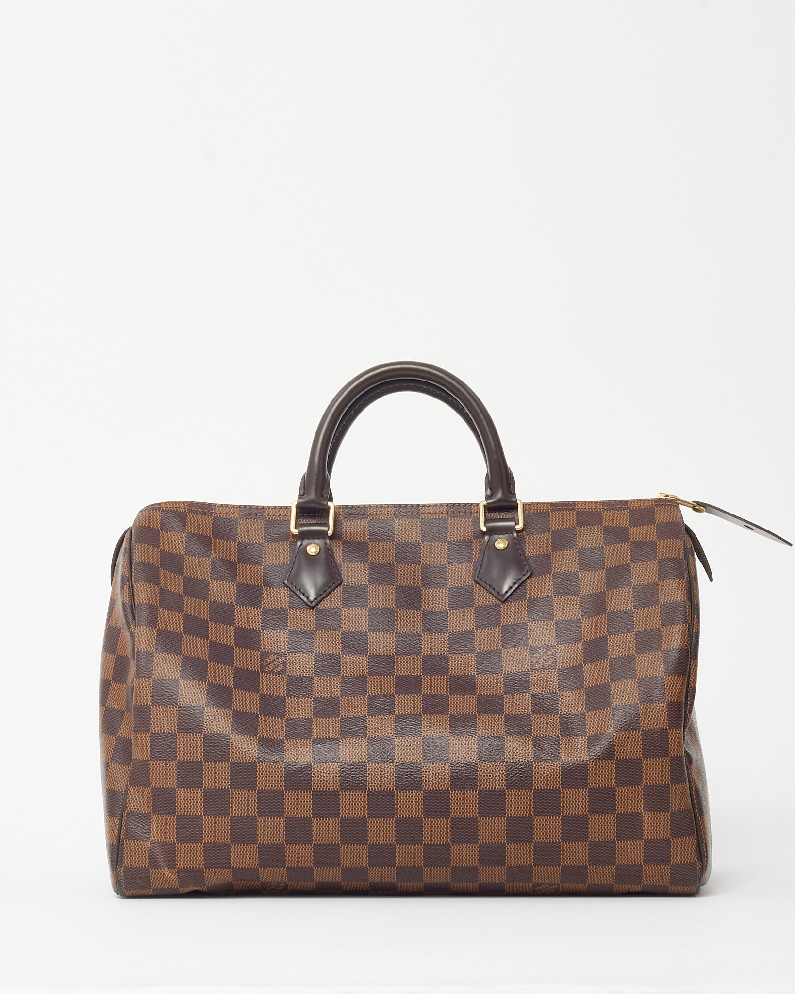 Timeless and iconic, this pre-loved authentic Louis Vuitton Damier Ebene Coated Canvas Speedy 35 Bag showcases the perfect blend of elegance and practicality. Crafted from durable Damier Ebene coated canvas with smooth brown leather trim, it features a structured silhouette, double rolled handles, and gold-tone hardware for a polished finish. The zip-top closure opens to a spacious interior ideal for everyday essentials. A signature Louis Vuitton piece that brings classic sophistication to any look.