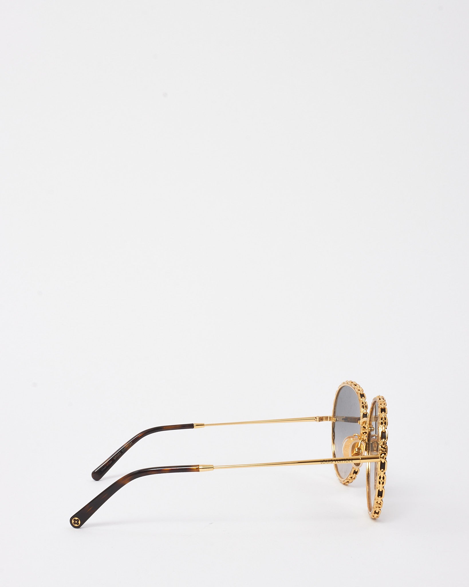Elevate your eyewear collection with these pre‑loved authentic Louis Vuitton Gold LV Chain Ring Round Sunglasses, model 21622W. Featuring a luxurious gold‑tone chain ring temple accent and rounded frame, these sunglasses combine distinctive design with heritage branding. The lenses offer full UV protection, while the slim metal frame and temple detail deliver a sleek, fashion‑forward finish. A refined accessory that brings modern elegance and standout style to your designer edit.