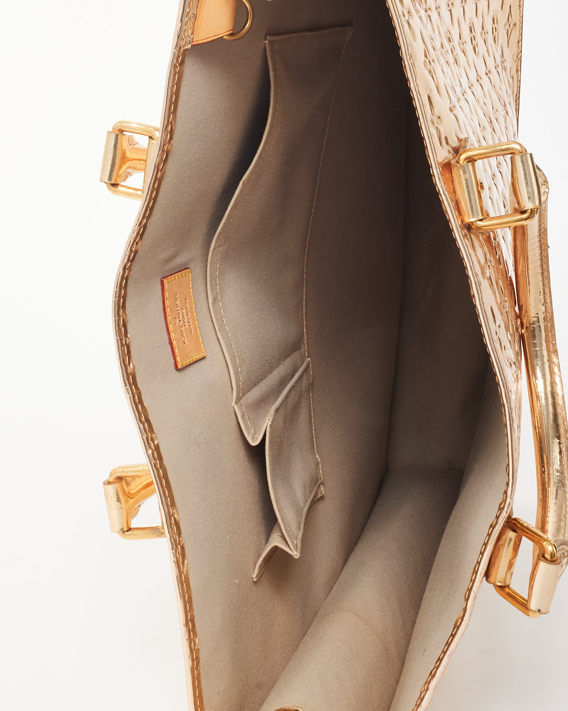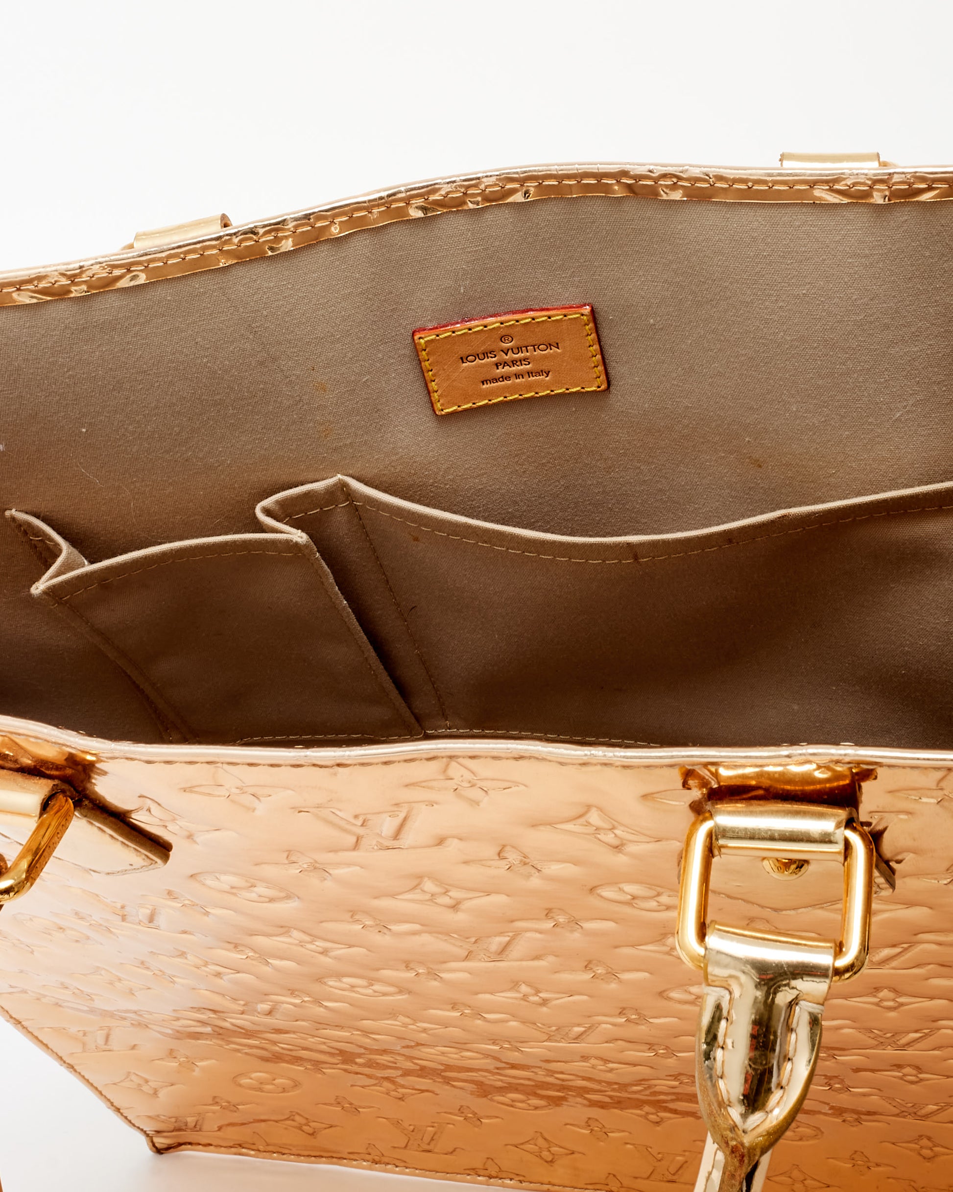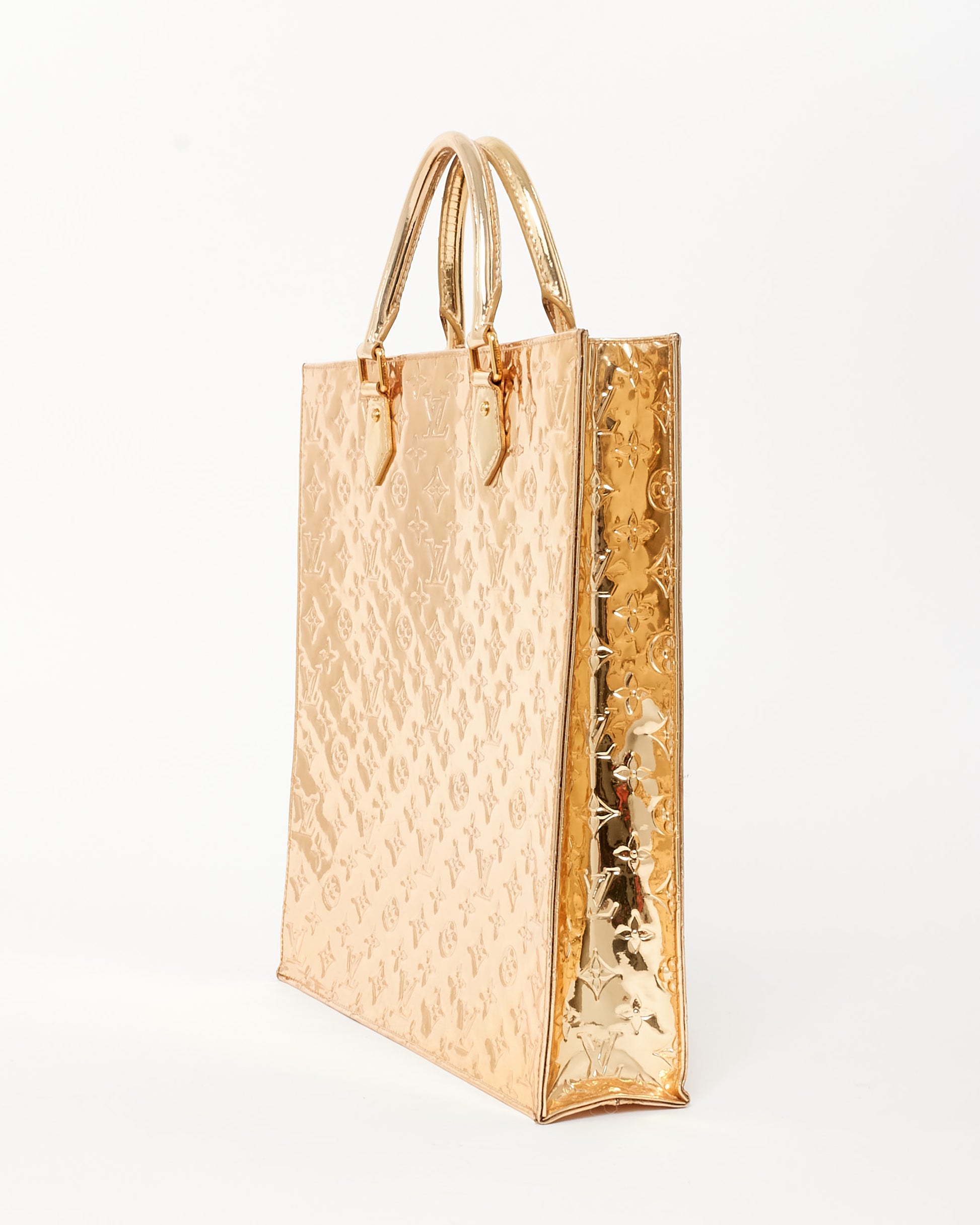 Step into a world of timeless elegance with this authentic pre-owned Louis Vuitton Gold Monogram Mirror Vernis Sac Plat, a true masterpiece in luxury fashion. This stunning tote is expertly crafted from high-gloss gold Mirror Vernis leather, renowned for its mirror-like finish and durability. Featuring the iconic Louis Vuitton monogram embossed across the shimmering exterior, this bag offers a dazzling visual experience. Its generous dimensions ensure ample storage, while the flat handles provide comfortable hand or elbow carry. The interior reveals a beautifully lined compartment with a slip pocket, perfect for organizing essentials. Shop pre-owned authentic Louis Vuitton bags at Retyche.