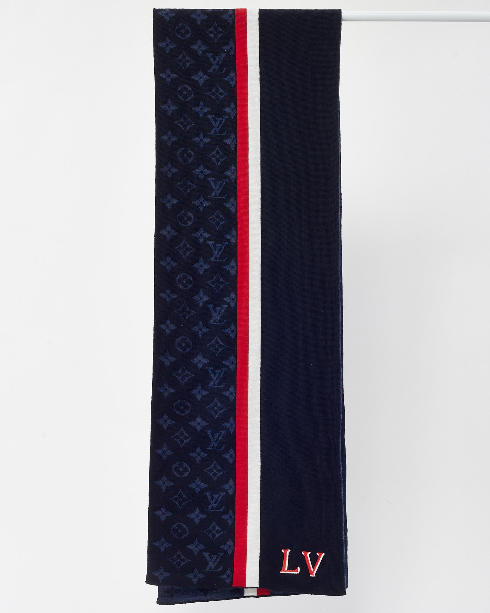 Wrap up in elevated streetwear style with this pre-loved authentic Louis Vuitton Navy Monogram Wool Varsity Muffler Scarf. Crafted from soft wool in a deep navy hue, this statement scarf features bold varsity-style LV initials alongside the iconic monogram pattern. The Louis Vuitton Navy Monogram Wool Varsity Muffler Scarf is the perfect blend of warmth and house heritage—ideal for adding a luxe finish to cold-weather layering.