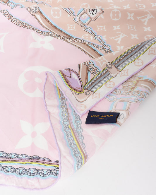 This authentic pre-owned Louis Vuitton Pink Lilac & Blue Chain Square Silk Scarf is a luxurious accessory that blends soft, elegant colors with the brand’s iconic design. Crafted from premium silk, this square scarf features an intricate chain pattern in shades of pink, lilac, and blue, creating a sophisticated and stylish look. The high-quality silk gives it a lightweight, smooth feel, perfect for adding a touch of luxury to any outfit. 100% silk for a soft, lightweight fee, square shape with an intricate chain print in pink, lilac, and blue hues and generously sized, ideal for versatile styling as a neck scarf, headscarf, or bag accessory. Shop pre-owned authentic Louis Vuitton accessories and scarves at Retyche.