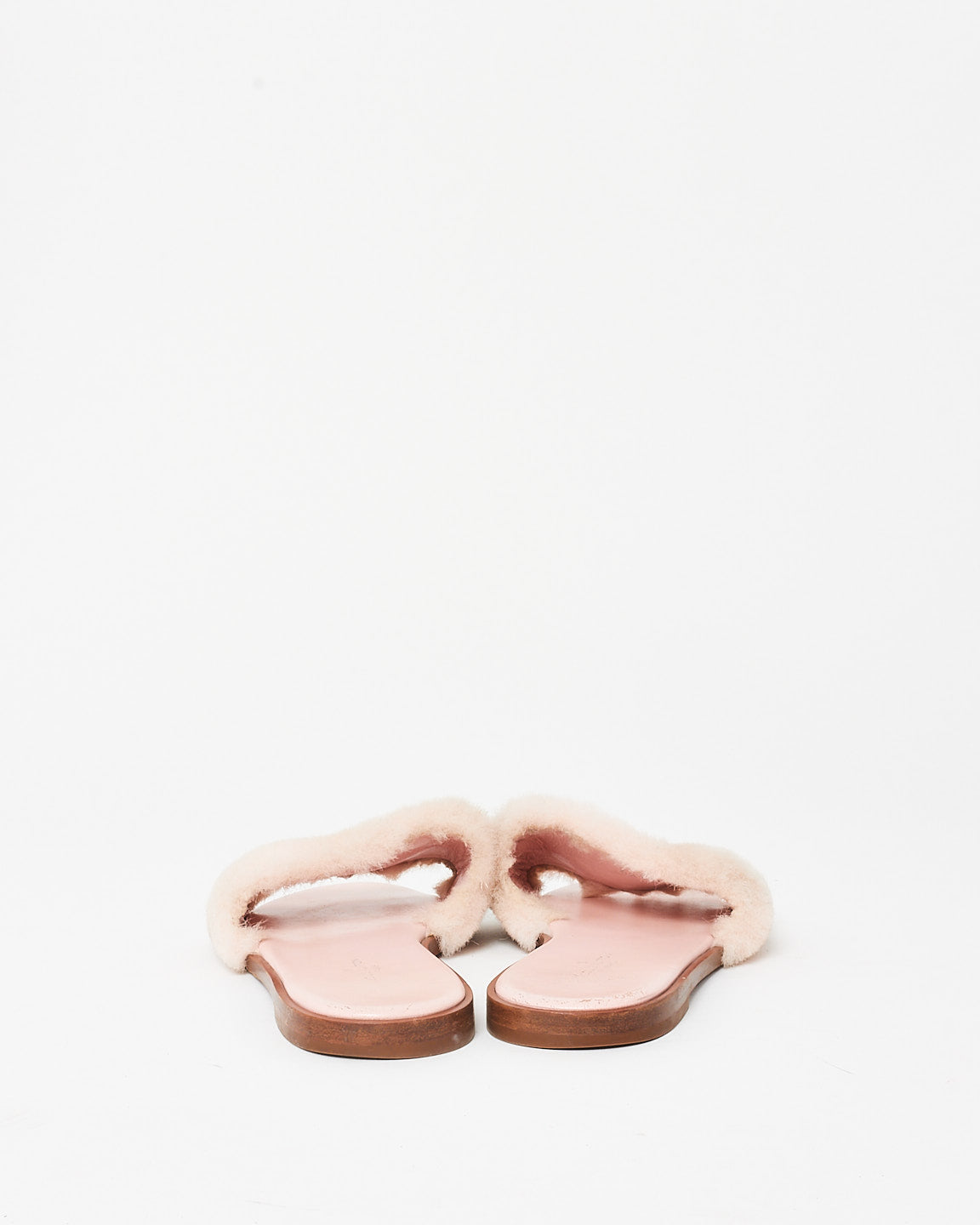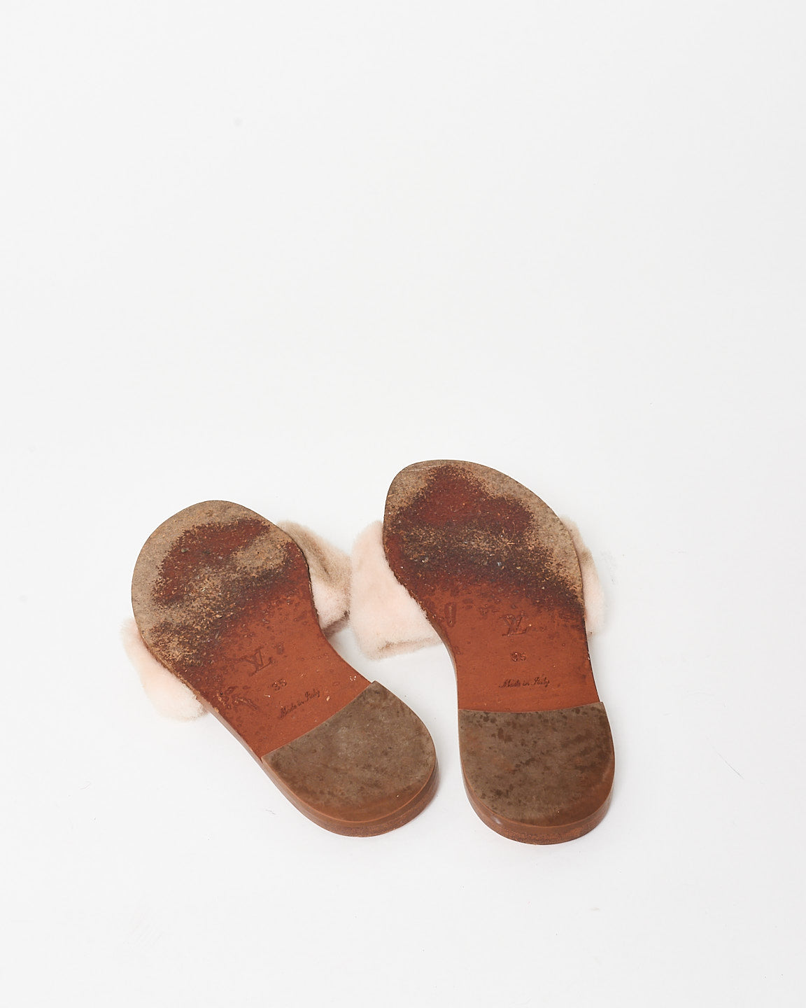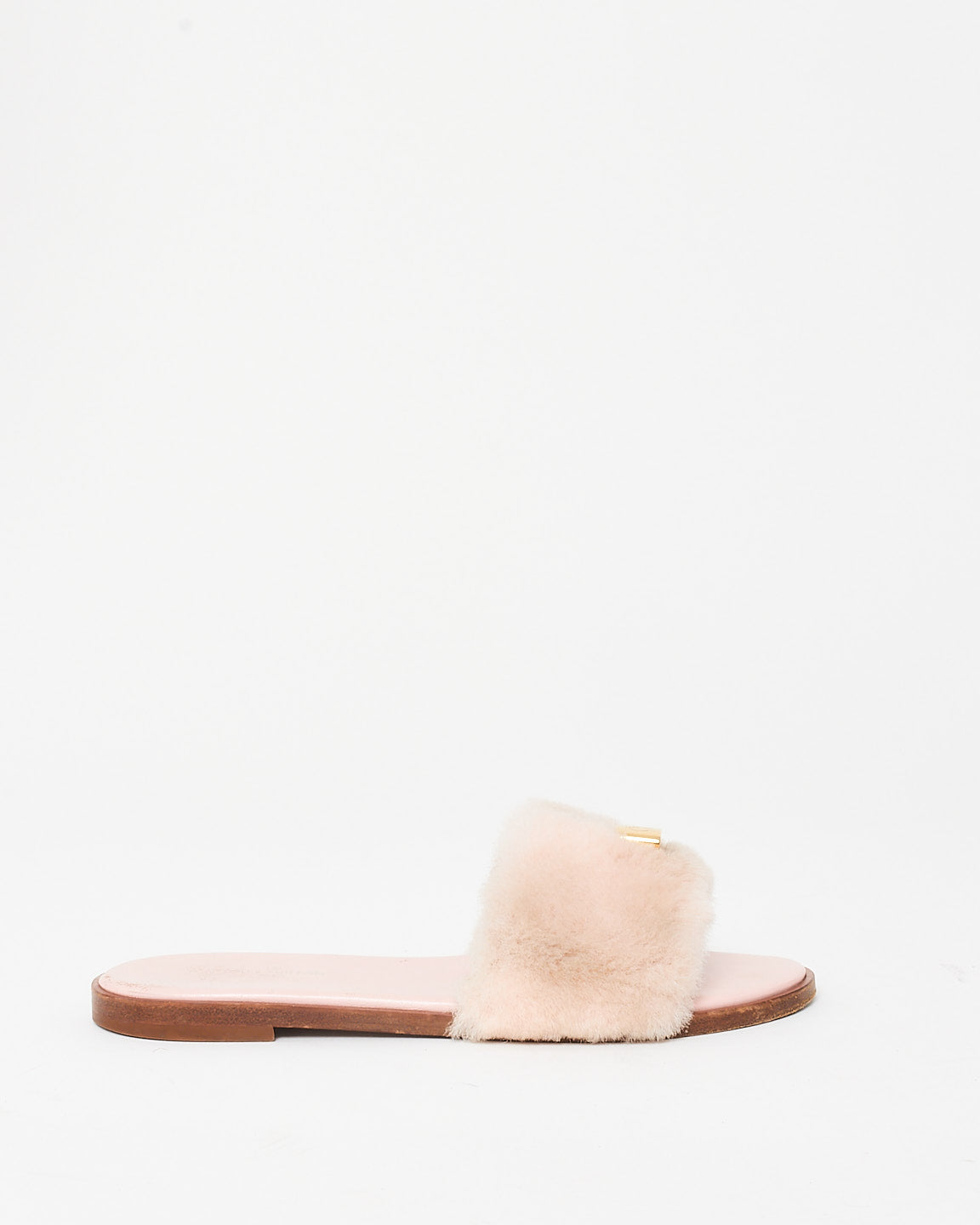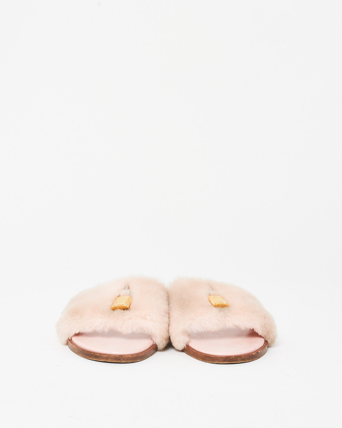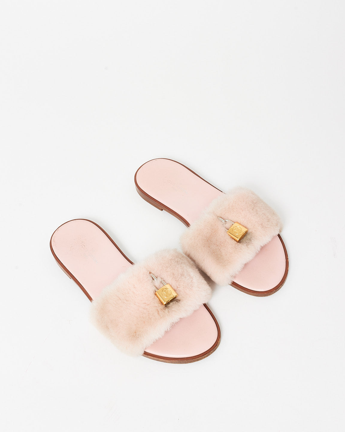 Explore these 100% authentic pre-owned Louis Vuitton Pink Shearling & Lock Slides in size 35. These chic slides are crafted from sumptuous pink shearling, offering a soft, plush feel that's perfect for both indoor lounging and outdoor adventures. Featuring the iconic Louis Vuitton lock detail, these slides combine elegance with a laid-back aesthetic. The cushioned footbed provides all-day comfort, while the durable sole ensures stability and traction. Ideal for pairing with casual outfits or loungewear, these slides add a touch of luxury to your everyday look.