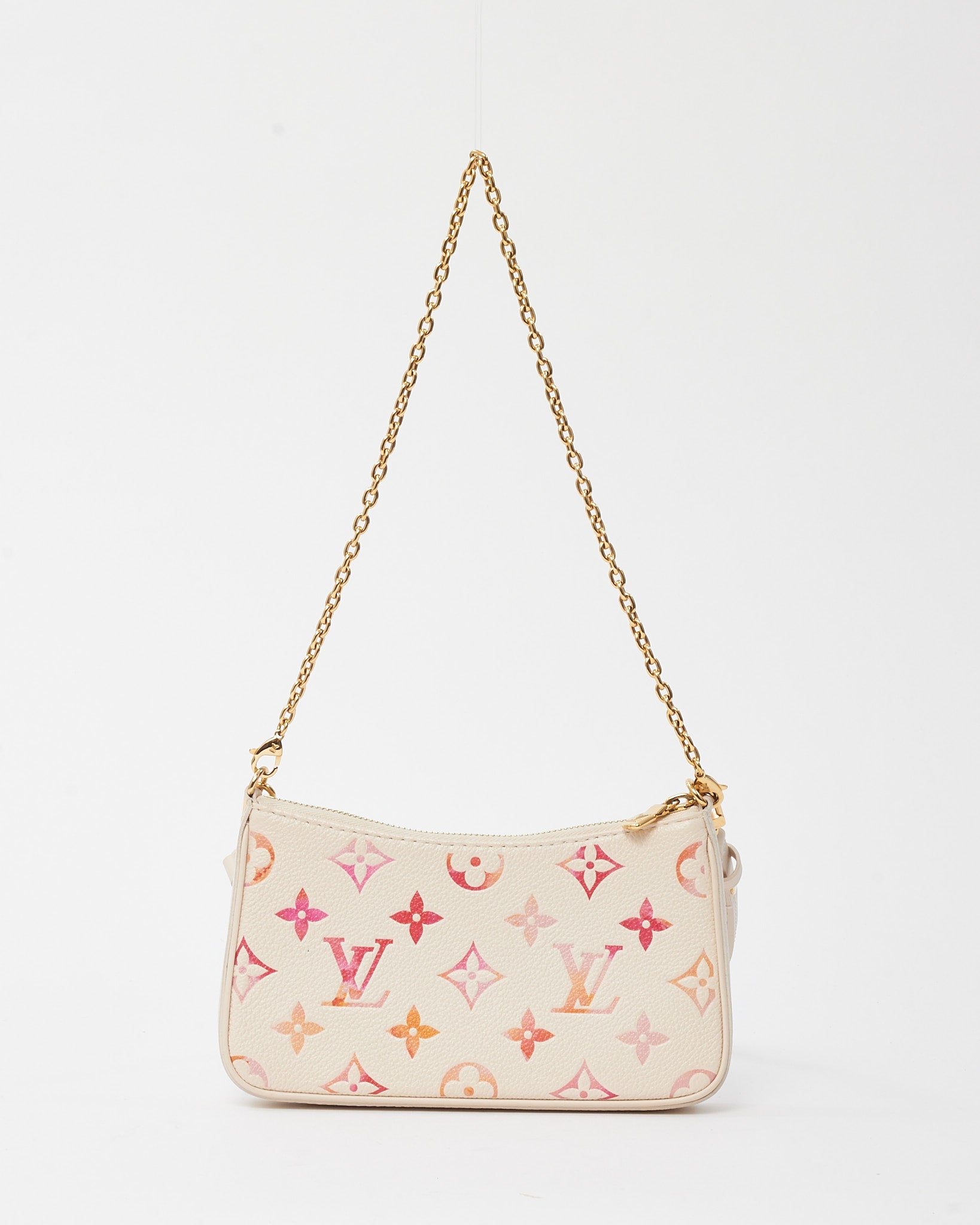 Add a soft pop of color to your collection with this pre-loved authentic Louis Vuitton Pink Sunrise Aquarelle Easy Pouch On Strap Bag. Crafted from supple Monogram Empreinte leather in a dreamy gradient of blush and pastel pink tones, this slim pouch features the iconic monogram pattern embossed throughout. Designed for both elegance and ease, it comes with a removable leather strap and a gold-tone chain for versatile wear—over the shoulder, crossbody, or as a clutch. A perfect blend of chic minimalism and seasonal charm.
