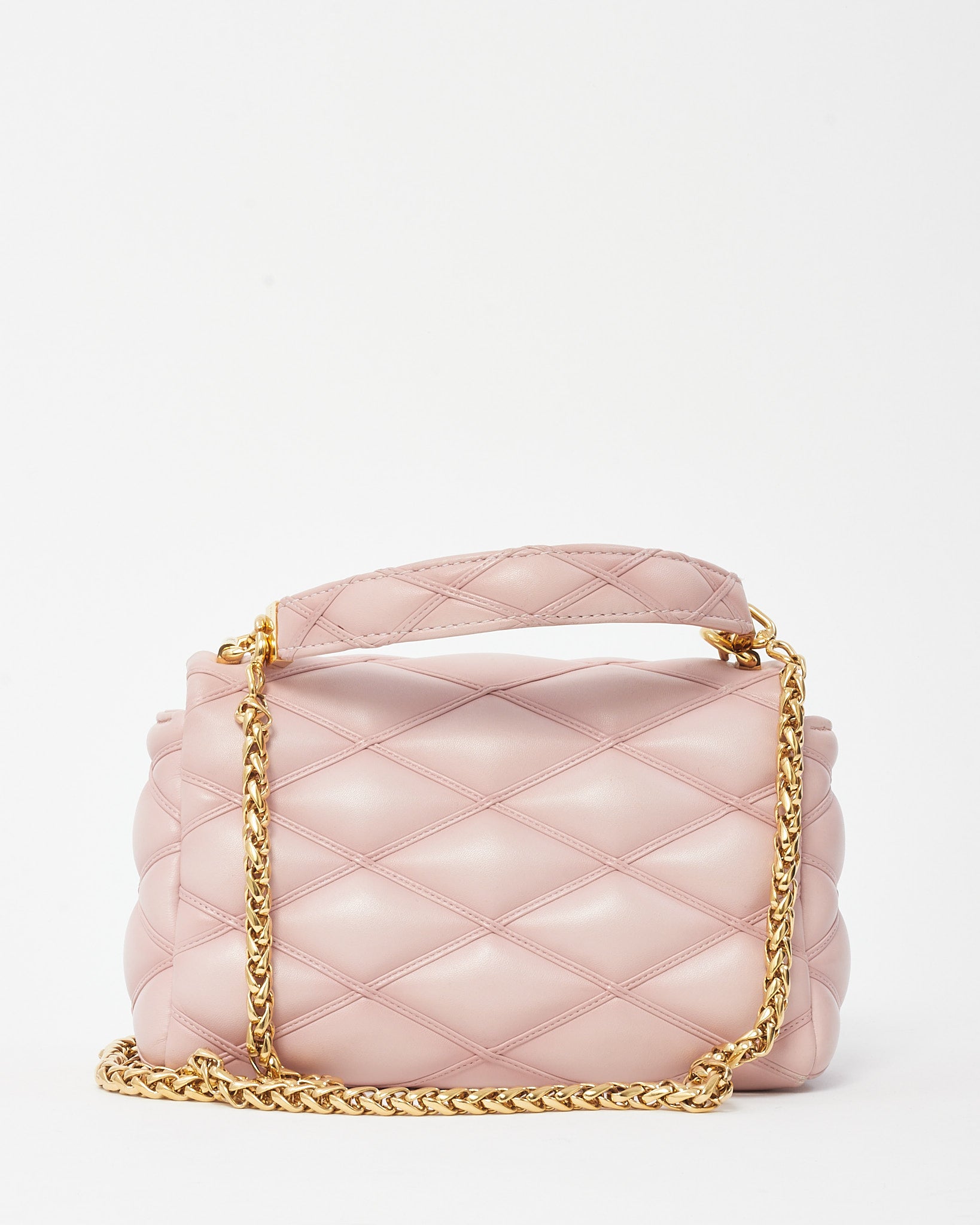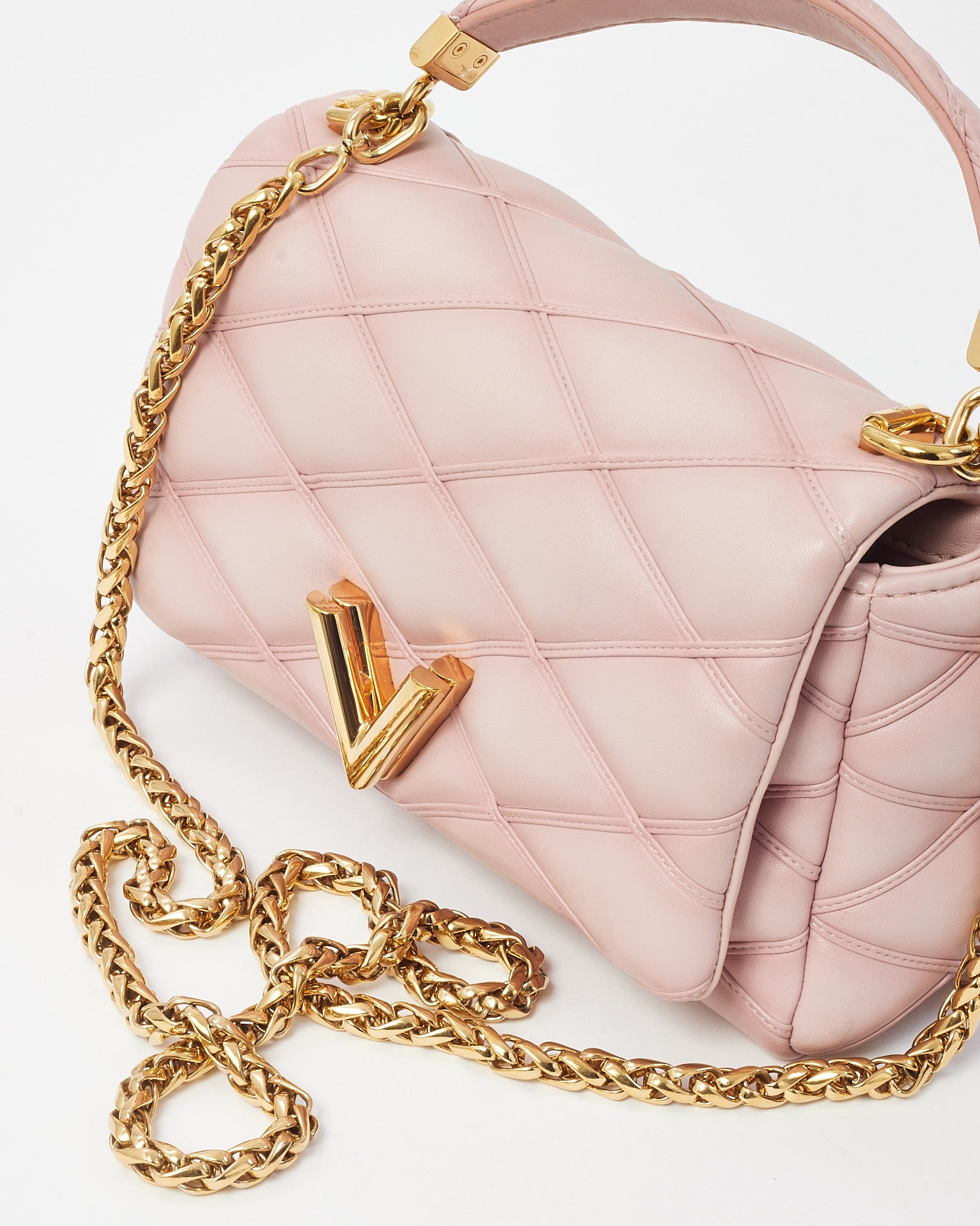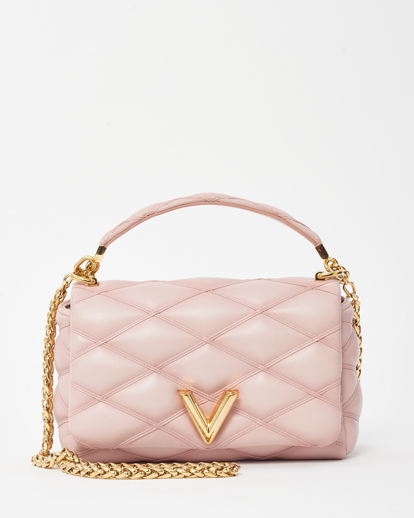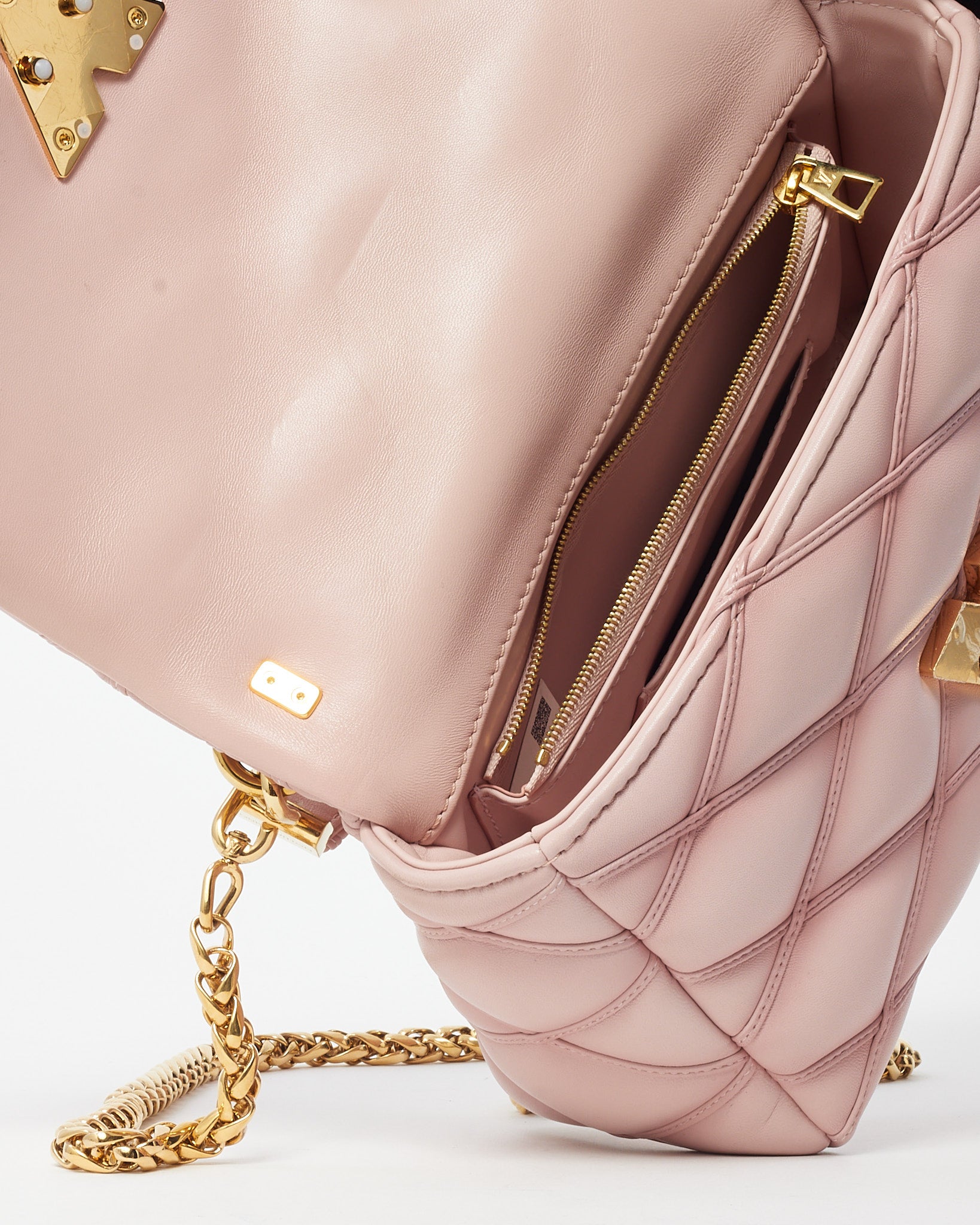Make a statement with this pre-loved authentic Louis Vuitton GO-14 MM Chain Shoulder Bag in soft Rosabella pink lambskin leather. Featuring the iconic padded malletage quilting inspired by the interiors of Louis Vuitton trunks, this elegant piece blends heritage craftsmanship with contemporary luxury. The gold-tone LV twist-lock closure adds a touch of glamour, while the sliding chain strap allows for versatile wear as a shoulder or crossbody bag. Inside, a well-organized interior includes a flat pocket and microfiber lining, making it as functional as it is sophisticated. Feminine yet bold, this GO-14 MM bag brings refined charm to any elevated ensemble.