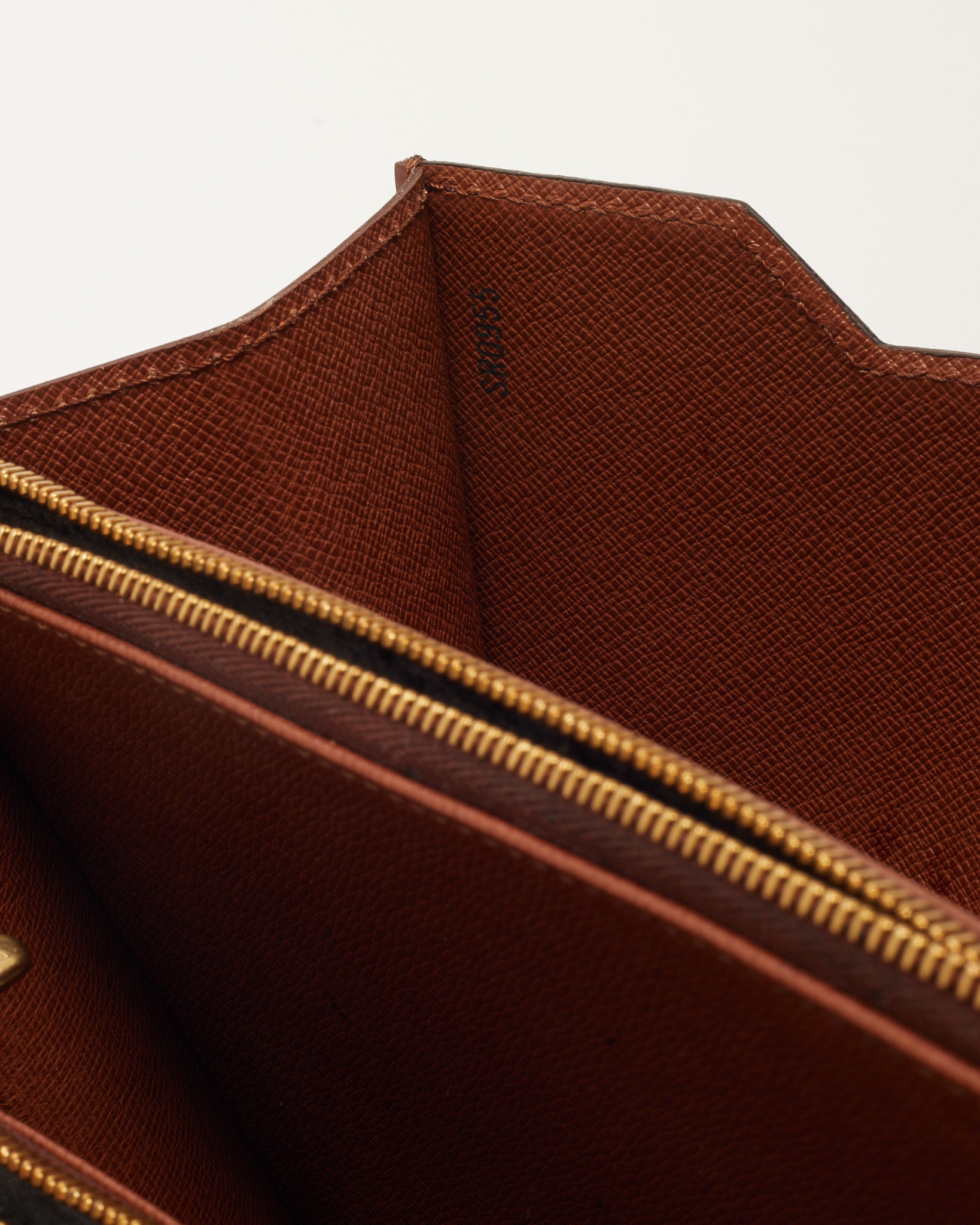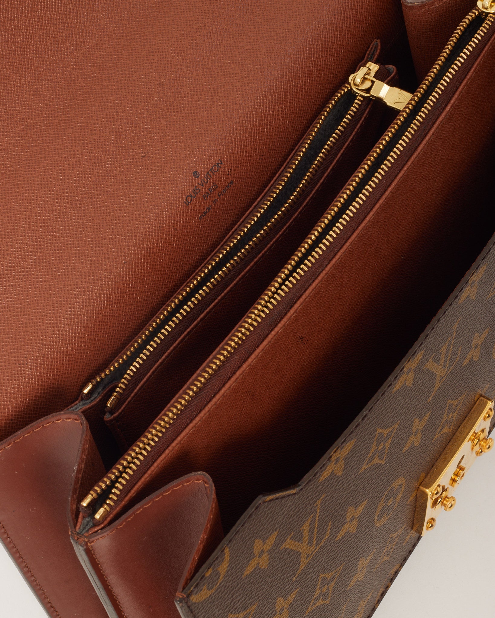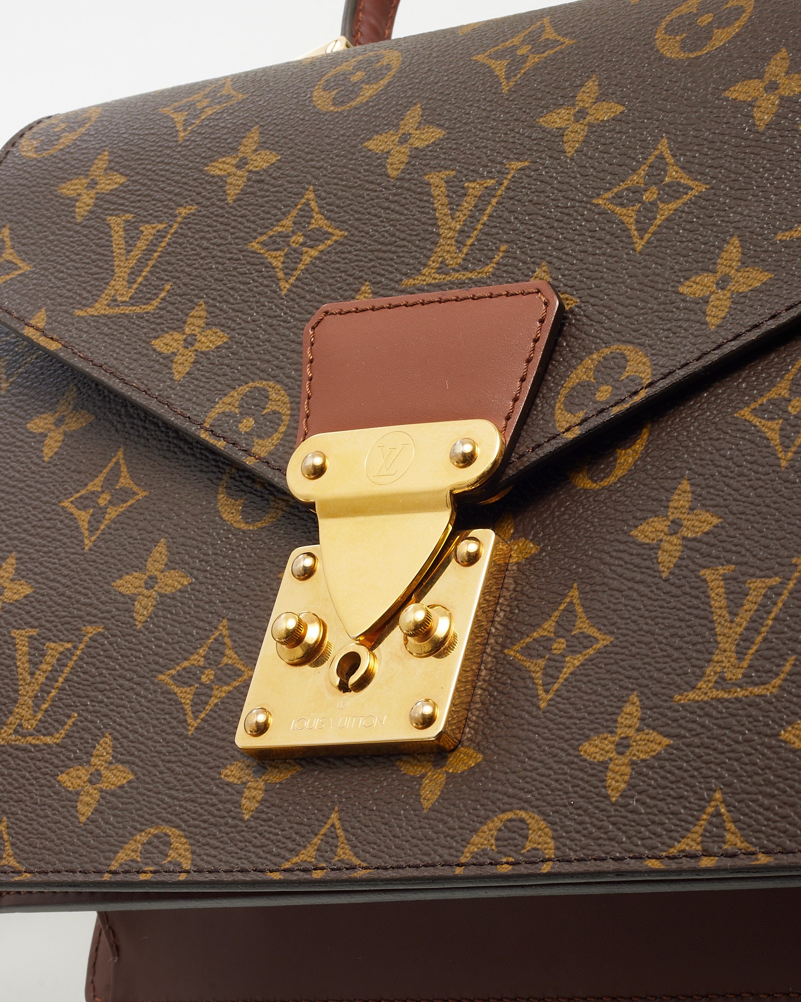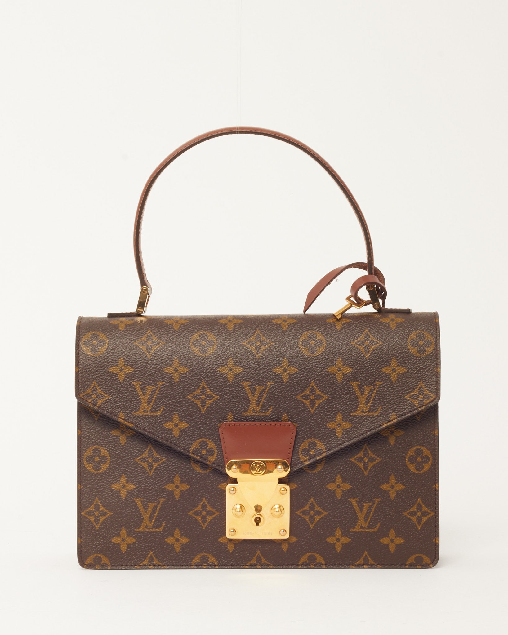 Elegant and timeless, this pre-loved authentic Louis Vuitton Vintage Monogram Canvas Monceau Top Handle Bag showcases classic LV craftsmanship and Parisian sophistication. Crafted from the iconic Monogram coated canvas with natural Vachetta leather trim, it features a structured rectangular silhouette, top handle, and gold-tone S-lock closure. The interior includes organized compartments, perfect for everyday essentials. A vintage Louis Vuitton treasure that blends refined style with enduring charm.