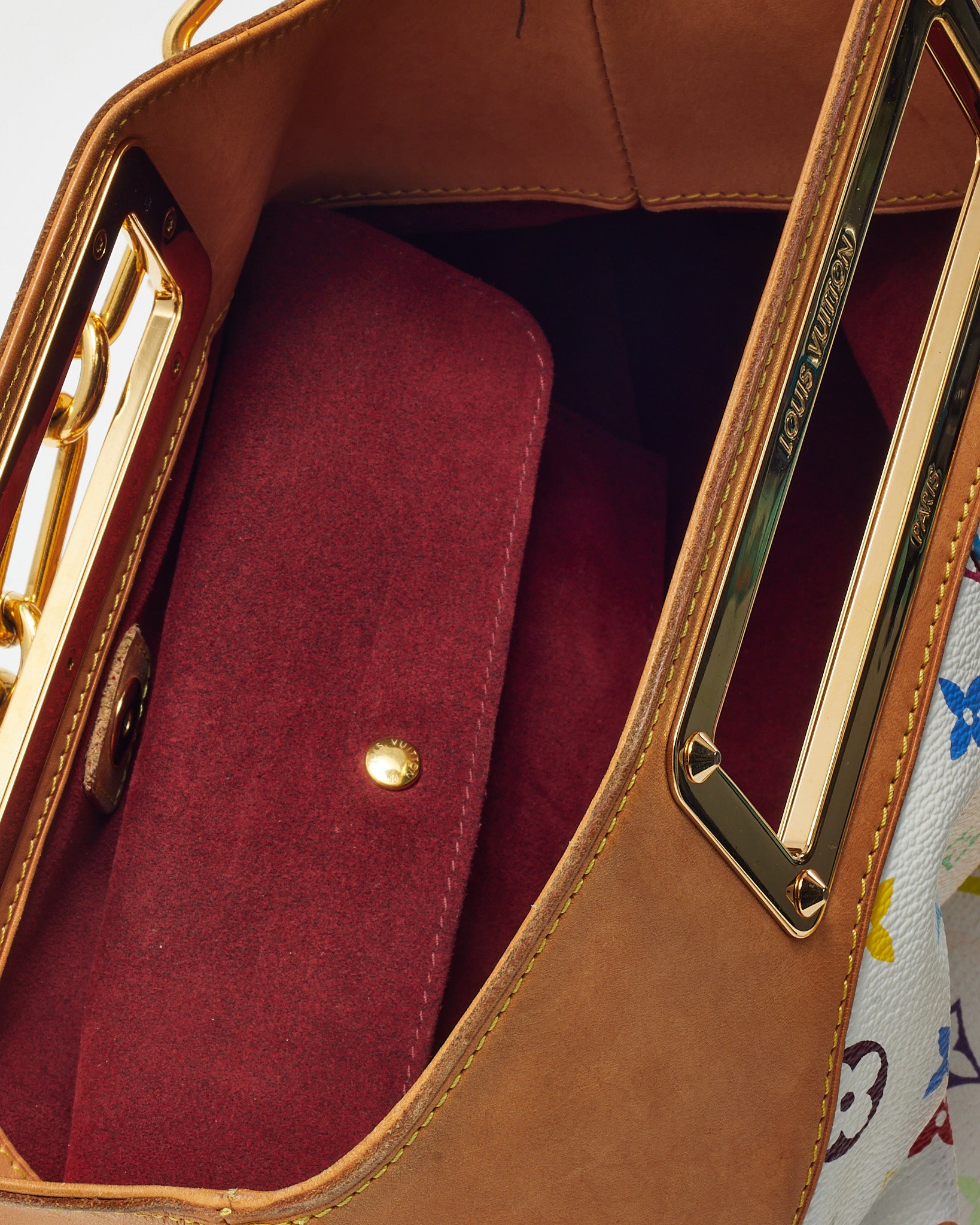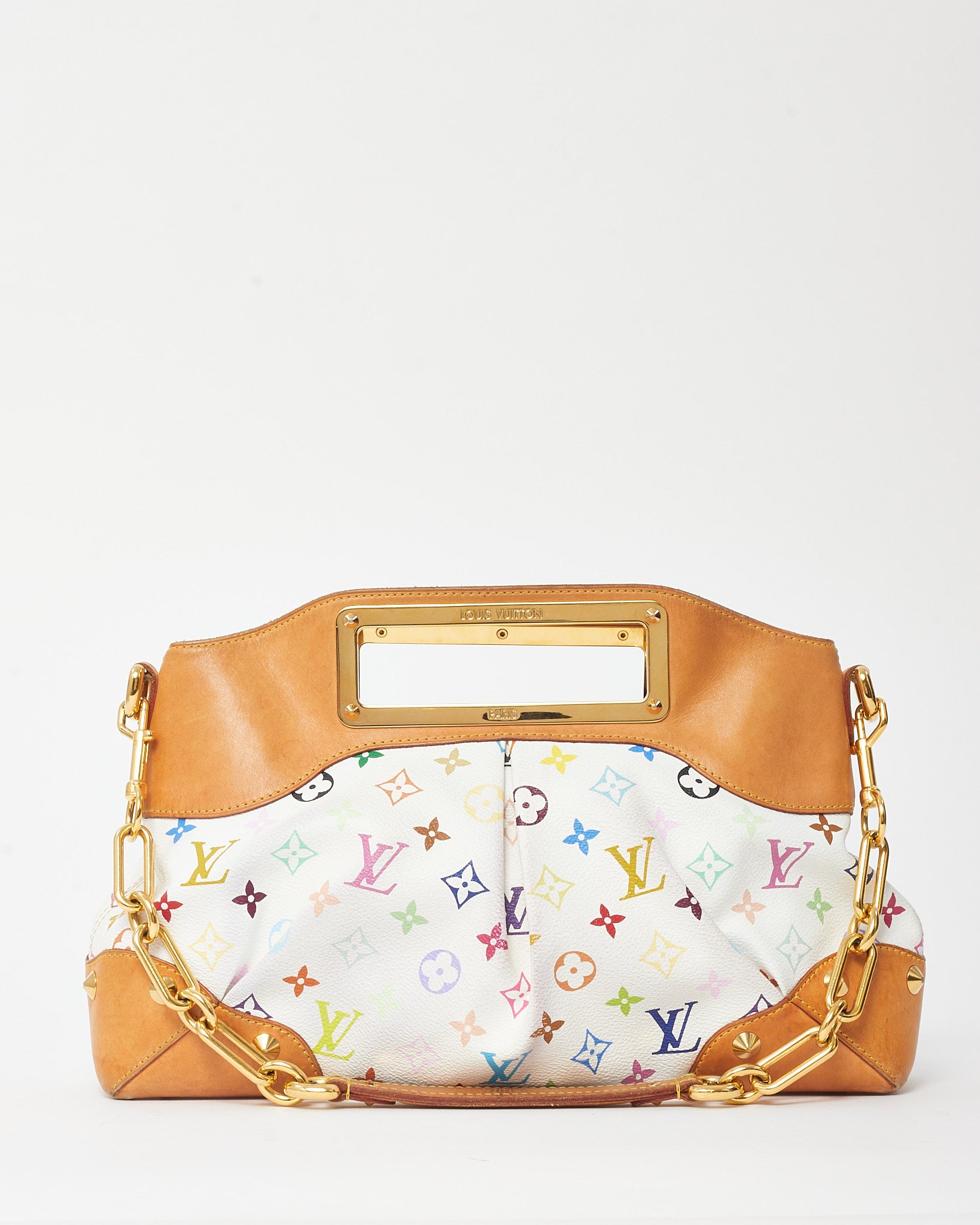 Brighten your accessories collection with this pre-loved authentic Louis Vuitton Judy MM Bag in the iconic white Multicolore Monogram, a collaboration with artist Takashi Murakami. Crafted from coated canvas with natural vachetta leather trim, this statement shoulder bag features polished gold-tone hardware, a sculptural metal frame, and a spacious interior lined in vibrant microfiber. Equal parts playful and sophisticated, it’s a standout piece that blends artistic flair with timeless Louis Vuitton craftsmanship.