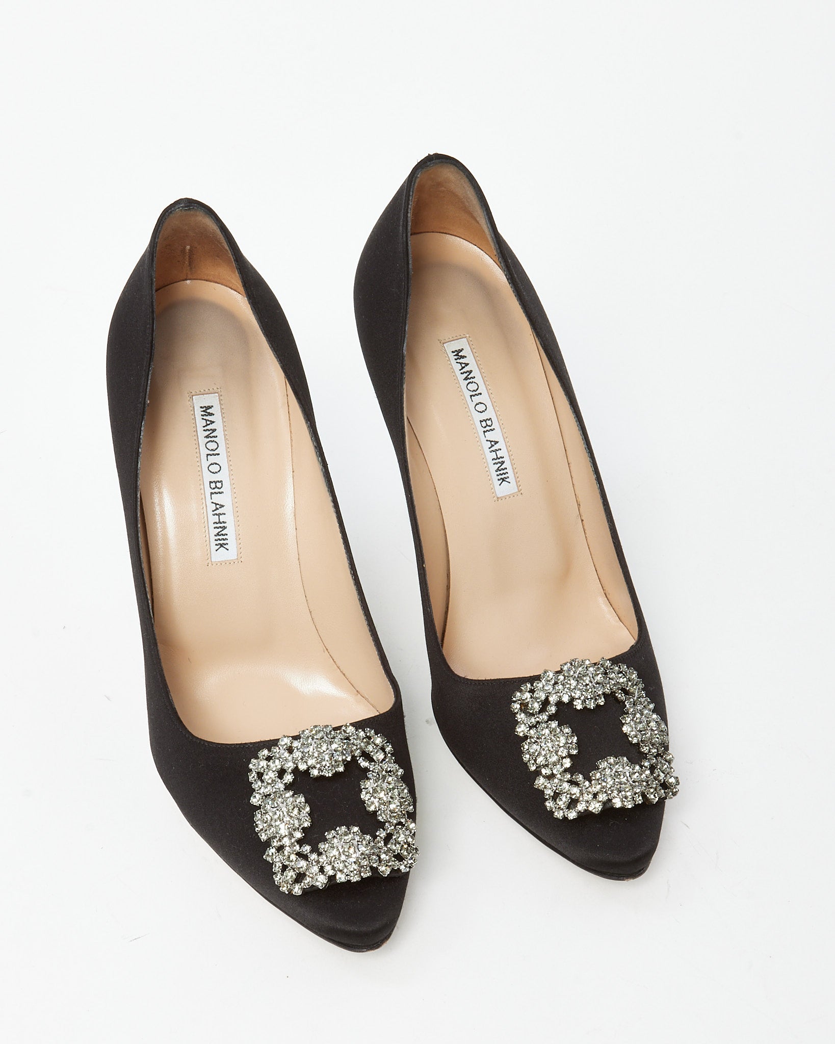 Step into timeless evening elegance with these pre-loved authentic Manolo Blahnik Black Satin Jewel Buckle Hangisi Pumps - 37.5, crafted in luxurious black satin for a refined, polished finish. The iconic Hangisi silhouette features a sleek pointed toe and a dazzling crystal-embellished buckle that adds signature Manolo Blahnik glamour. Set on a graceful heel that elongates the leg, these designer pumps transition effortlessly from formal occasions to elegant evening wear. A coveted Manolo Blahnik classic that blends sophisticated craftsmanship with unforgettable sparkle.