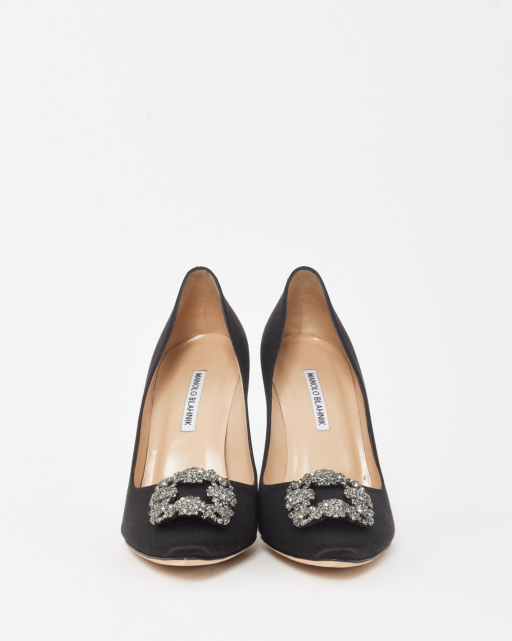 A symbol of timeless glamour, these pre-loved authentic Manolo Blahnik Hangisi pumps feature sleek black satin and the iconic crystal-embellished square buckle. Designed with a pointed toe and elegant stiletto heel, this signature style is a red carpet favorite and bridal essential alike. The epitome of refined sophistication, they elevate any ensemble with instant polish.