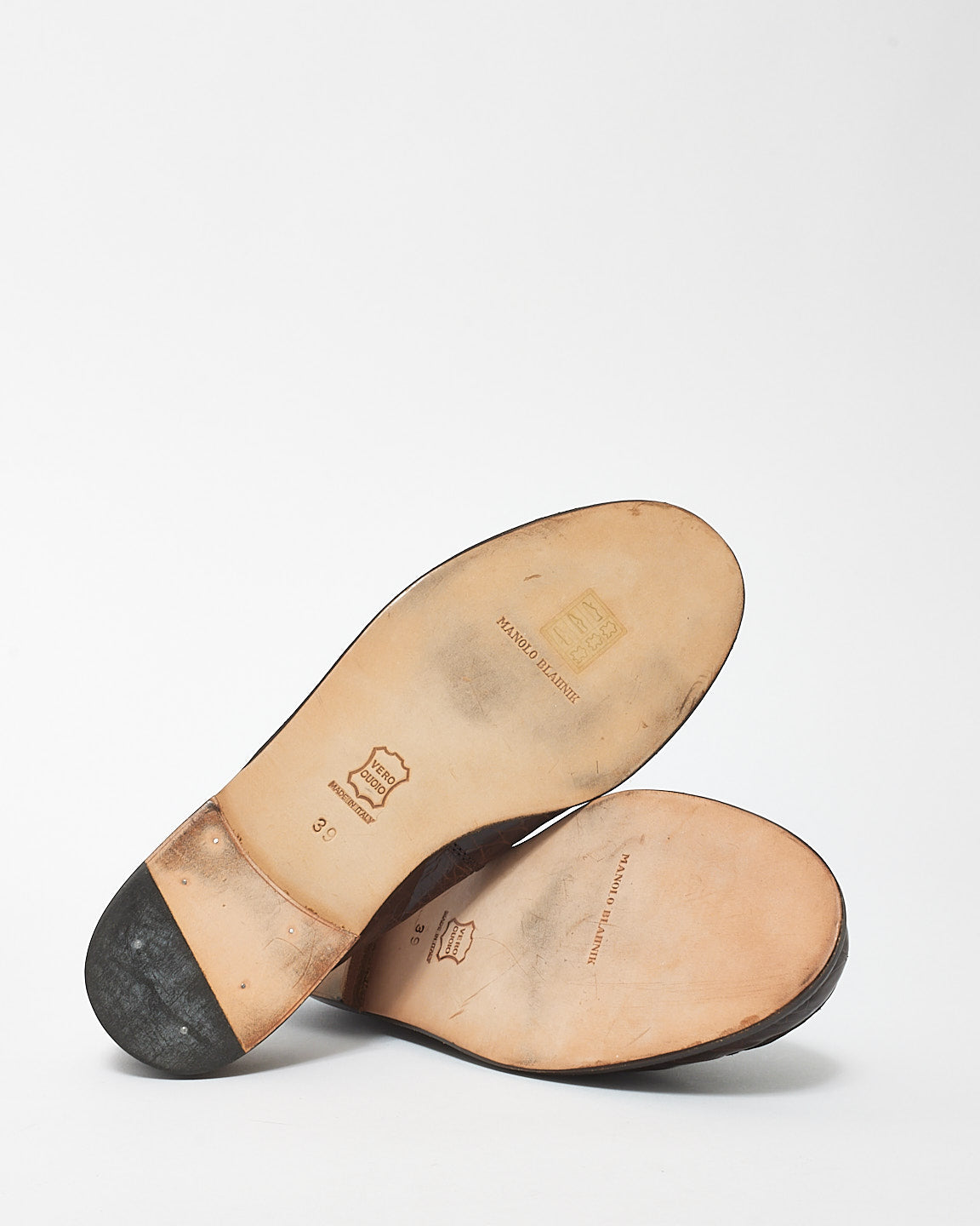 Explore Manolo Blahnik's exquisite collection of shoes, featuring this certified pre-owned Brown Croc Embossed Loafers - 39. Embodying timeless elegance and modern sustainability, each piece, including favorites like this, is authenticated by Retyche. Discover sustainable luxury — shop our current treasures or find inspiration for your next coveted find.