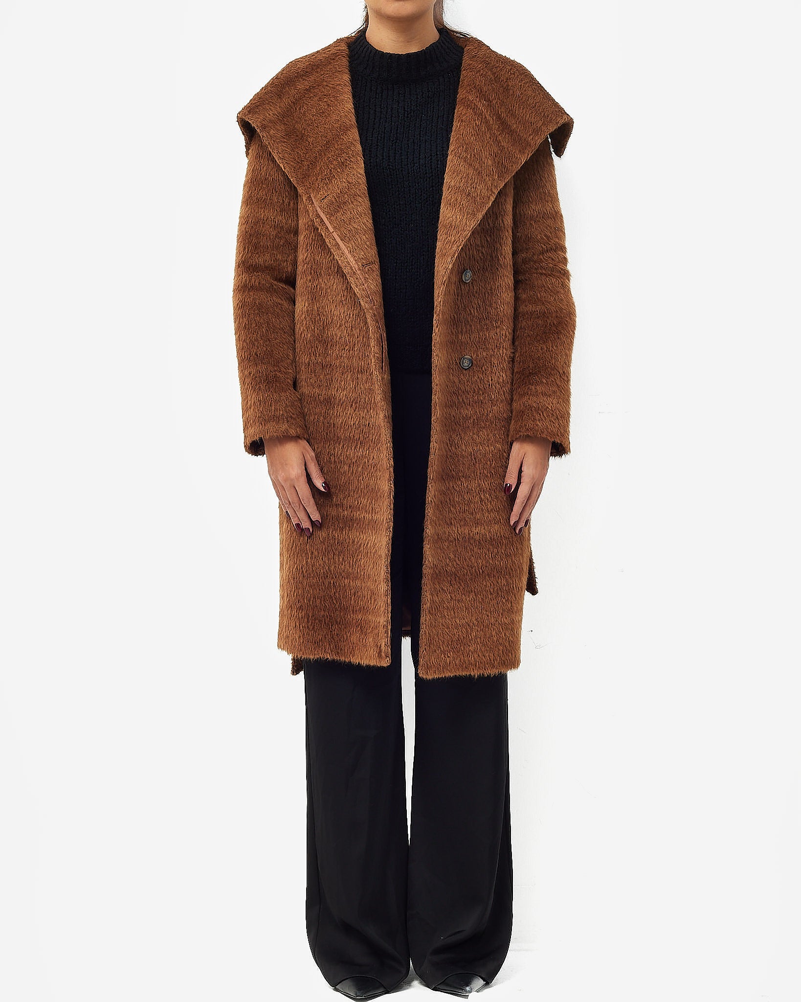 Wrap yourself in refined warmth with this pre-loved authentic Max Mara textured wrap coat in a rich rust-brown hue. Expertly crafted from a luxurious blend of alpaca and wool, this timeless piece features a plush, tactile finish that exudes understated elegance. The relaxed silhouette is cinched at the waist with a self-tie belt, offering both structure and comfort, while the shawl collar adds a soft, enveloping touch. Whether layered over tailored separates or weekend denim, this Max Mara coat brings effortless sophistication and seasonal versatility to your cold-weather wardrobe.