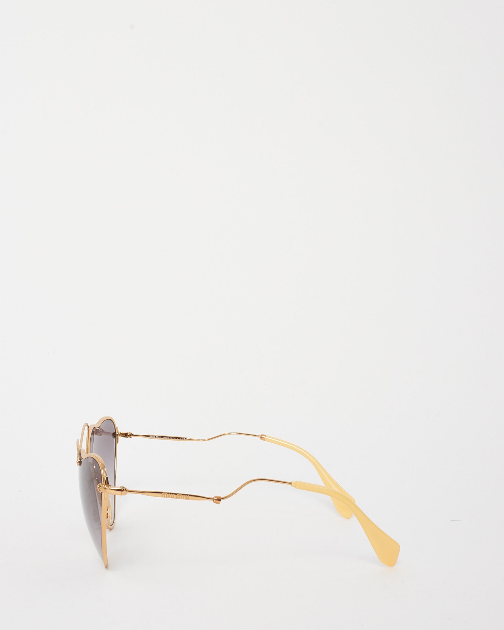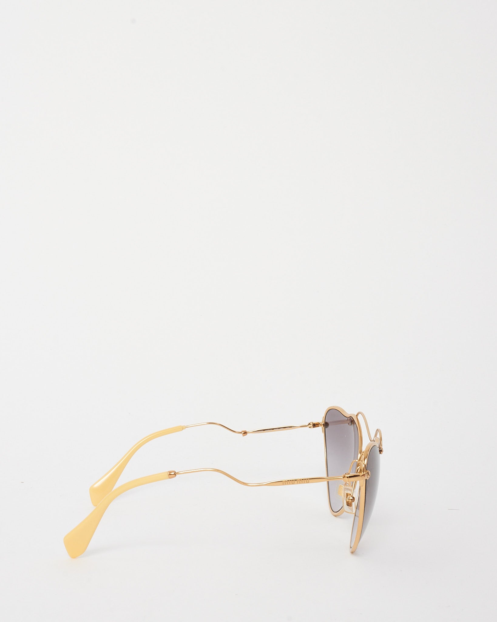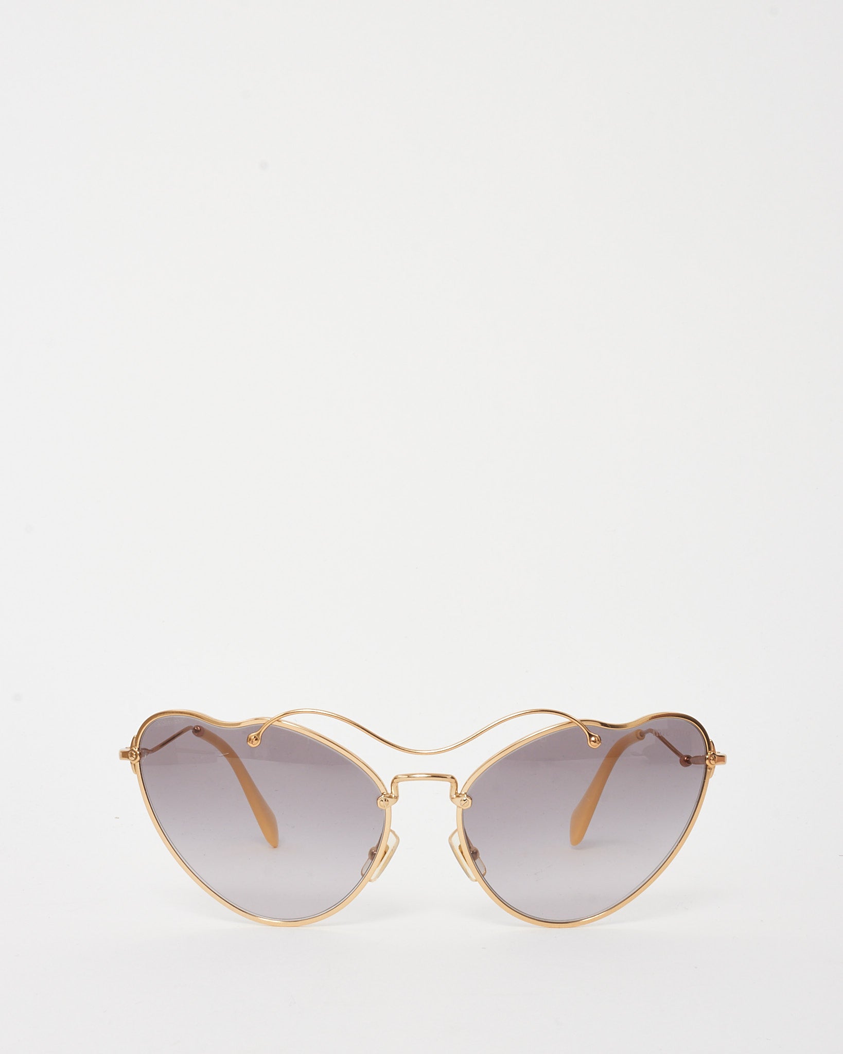 A bold expression of modern femininity, these pre-loved authentic Miu Miu SMU55R sunglasses feature a striking abstract cat eye silhouette in a lustrous gold-tone metal frame. Sculpted with geometric flair and finished with slender arms, they offer a dramatic profile that effortlessly balances avant-garde edge and timeless glamour. Gradient lenses provide both UV protection and a fashion-forward finish, making these statement shades a standout accessory for day-to-evening styling.