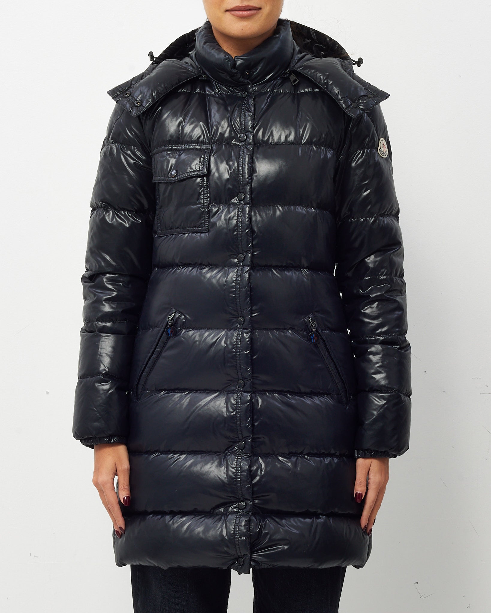 Elevate your outerwear rotation with this pre-loved authentic Moncler mid-length puffer jacket in glossy black. Filled with premium down for exceptional warmth, this sleek coat features a classic button-up front, high funnel collar, and signature Moncler logo patch at the sleeve. The lustrous finish adds a touch of sophistication, while the tailored silhouette flatters without sacrificing comfort. Ideal for city winters or alpine escapes, this puffer blends fashion and function in true Moncler style.