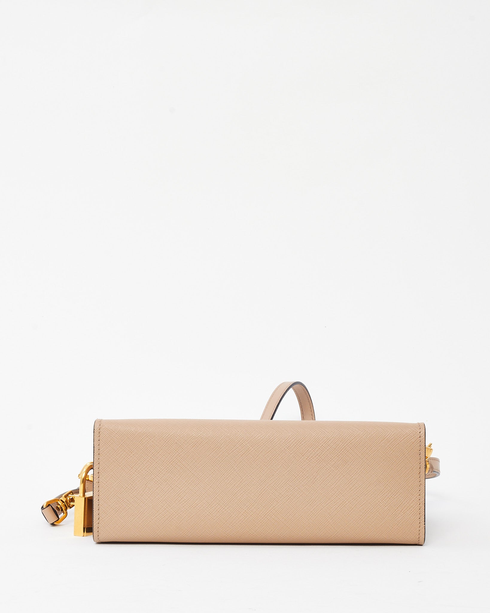 Refine your daily carry with this pre-loved authentic Prada Bandoliera Crossbody Bag in beige Cipria Saffiano and City calf leather. Featuring a sleek, structured silhouette, this versatile piece is accented with the signature Prada logo plaque and gold-tone hardware. The adjustable leather strap offers comfortable hands-free wear, while the compact interior keeps essentials organized in timeless Italian style.