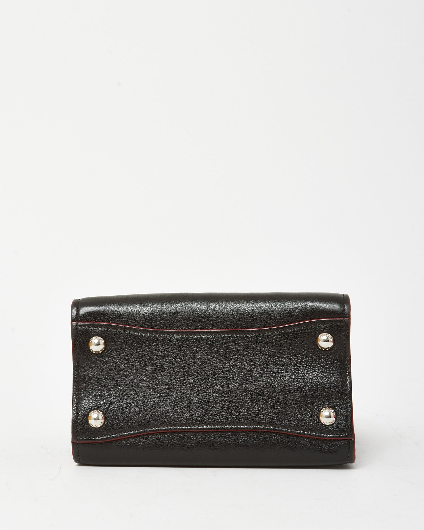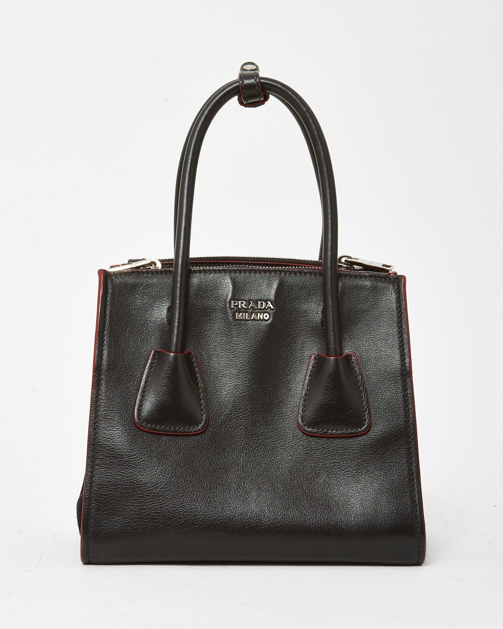Elevate your everyday carry with this pre-loved authentic Prada Black and Red Trim Glace Calf Leather & Scamosciato Twin Pocket Tote with Strap, crafted in smooth glace calf leather with soft scamosciato suede accents for a rich, textural finish. The structured tote silhouette is enhanced with bold red trim detailing and dual front pockets, adding both visual contrast and functional storage. Designed with top handles and a detachable strap for versatile wear, this Prada bag offers a spacious interior ideal for daily essentials. A distinctive designer tote that blends refined Italian craftsmanship with modern, statement-making style.