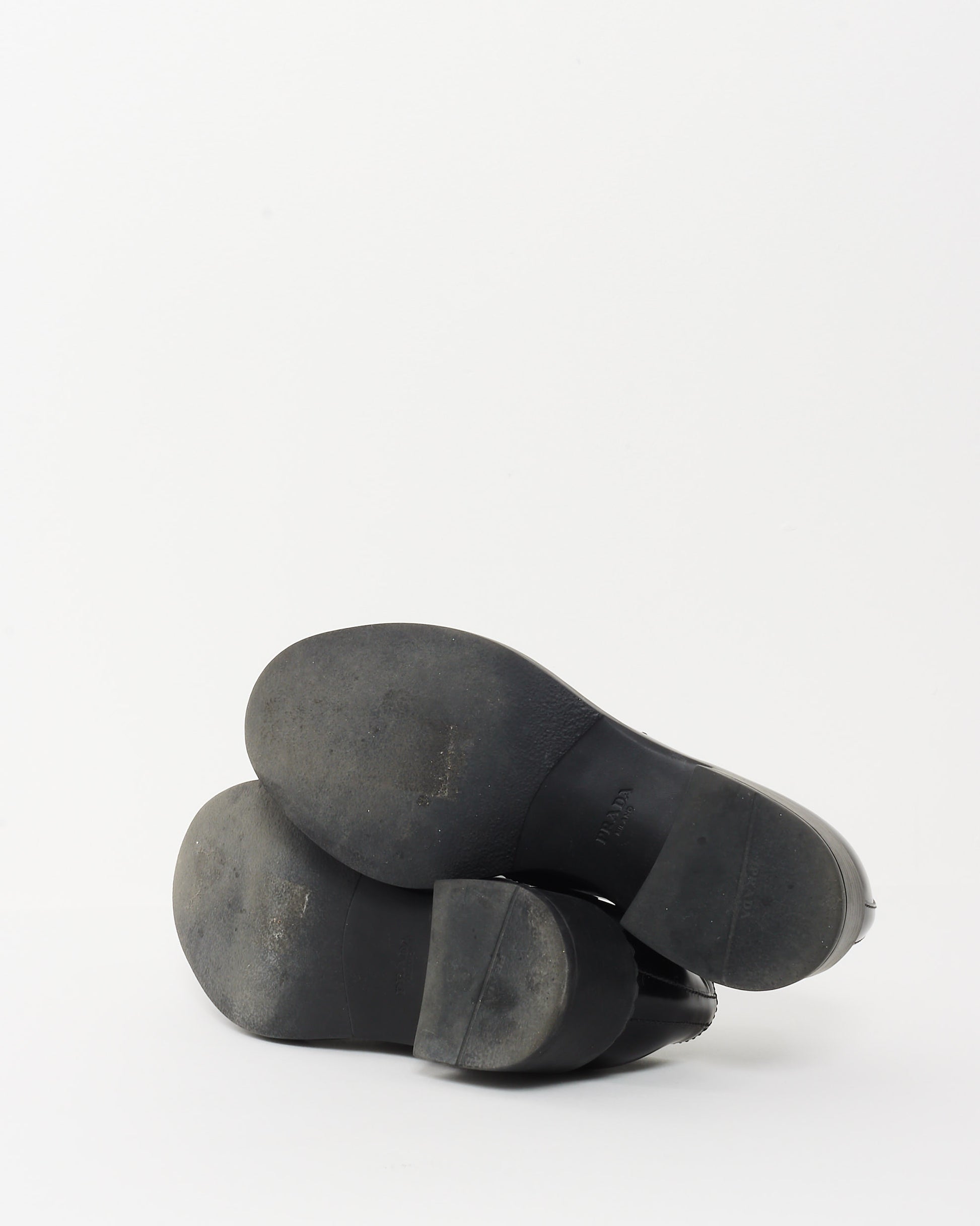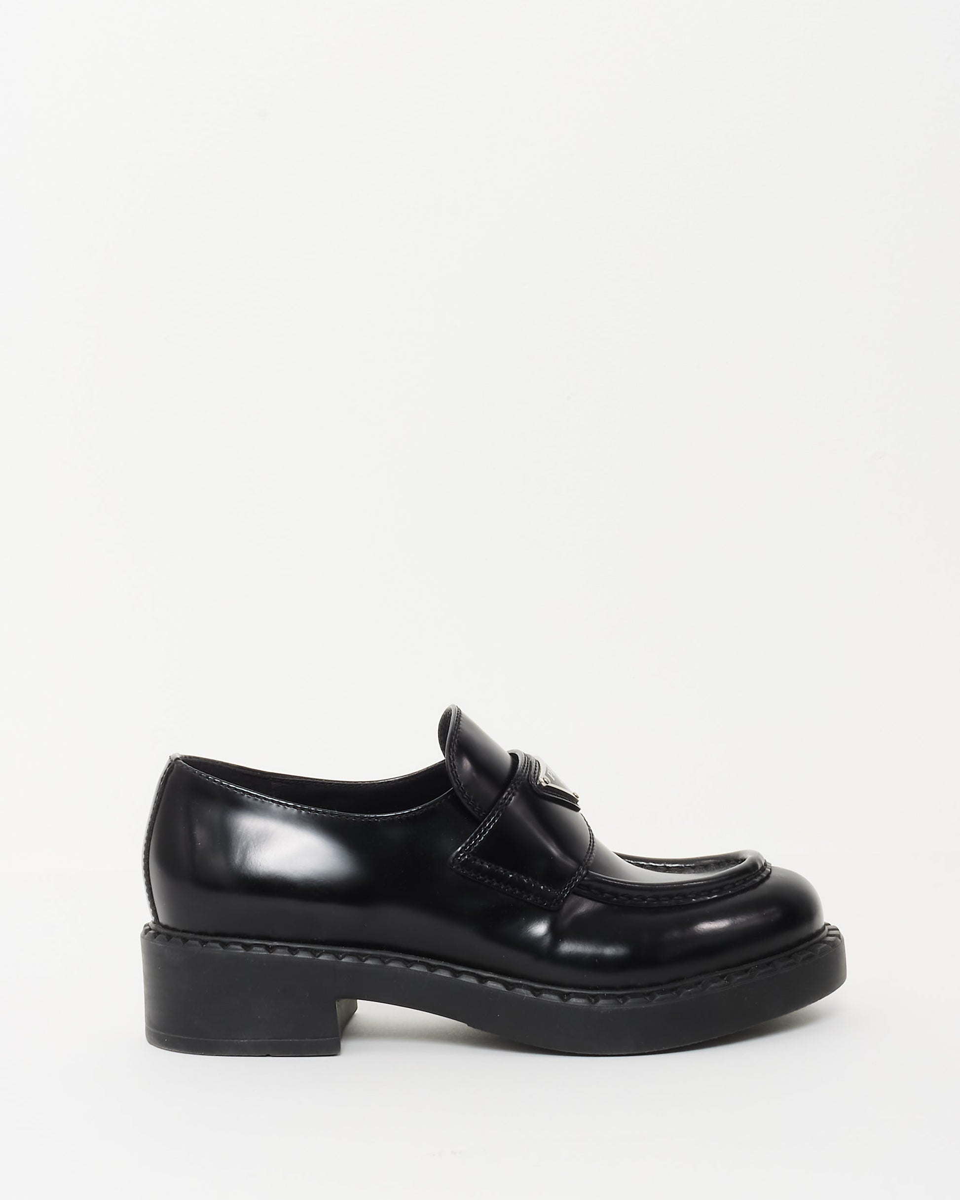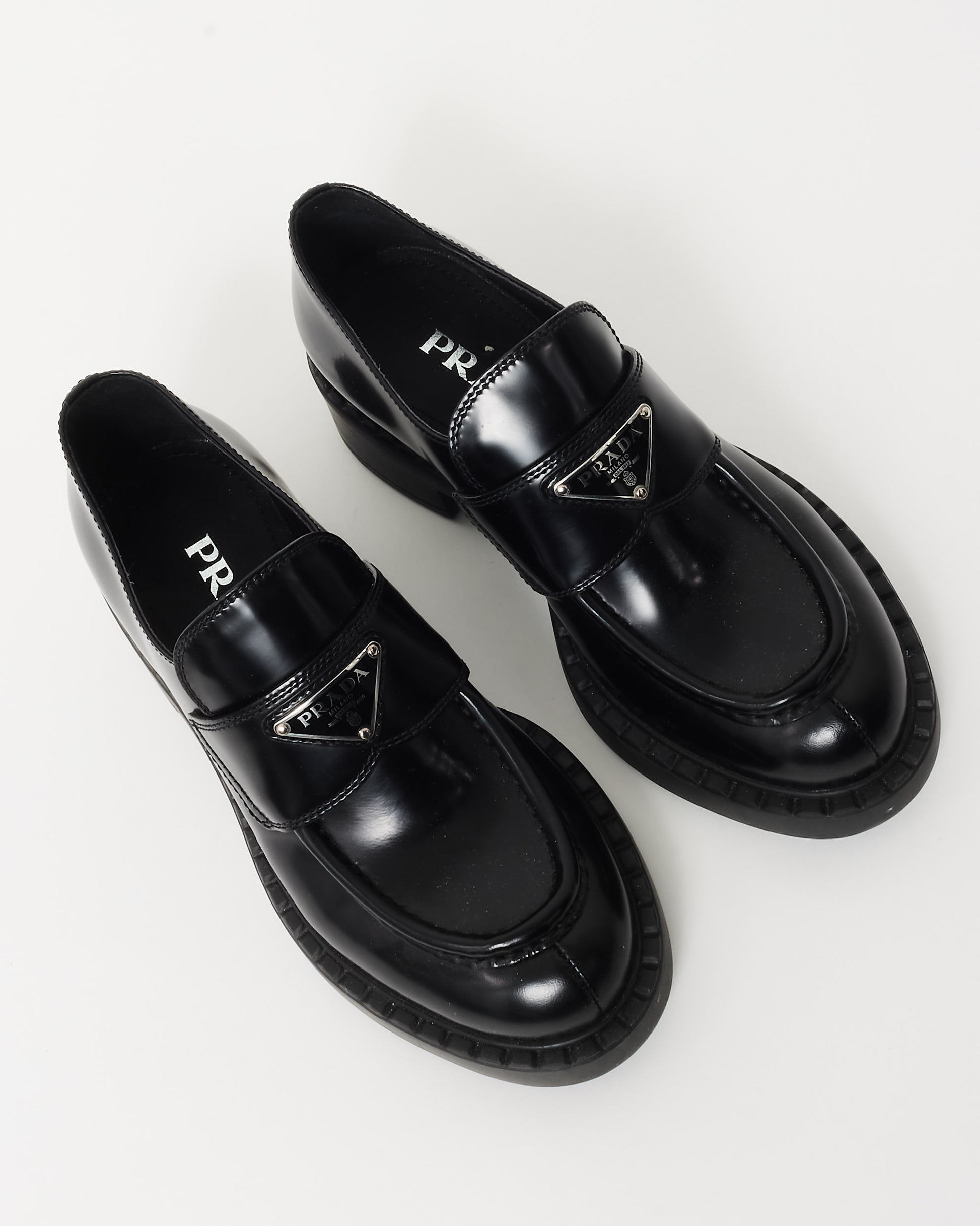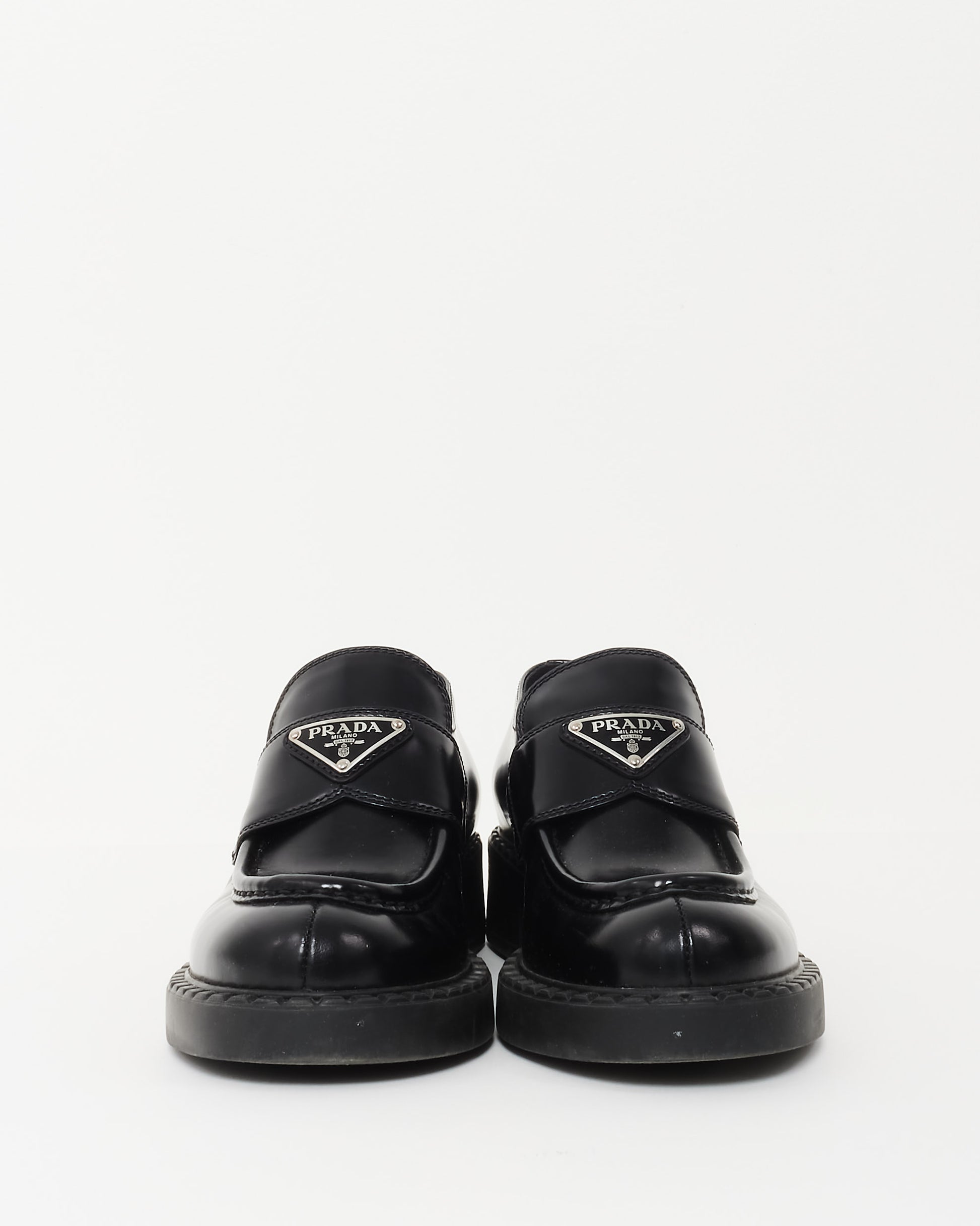 Timelessly sophisticated with a modern edge, the authentic pre-owned Prada Black Brushed Leather Chocolate Loafers offer a sleek take on classic menswear-inspired footwear. Crafted from polished black brushed leather with emphasis on the iconic enamelled triangle logo providing an unmistakable designer finish. The chunky sole adds a contemporary touch. Designed for both comfort and style, these loafers pair effortlessly with tailored trousers, denim, or feminine silhouettes for a chic contrast.