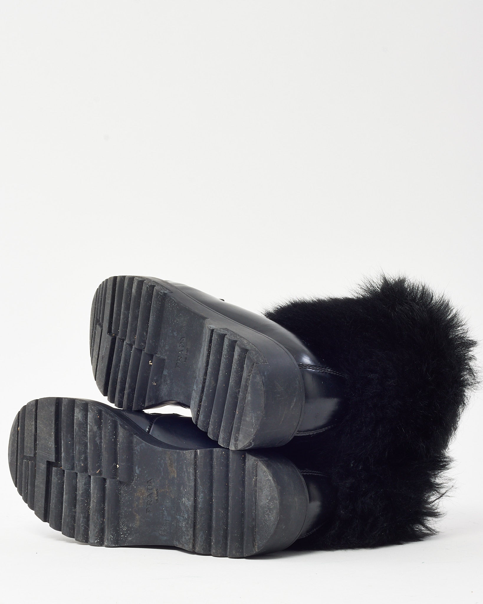 Step into cold-weather style with these pre-loved authentic Prada Combat Boots in size 36, crafted from smooth black leather and lined with plush fur for added warmth and comfort. Designed with a lace-up front, rugged lug sole, and side zipper for easy wear, these boots combine utilitarian edge with luxurious detailing. Perfect for urban winter wear, they offer both durability and bold designer flair.