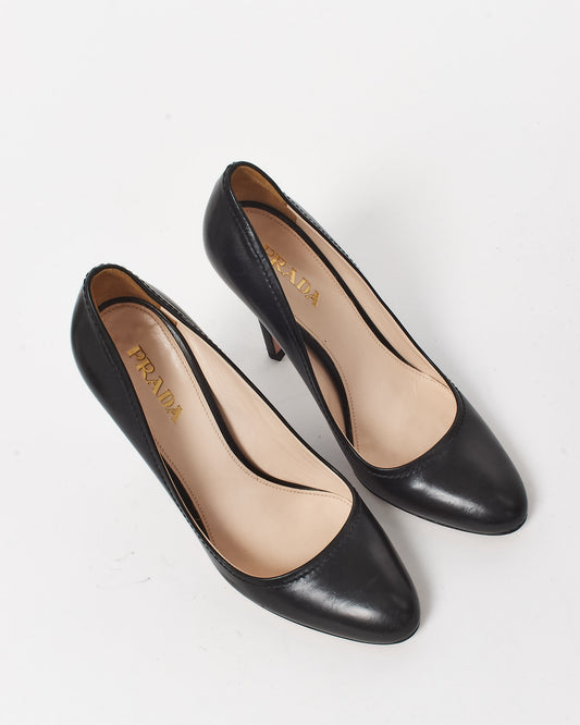 These authentic pre-owned Prada Black Leather Round Toe Pumps are a classic addition to any wardrobe, offering versatility and elegance. Crafted from smooth black leather with a rounded toe, these pumps are perfect for both professional and formal occasions. Their timeless design ensures they remain a staple for years to come. Smooth black leather, slim stiletto heel, round toe with a minimalist silhouette for effortless elegance. Shop pre-owned authentic Prada heels at Retyche.