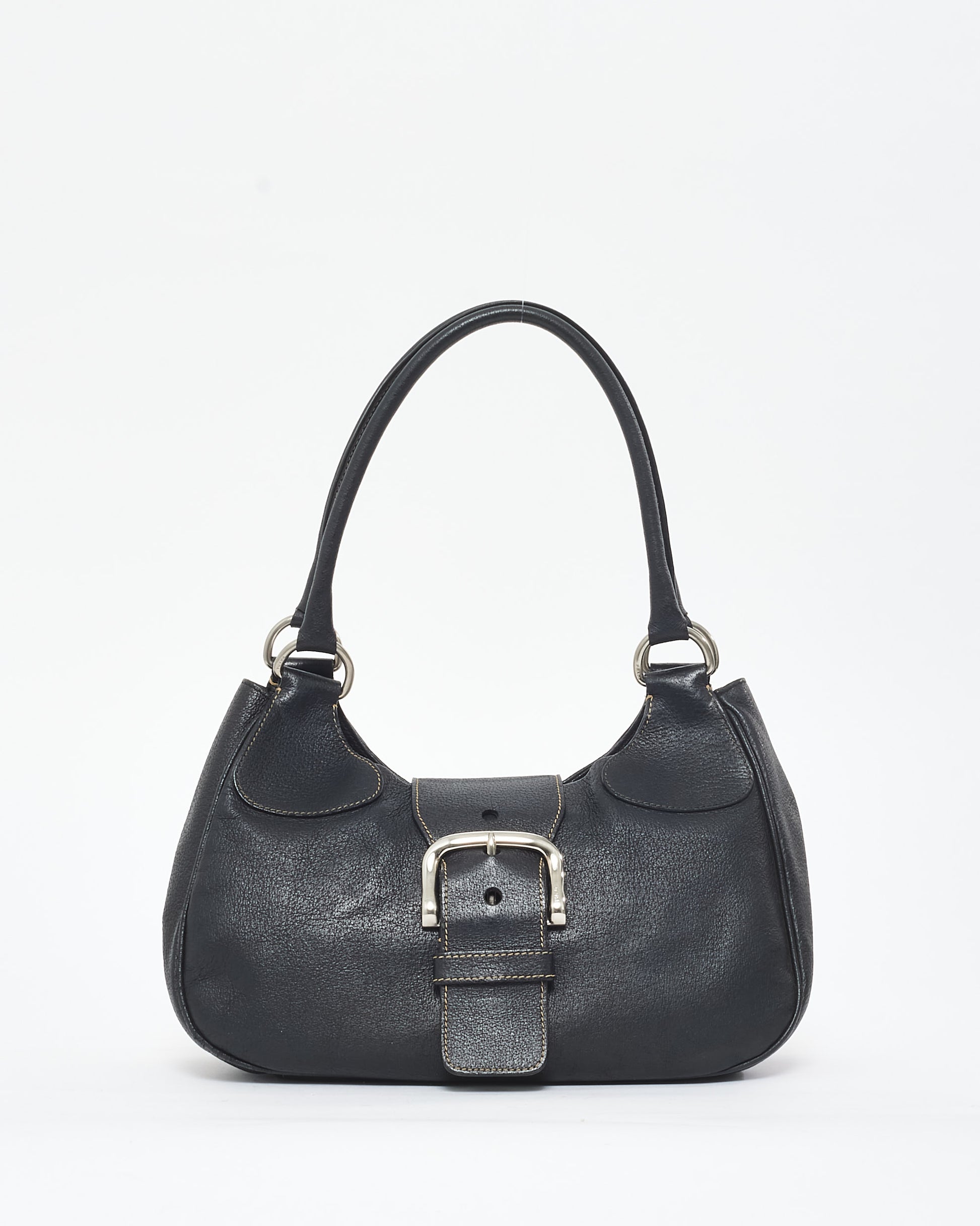 Explore Prada's exquisite collection of handbags, featuring this certified pre-owned Black Leather Wide Buckle Shoulder Bag. Embodying timeless elegance and modern sustainability, each piece, including favorites like this, is authenticated by Retyche. Discover sustainable luxury — shop our current treasures or find inspiration for your next coveted find.