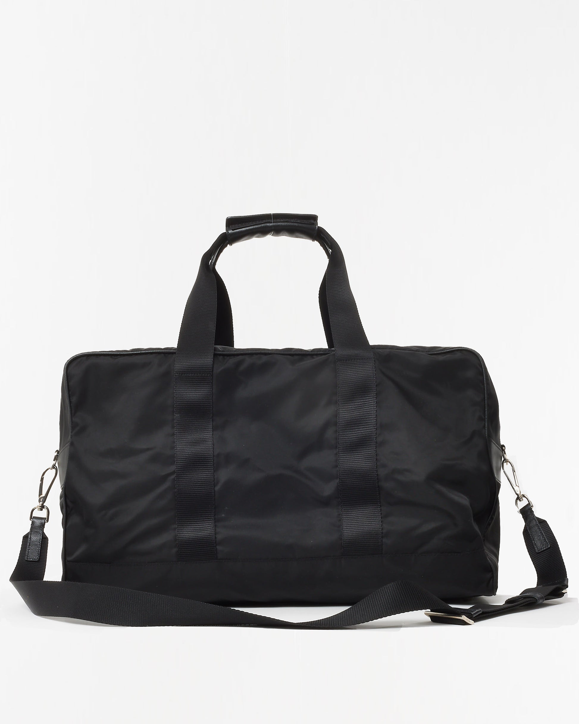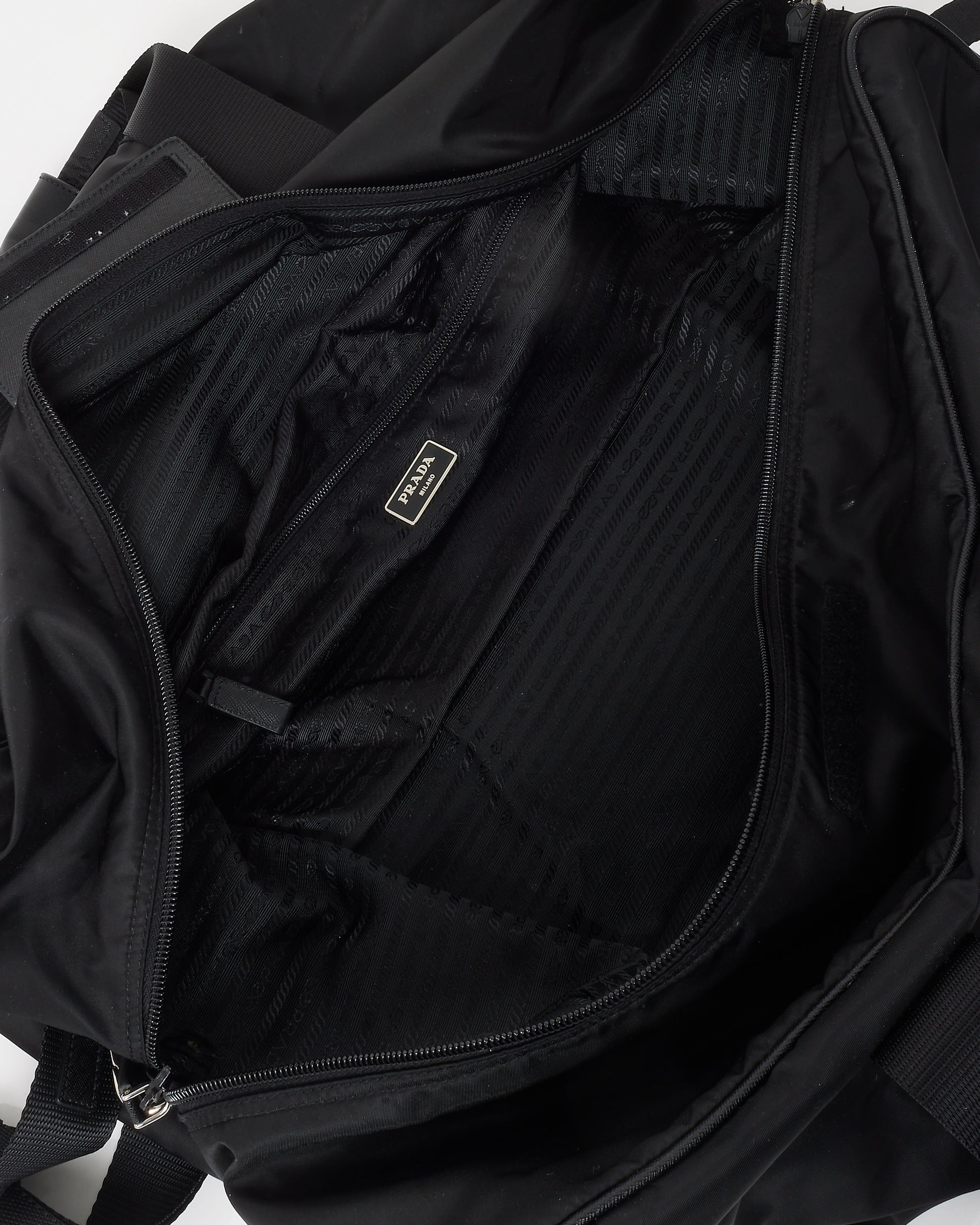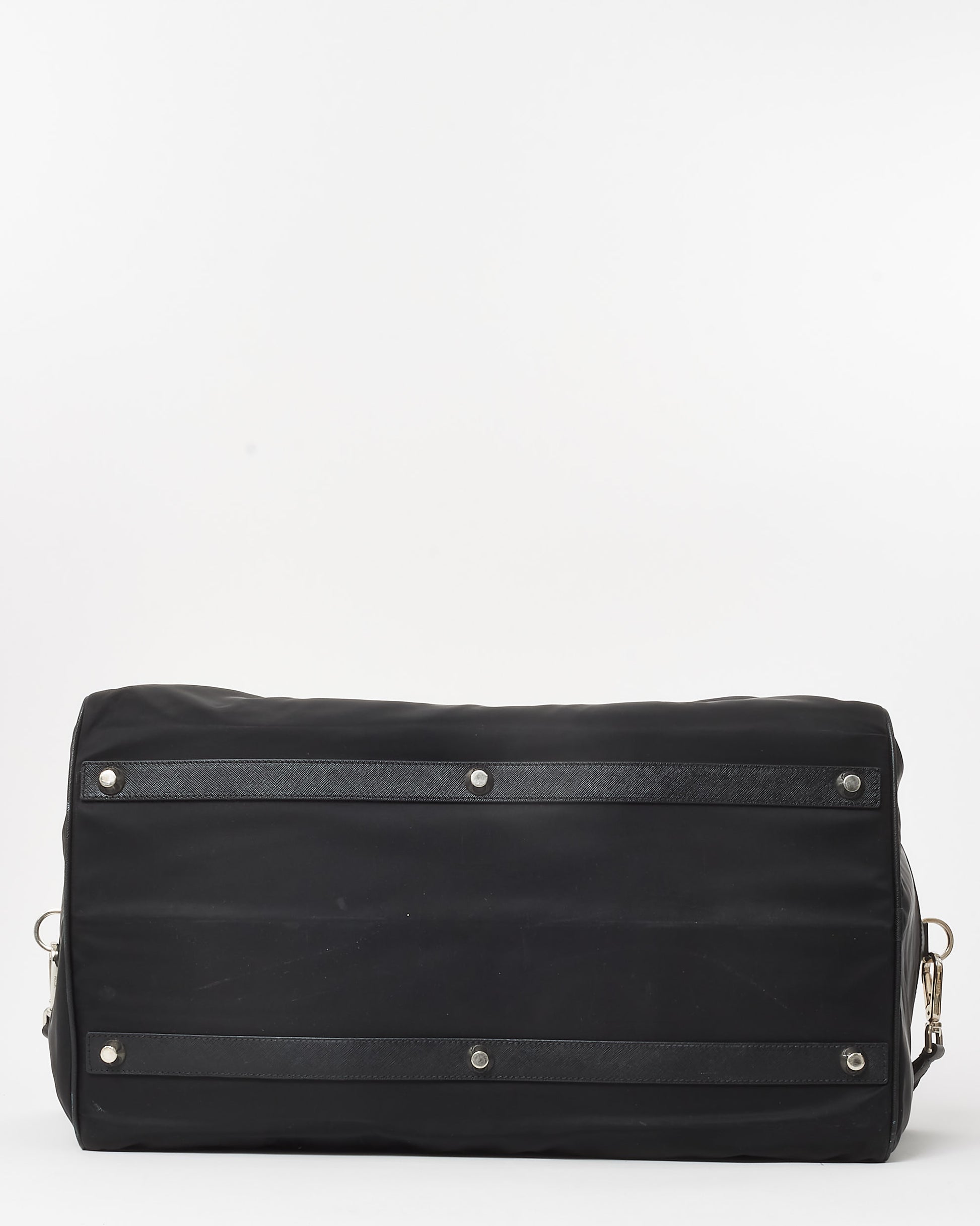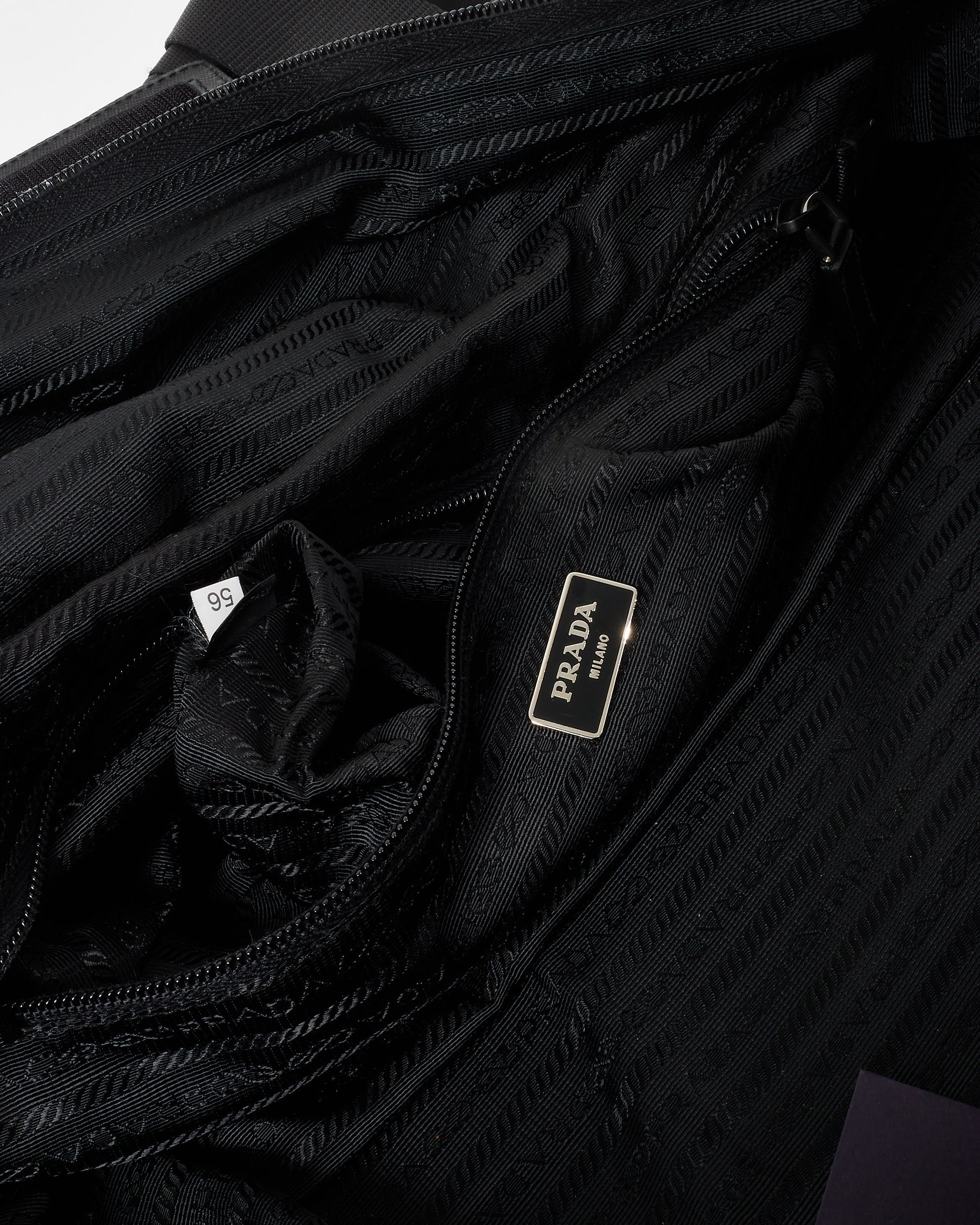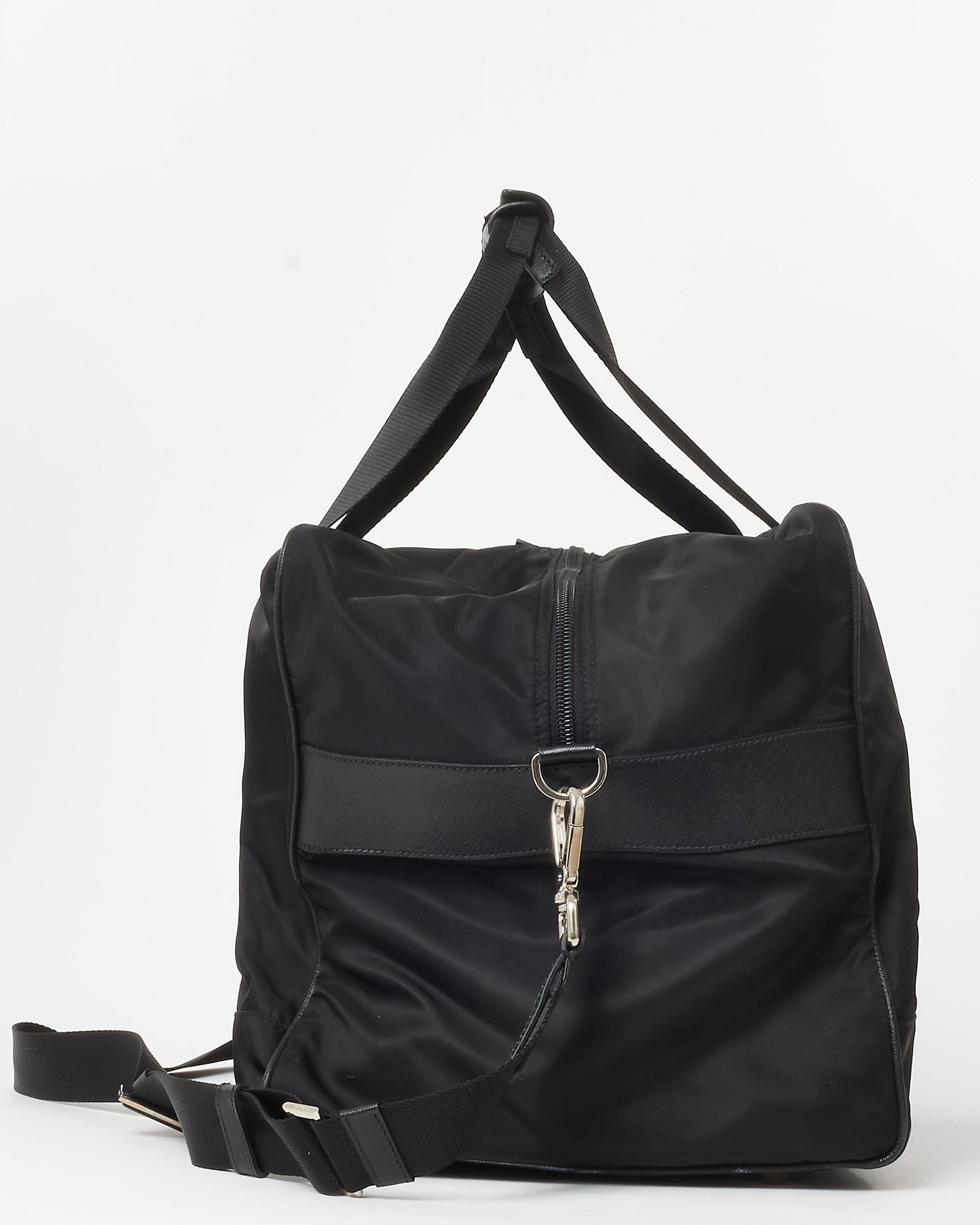 The smooth leather top handles and detachable shoulder strap provide versatile carrying options, while the two-way zip closure ensures secure storage. The roomy interior with multiple pockets offers ample space for essentials, keeping everything organized while traveling. Finished with the iconic Prada triangle logo plaque, this duffle embodies understated luxury.