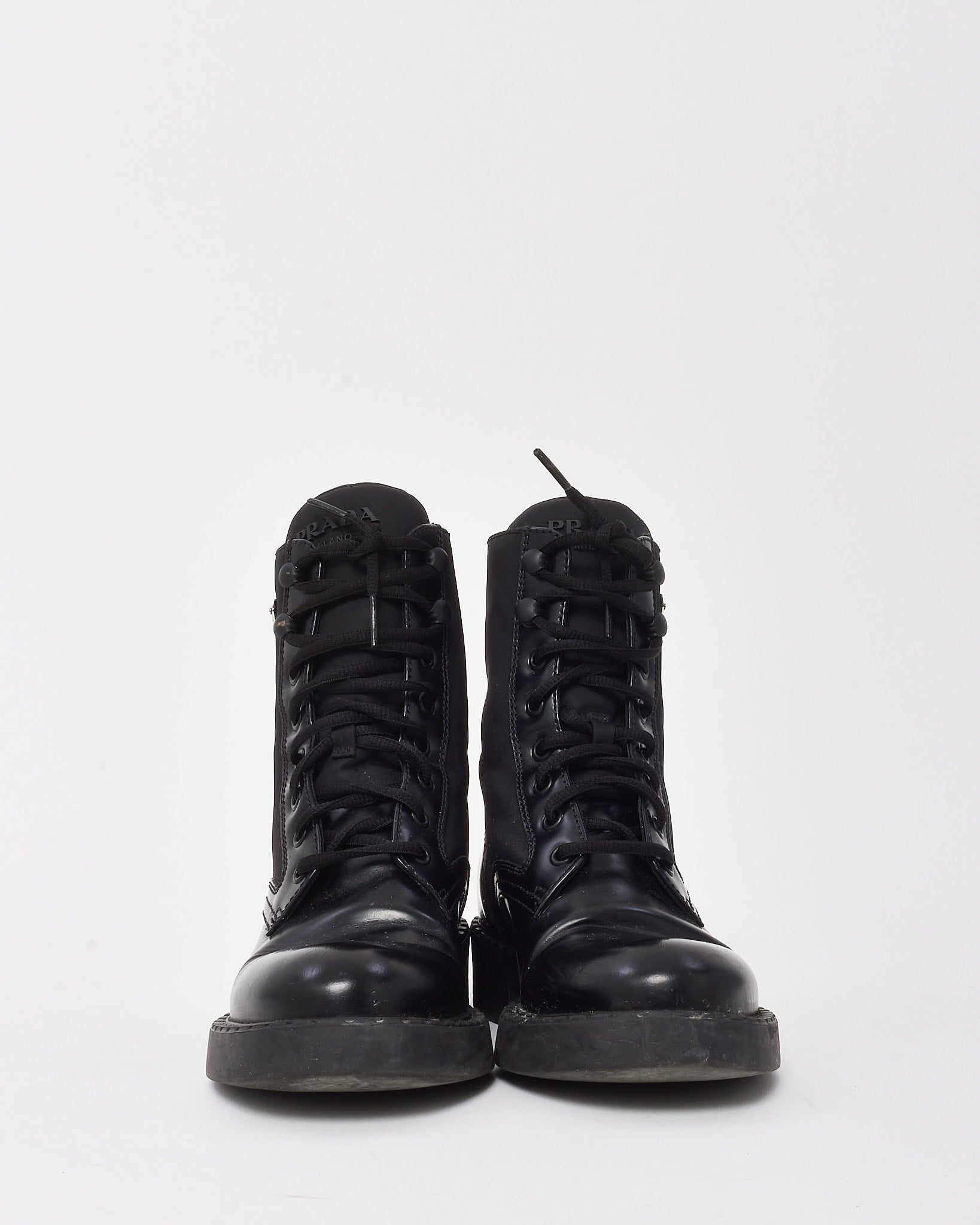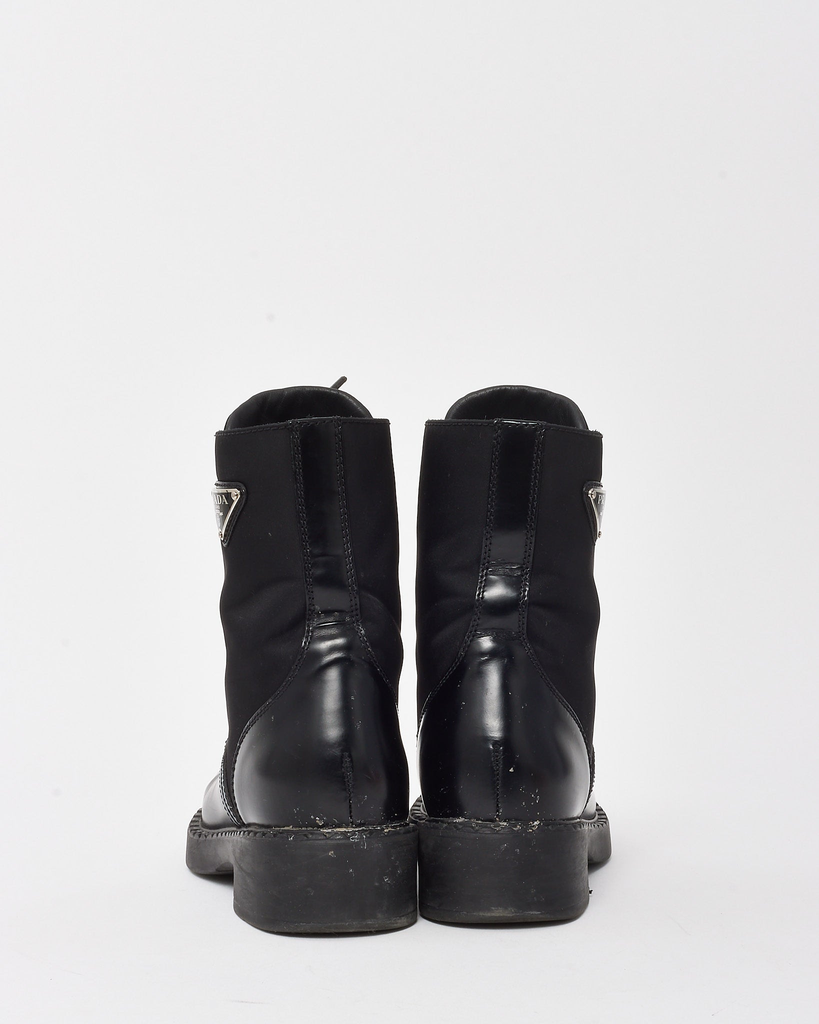 Black Nylon & Leather Triangle Logo Combat Boots - 36