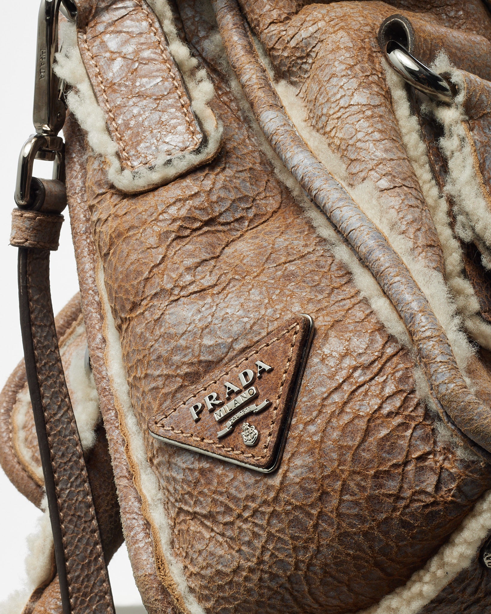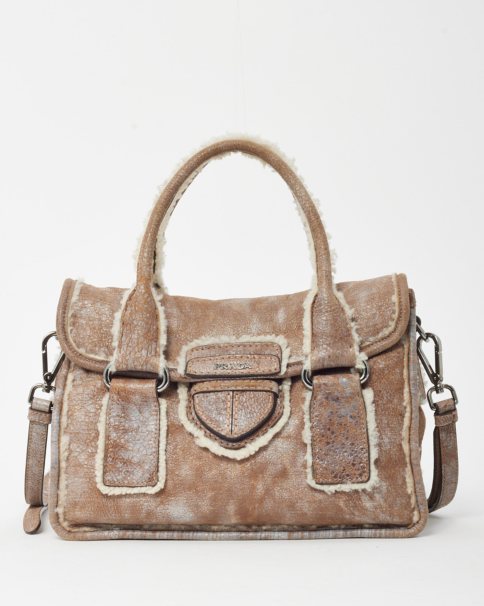 Embrace elevated cold-weather style with this pre-loved authentic Prada 2-way top handle bag, crafted in supple brown suede with luxurious shearling accents. Designed with a structured silhouette, this versatile piece features a secure buckle flap closure, dual top handles, and a removable shoulder strap for hands-free wear. The plush texture, refined leather trim, and iconic Prada detailing make it an effortlessly chic companion for both everyday wear and seasonal travel. A perfect blend of heritage craftsmanship and cozy sophistication.