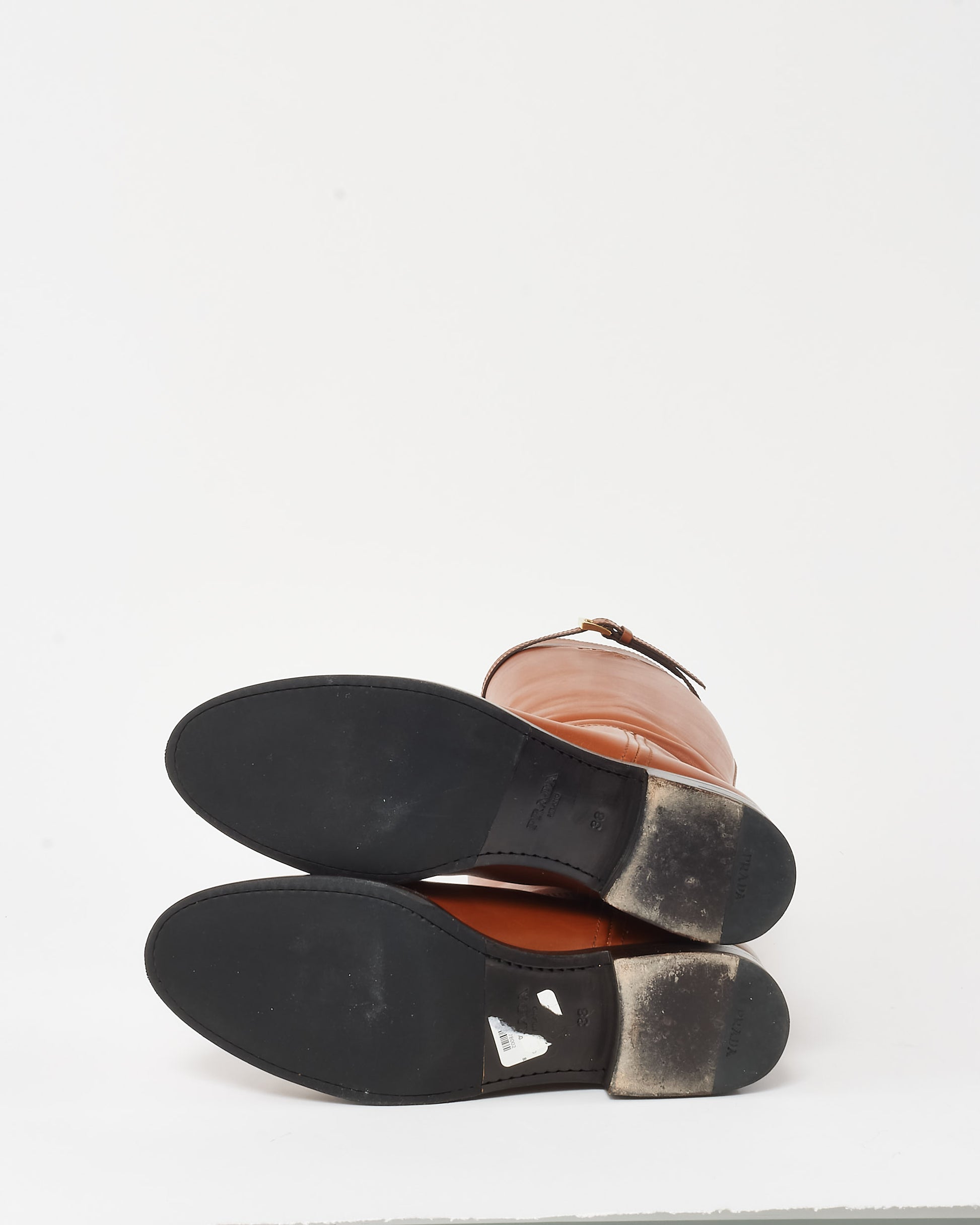 Camel Leather Logo Belted Knee-High Riding Boots - 38