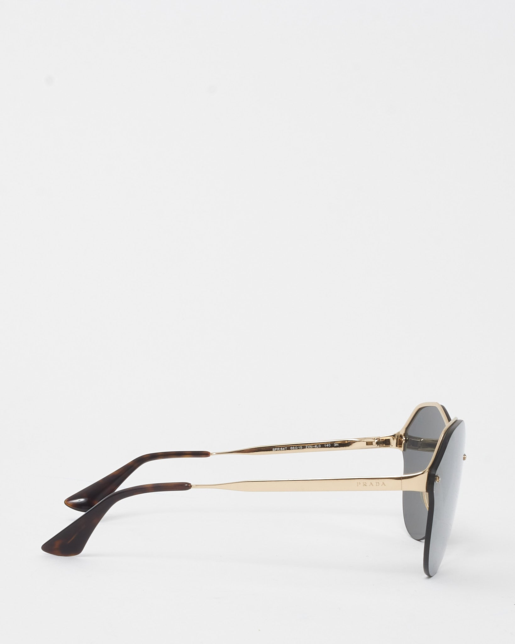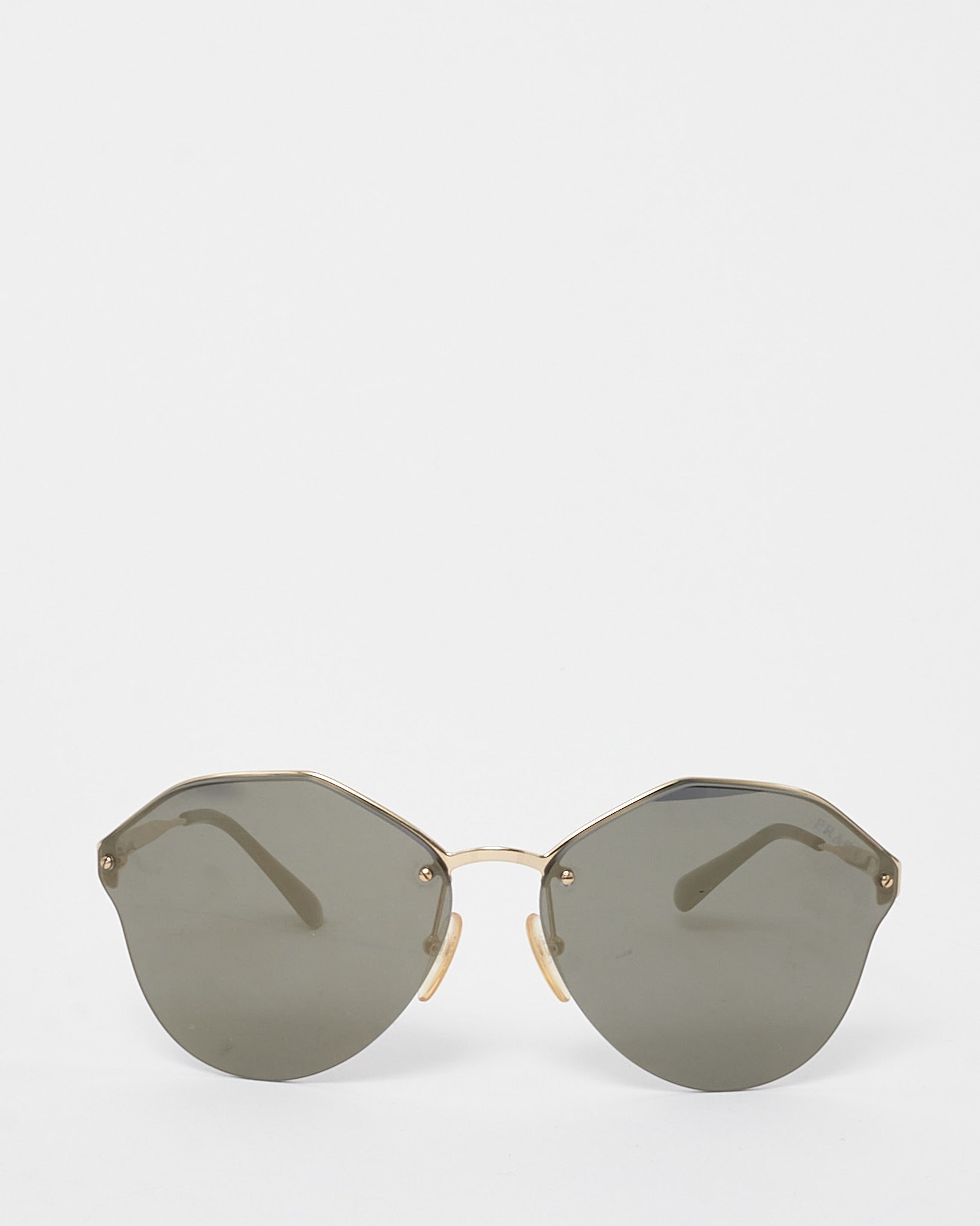 A bold reinterpretation of classic glamour, these pre-loved authentic Prada SPR64T sunglasses command attention with their statement-making silhouette. Featuring oversized gold-tone metal frames and dramatic mirrored lenses, this pair strikes a perfect balance between futuristic edge and timeless luxury. The cut-out lens design offers architectural interest, while Prada’s discreet branding at the temples lends a refined finish. Designed to elevate any warm-weather ensemble, these sunglasses are a must-have for lovers of standout accessories with high-fashion appeal.