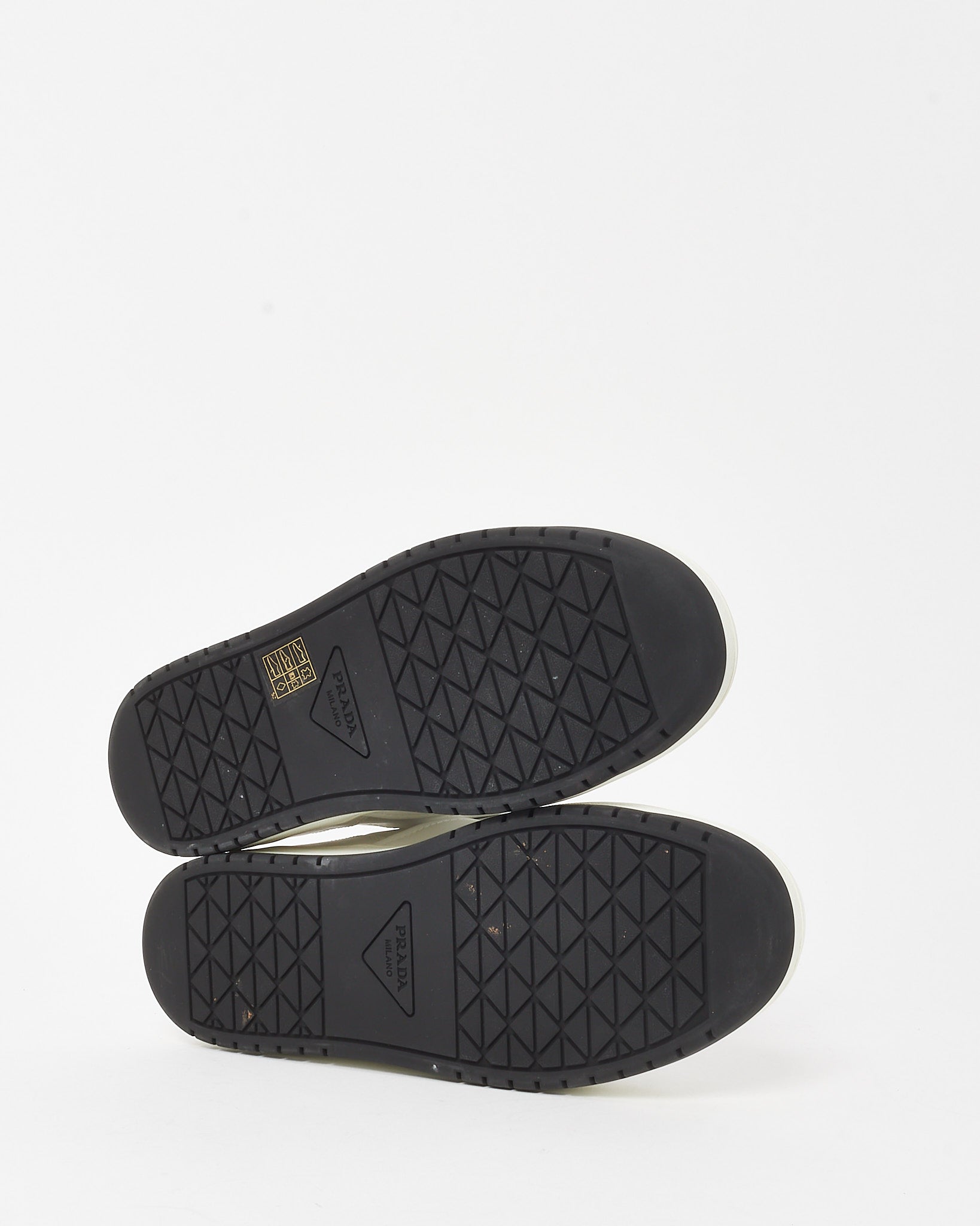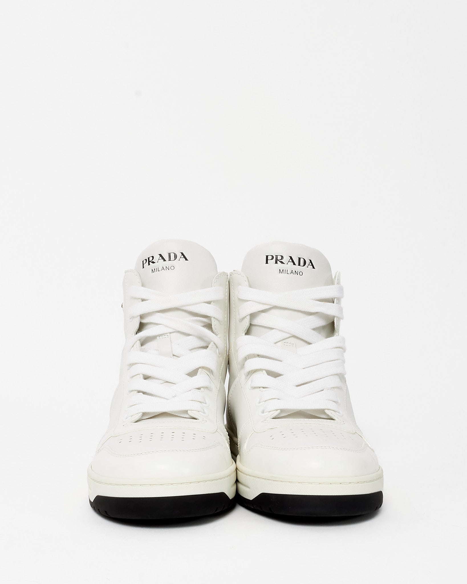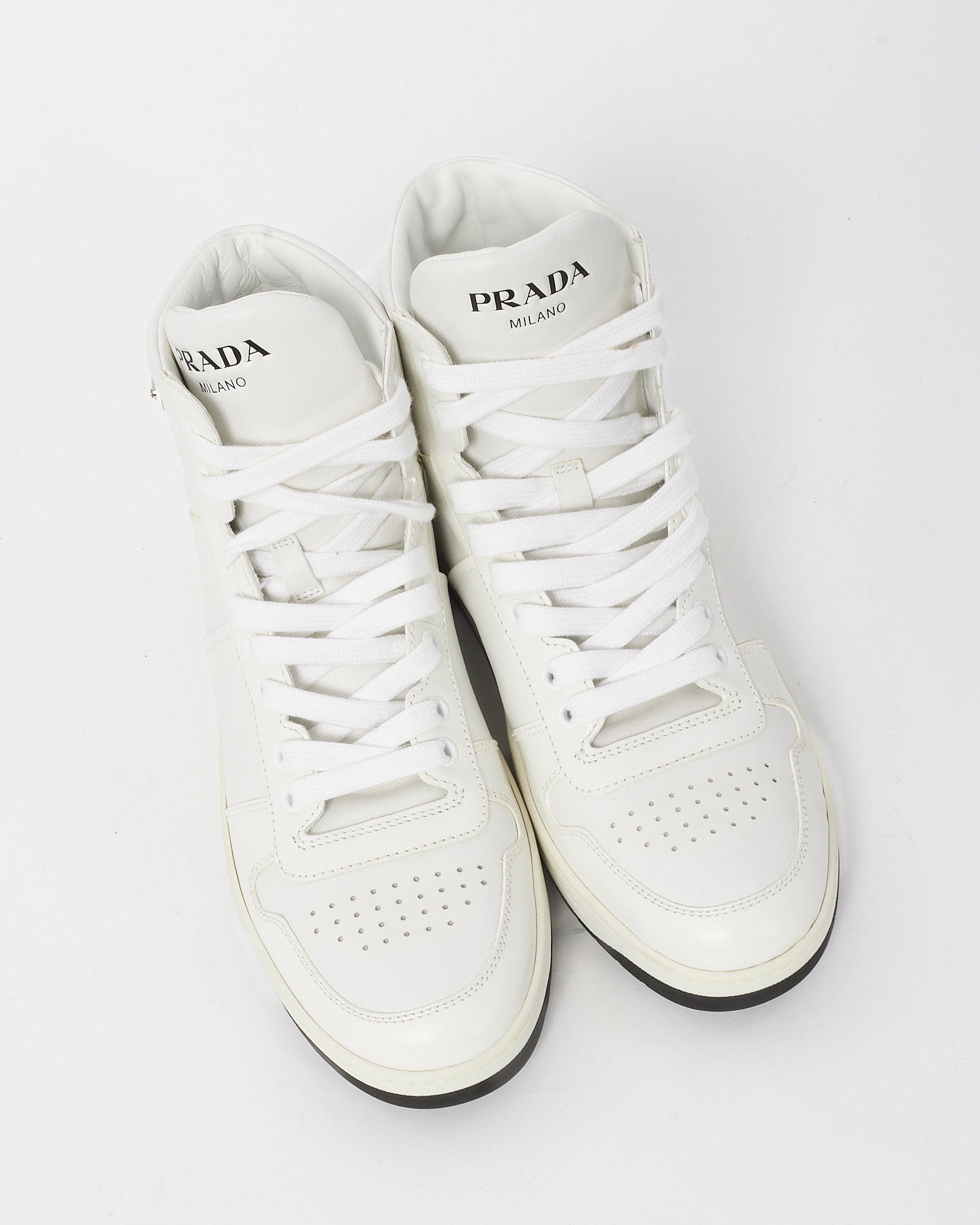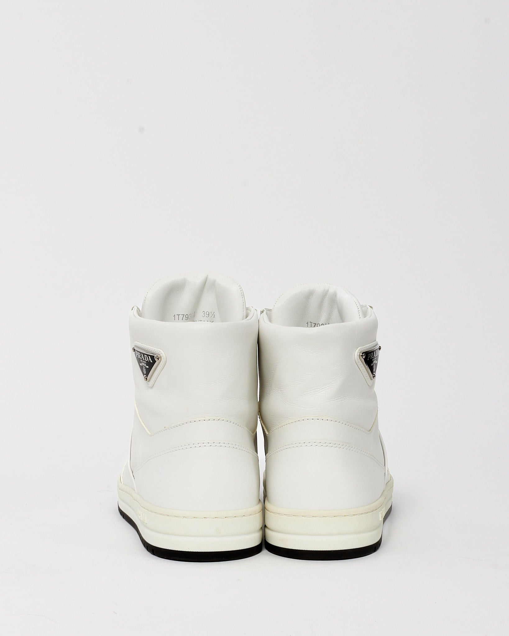 A refined take on streetwear essentials, these pre-loved authentic Prada high-top sneakers are crafted from smooth white leather and detailed with tonal stitching and the iconic logo patch. Featuring a sleek silhouette with a rubber sole and padded collar for comfort, these minimalist kicks blend luxury with versatility. Perfect for elevating everyday outfits with clean, contemporary edge. A must-have addition to any modern wardrobe.