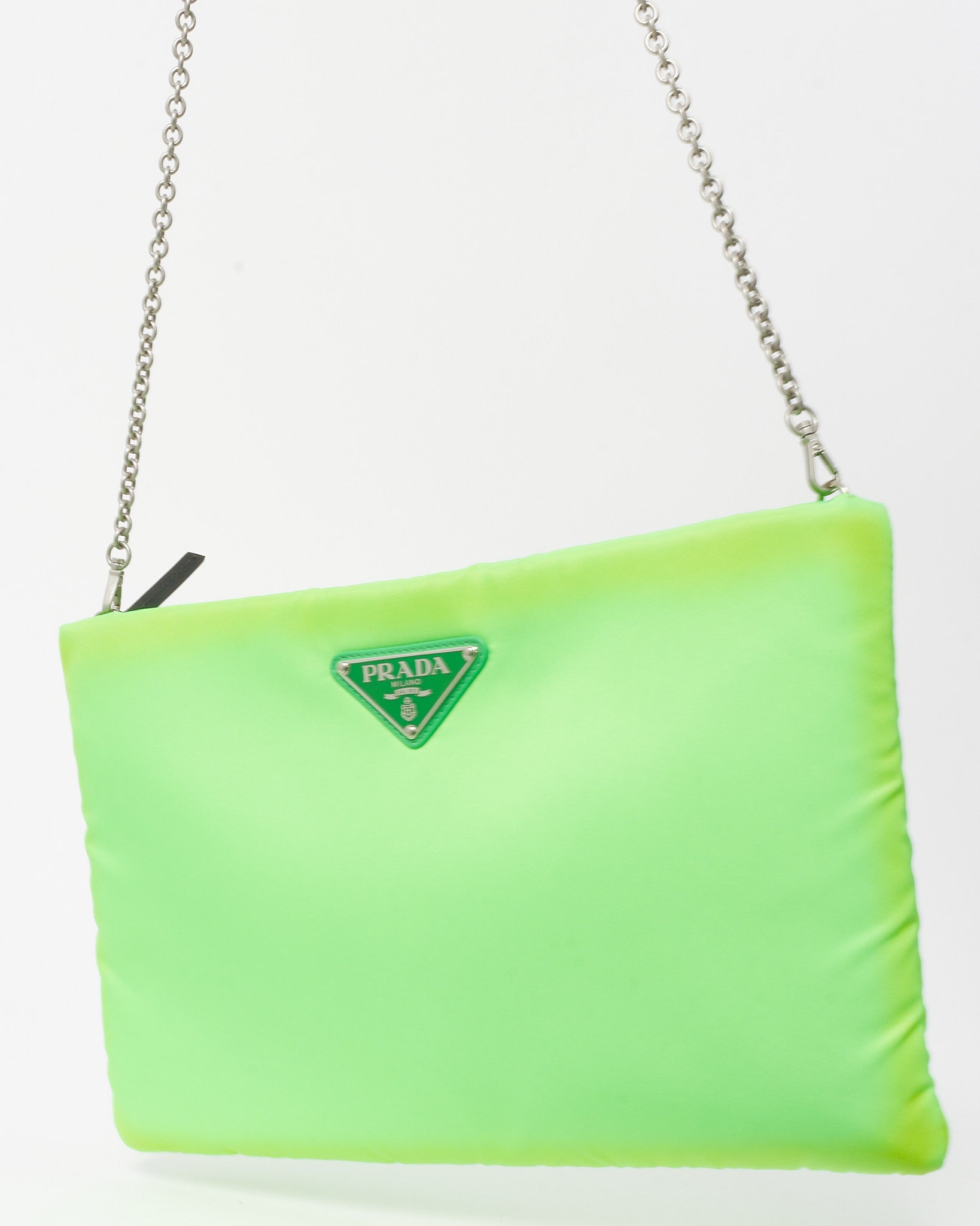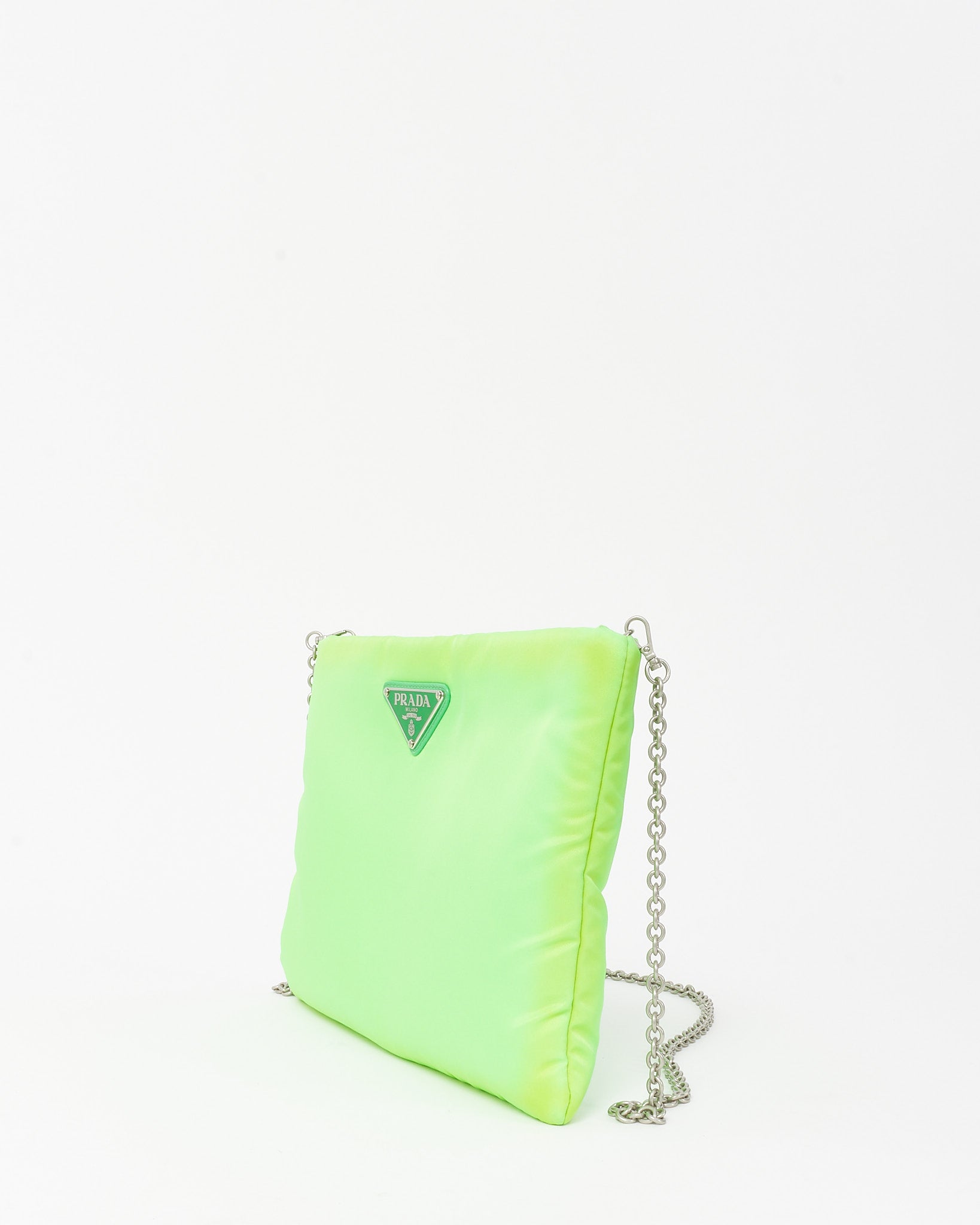 A modern pop of color meets iconic design in this pre-loved authentic Prada padded pouch, crafted in vibrant neon green nylon. Accented with the signature enamel triangle logo, this compact silhouette features a detachable chain strap for versatile wear as a clutch or shoulder bag. Both playful and practical, it’s the perfect bold accent to elevate your everyday or travel essentials.