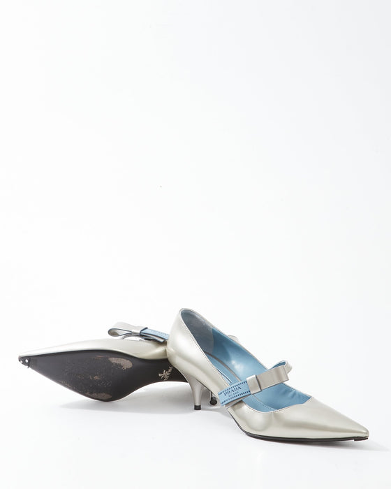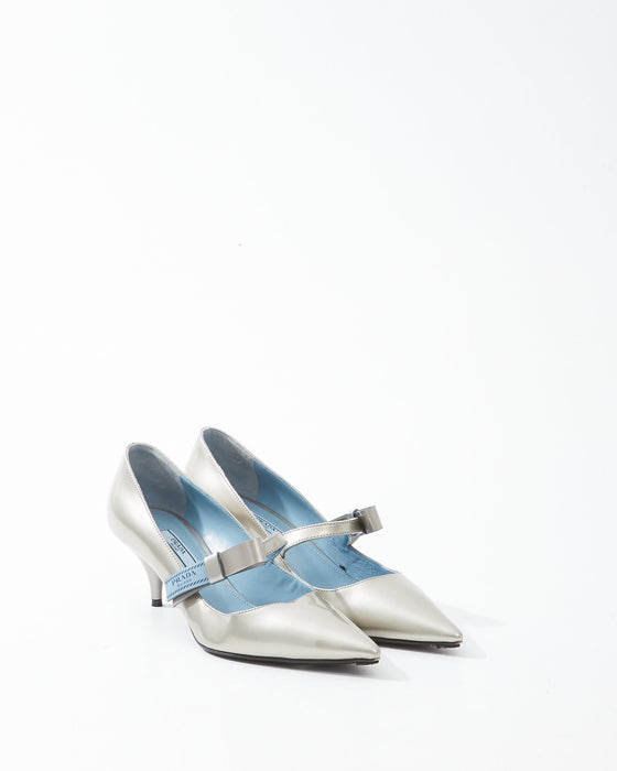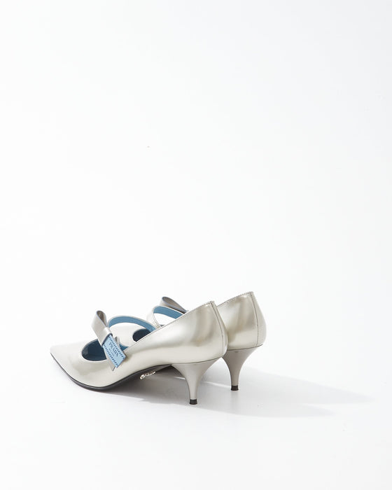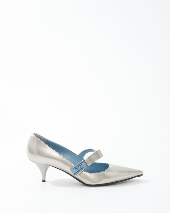 Silver Patent Leather Logo Strap Kitten Heel - 39