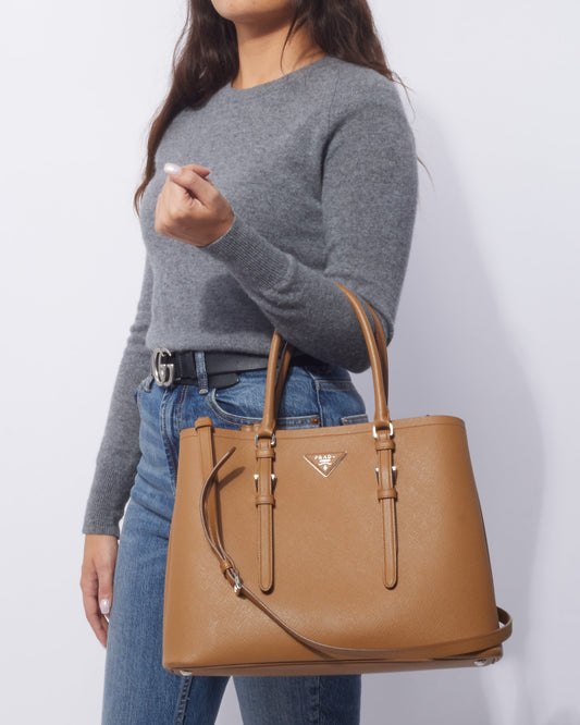 Tan Saffiano Leather Double Medium Convertible Tote Bag