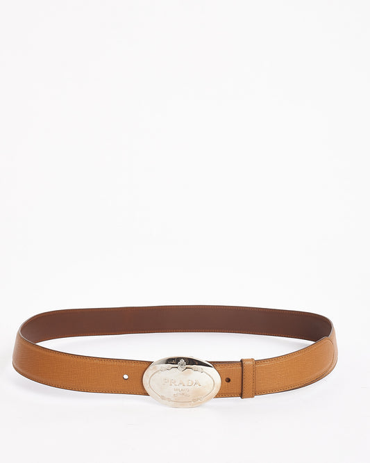 Tan Saffiano Leather with Silver Oval Savoia Logo Buckle Belt 38/95