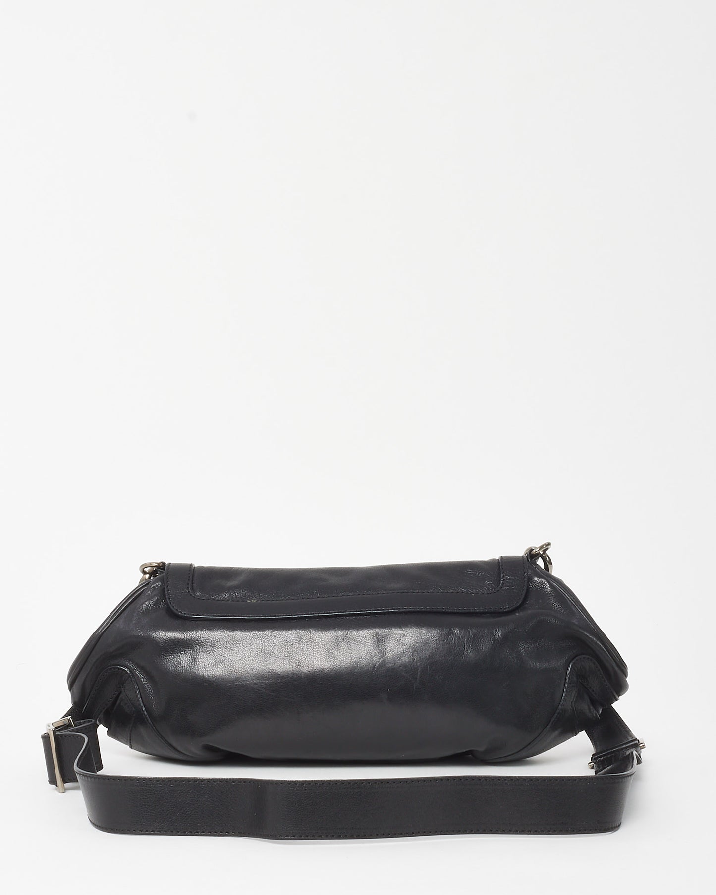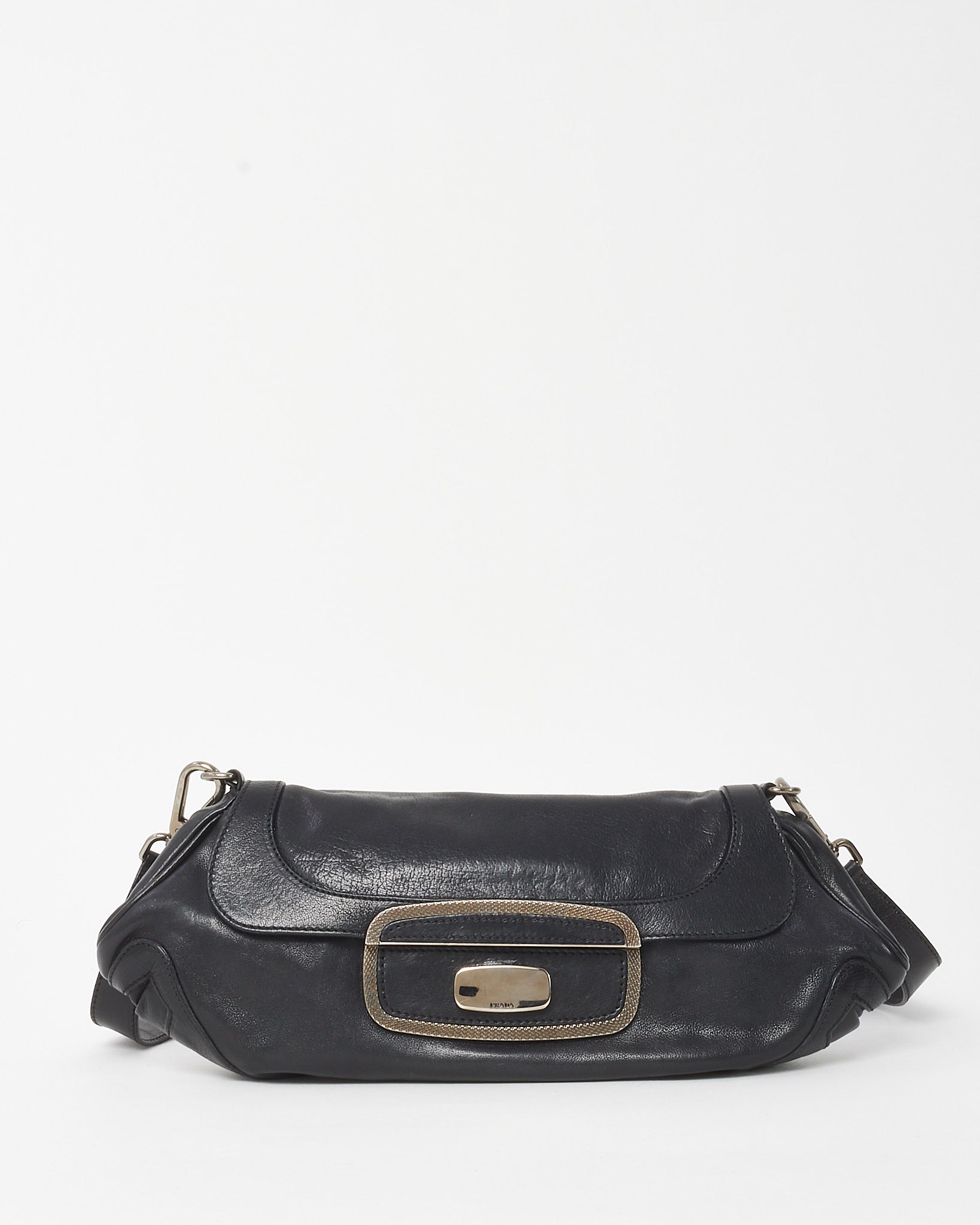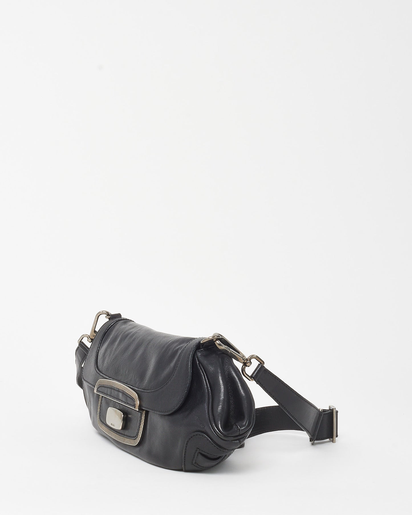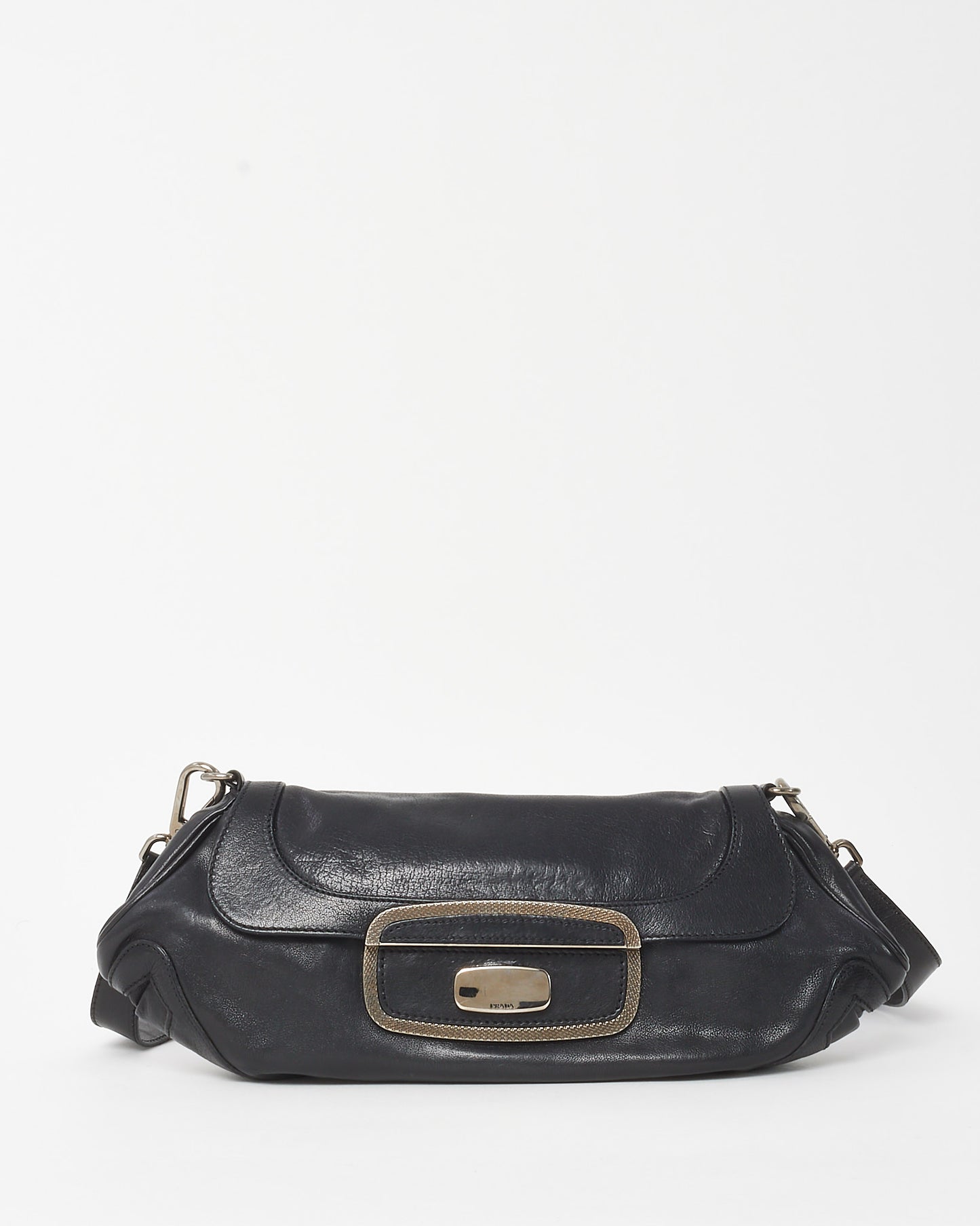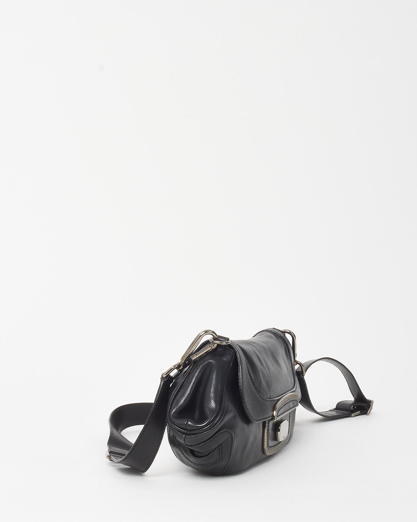 Timeless and utilitarian, this pre-owned authentic Prada Skipper Crossbody Bag is crafted from rich black buffalo leather, prized for its durability and natural grain. The structured silhouette features a front flap with buckle closure, an adjustable shoulder strap, and silver-tone hardware for a classic finish.