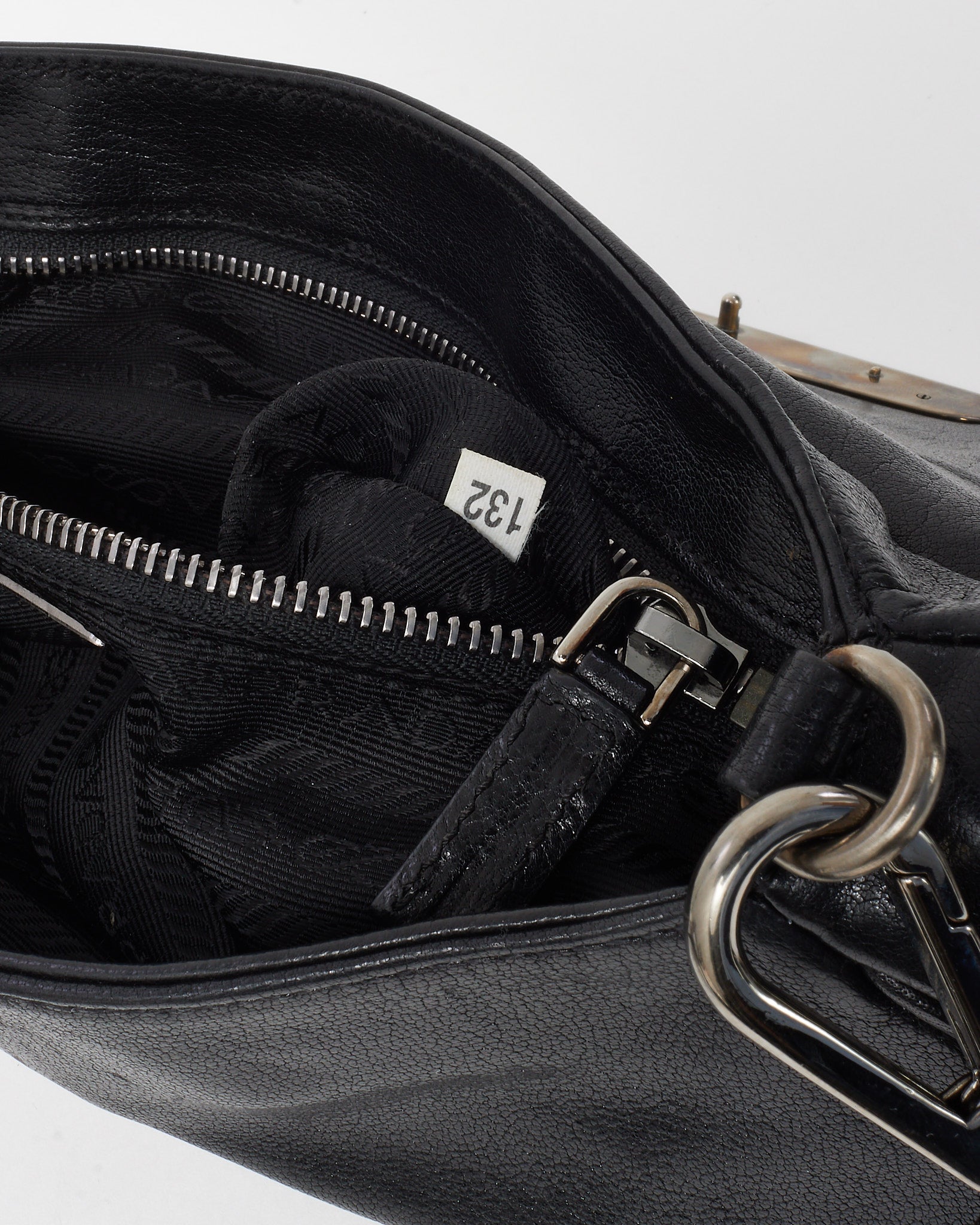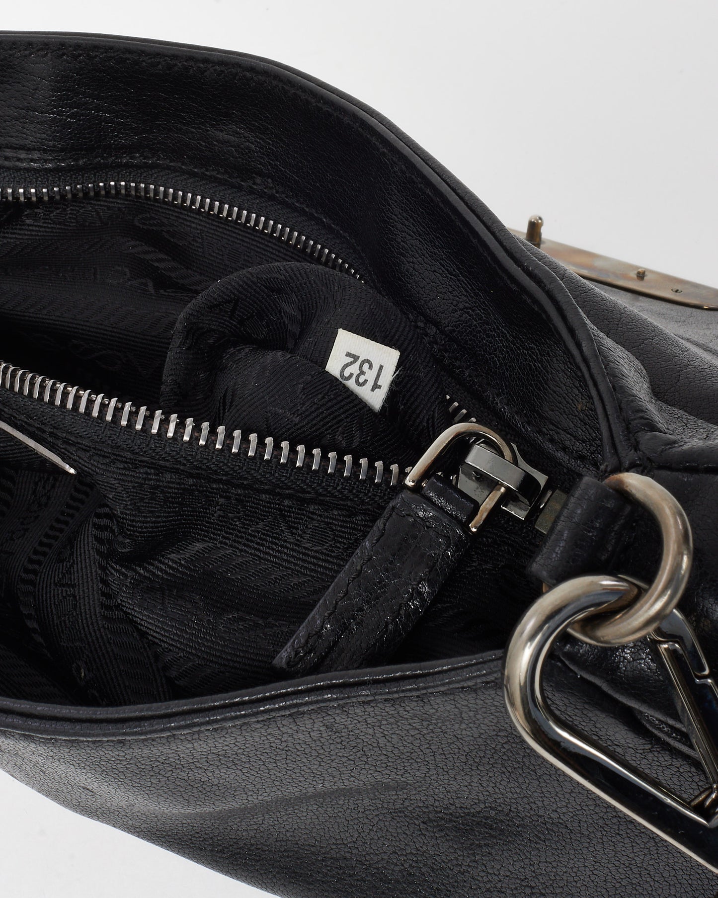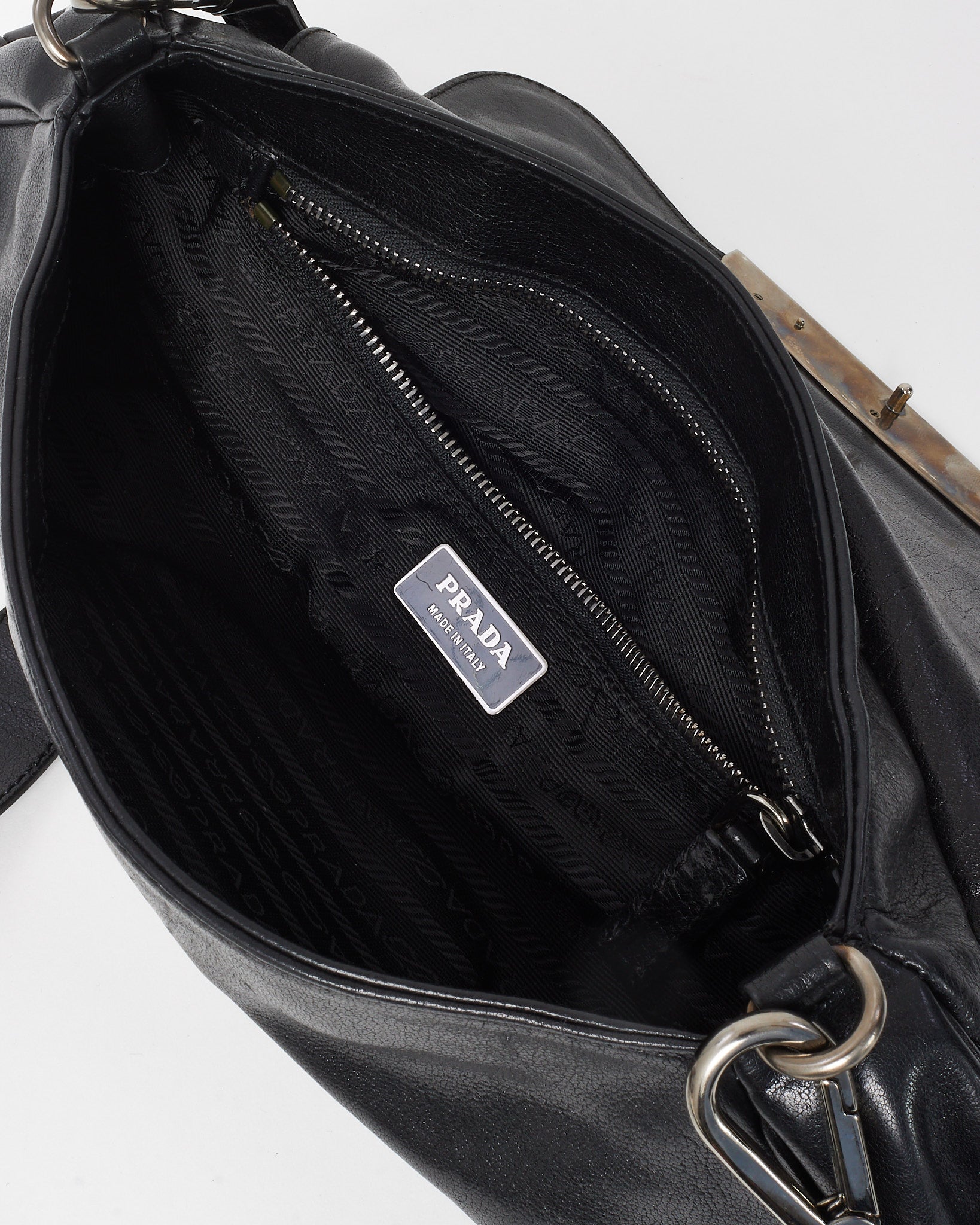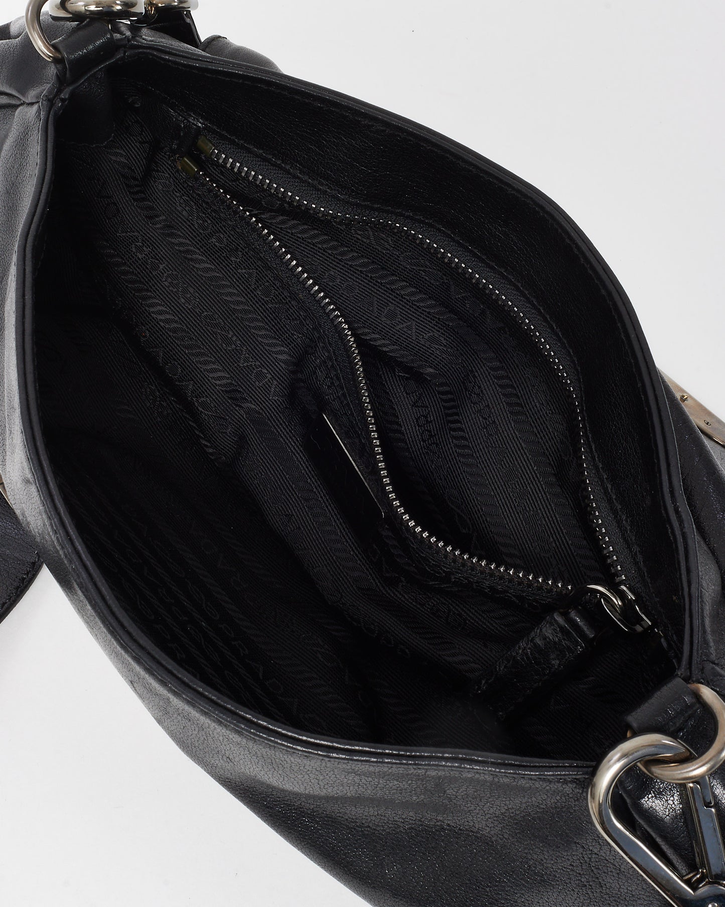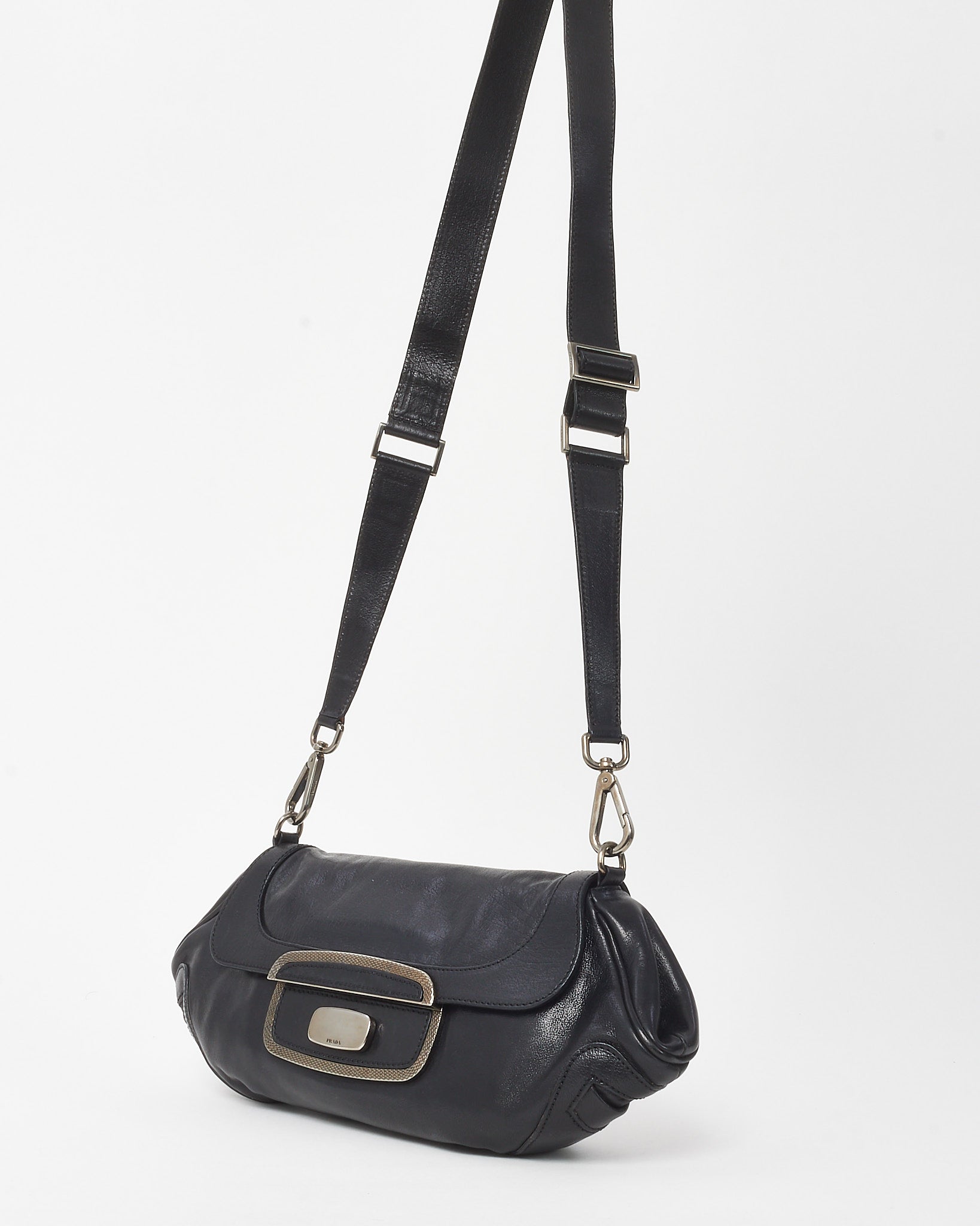 Timeless and utilitarian, this pre-owned authentic Prada Skipper Crossbody Bag is crafted from rich black buffalo leather, prized for its durability and natural grain. The structured silhouette features a front flap with buckle closure, an adjustable shoulder strap, and silver-tone hardware for a classic finish.