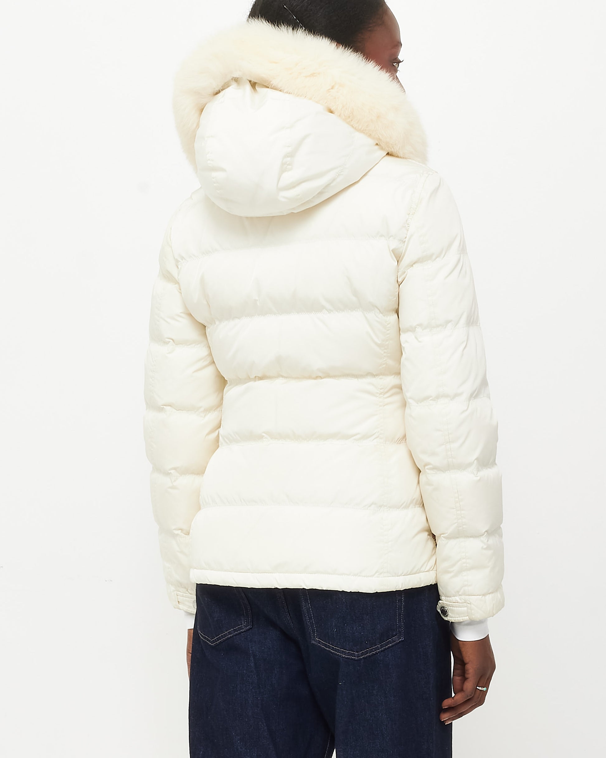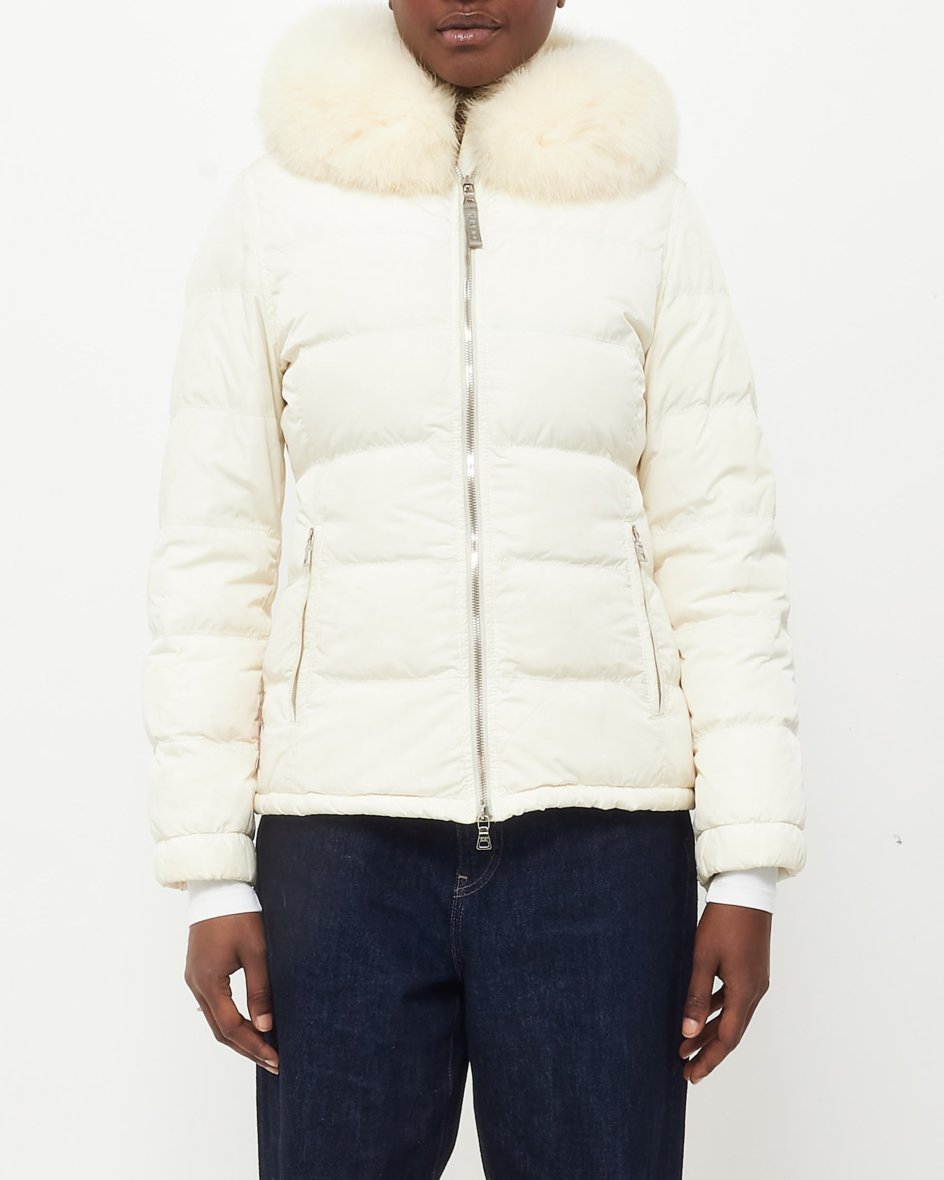 Conquer the slopes in style with this authentic pre-owned Prada White Down & Fur Hood Ski Jacket, a luxurious blend of performance and sophistication. Crafted from premium materials, this jacket features a sleek white design with plush down filling for exceptional warmth, ensuring comfort in even the coldest conditions.